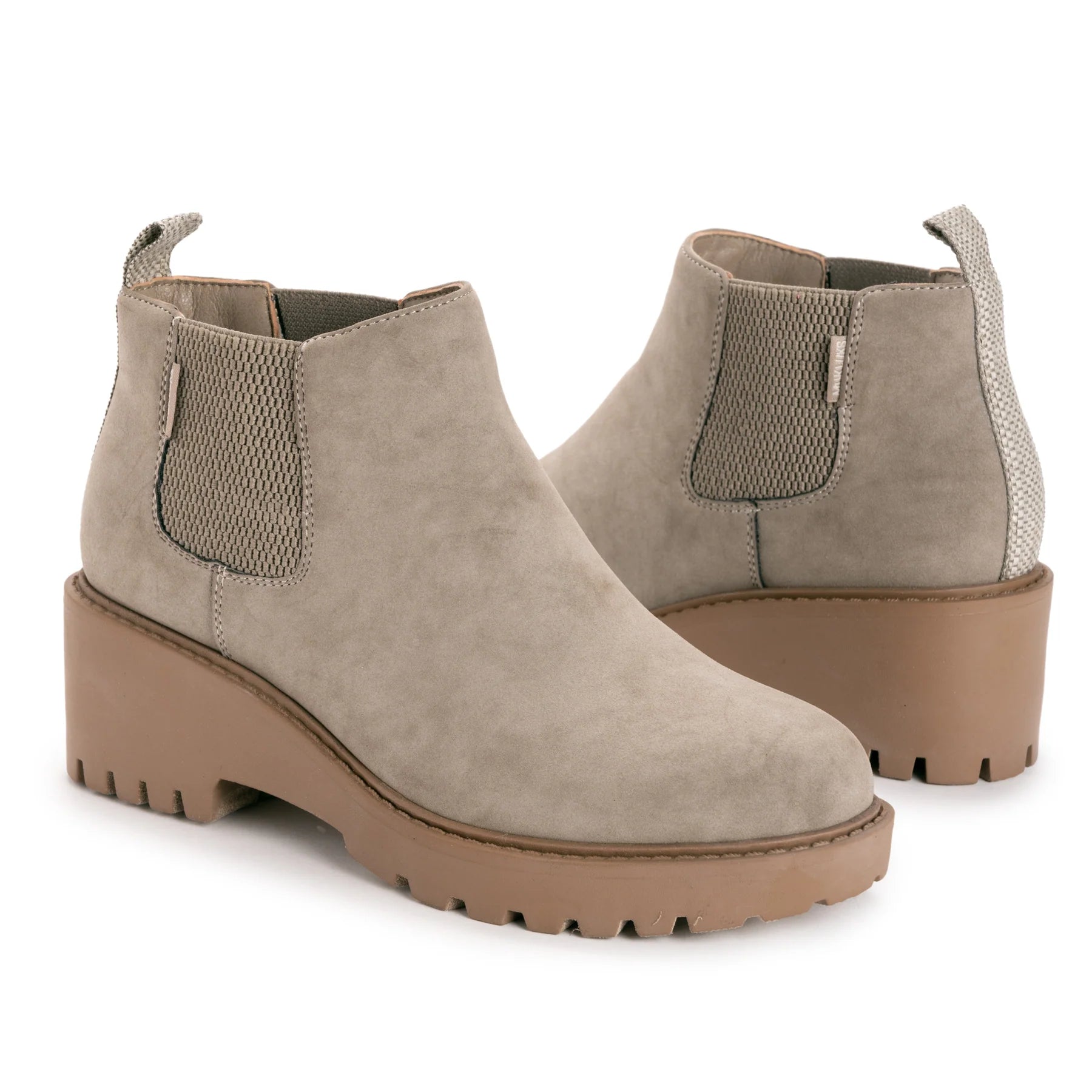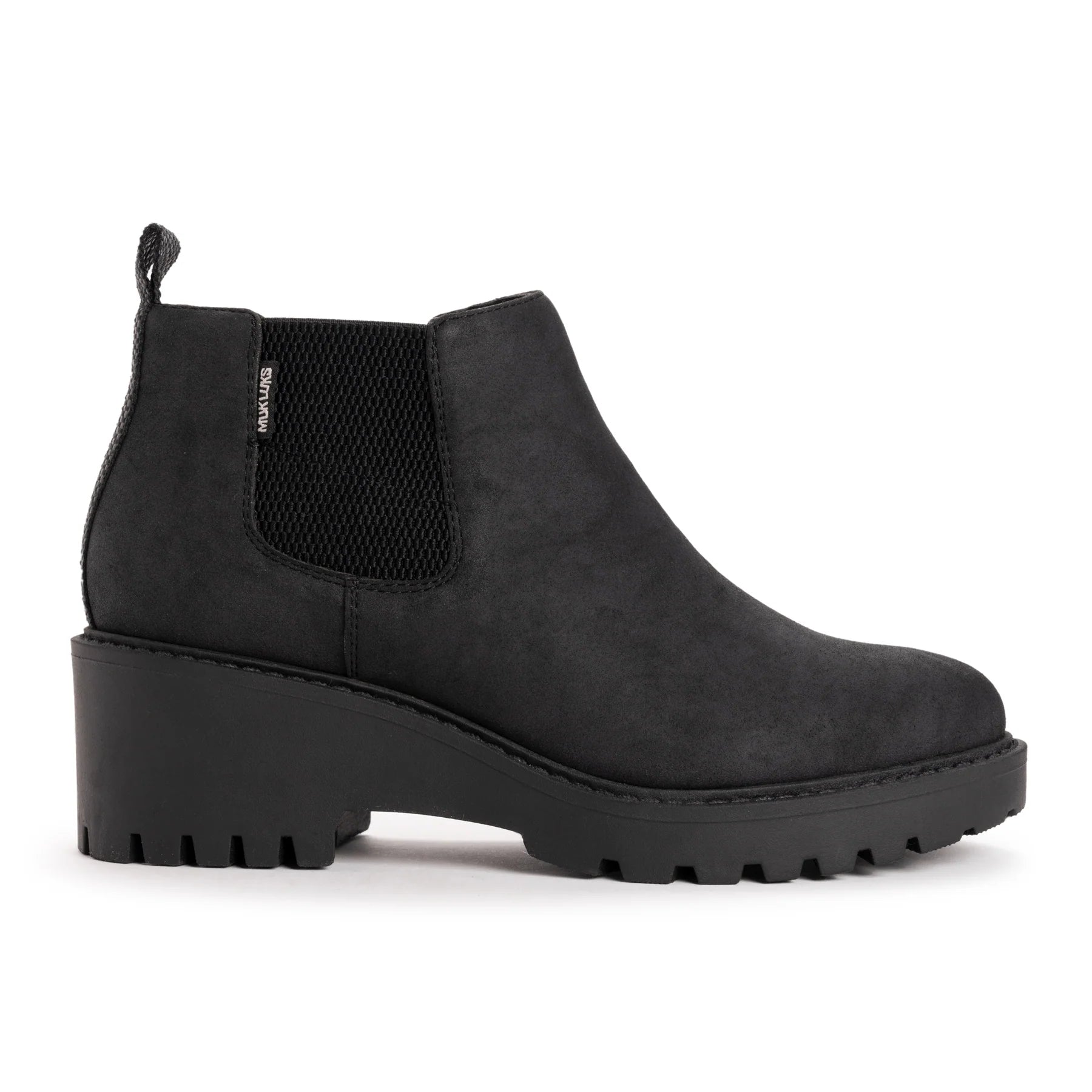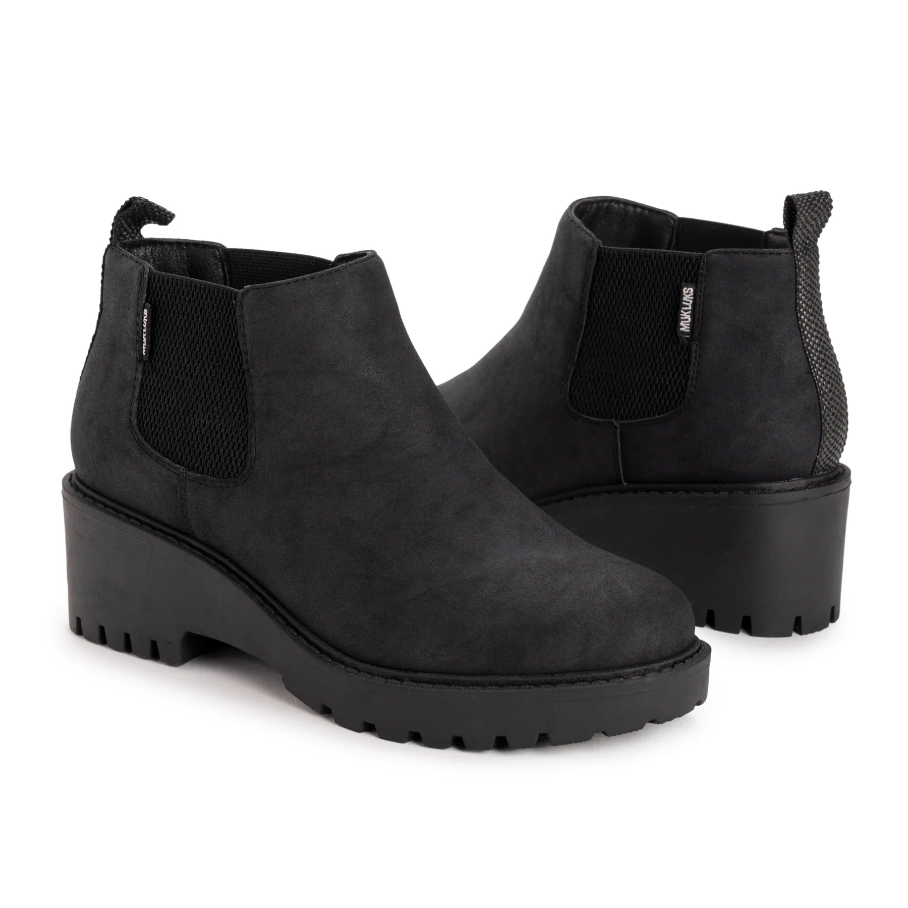 The wedge heel and lug sole of the Chelsea-inspired MUK LUKS Women's Francis Boot are just the begining. Slide these on with the textured, patterned back tab and side insets to discover our signature Muk Luxe lining. Spot clean, no bleach, and lay flat to dry.