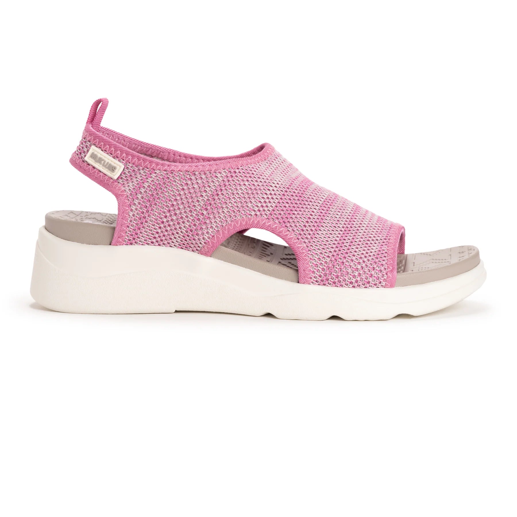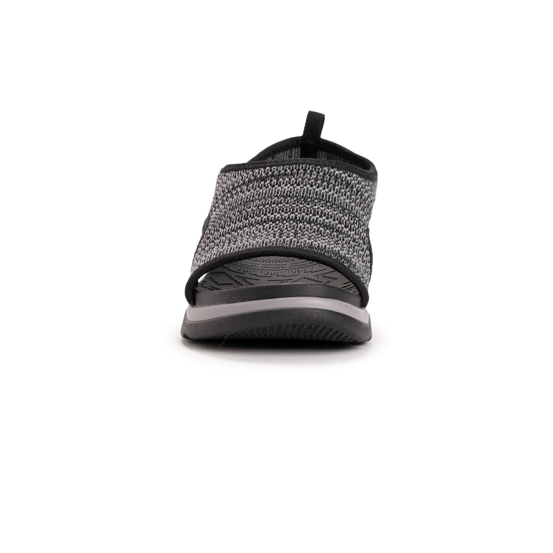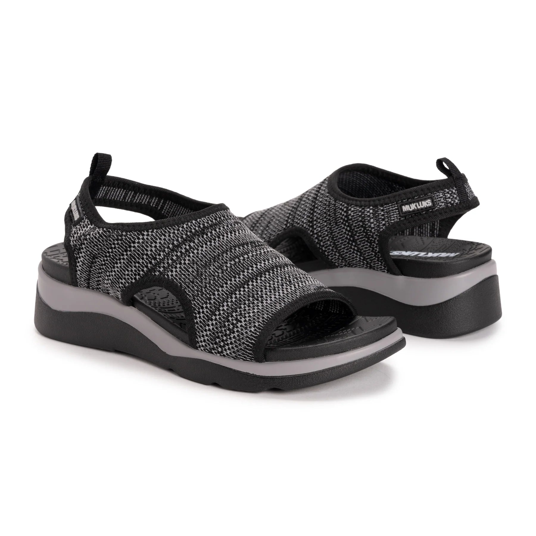 Step into summer with the MUK LUKS Women's Zahara Sandal a perfect fusion of style and comfort. These slip-on sandals feature a trendy sling-back design, a breathable knit upper, a fairisle embossed comfort footbed, and a lightweight, flexible sport wedge outsole.