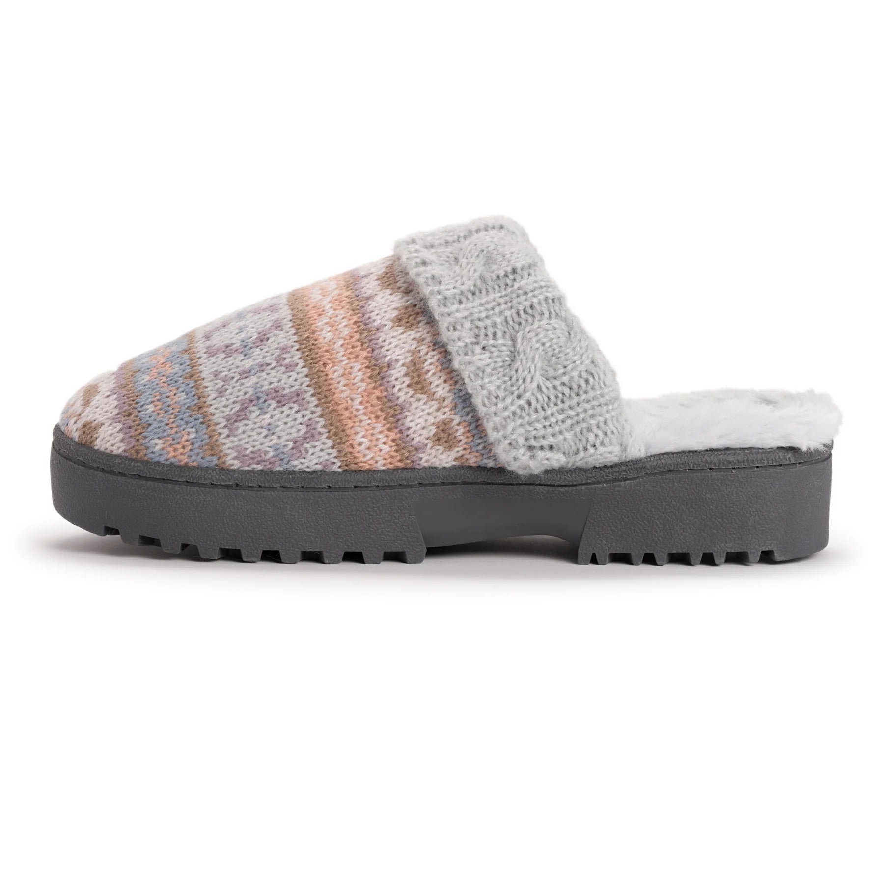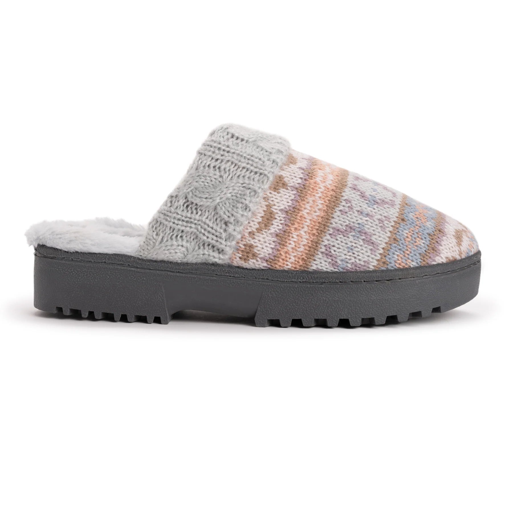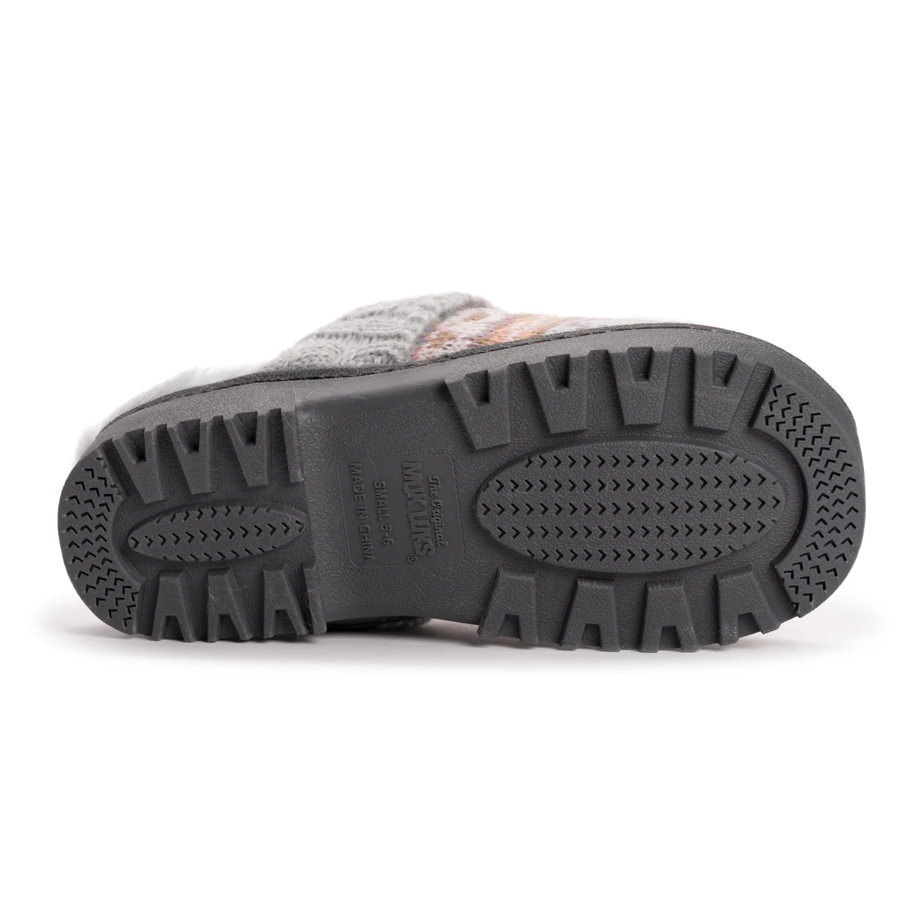 Keep your feet cozy and stylish with the Muk Luks Women's Minette Slippers. These classic slide slippers feature a soft faux shearling lining and a multi-layer comfort foam footbed for better and longer lasting support. The uniquely in-house designed knit pattern offers a timeless look, while the indoor/outdoor sole gives you comfort whether you're lounging inside or stepping out to grab the mail or run an errand. Slip into all-day warmth and style!