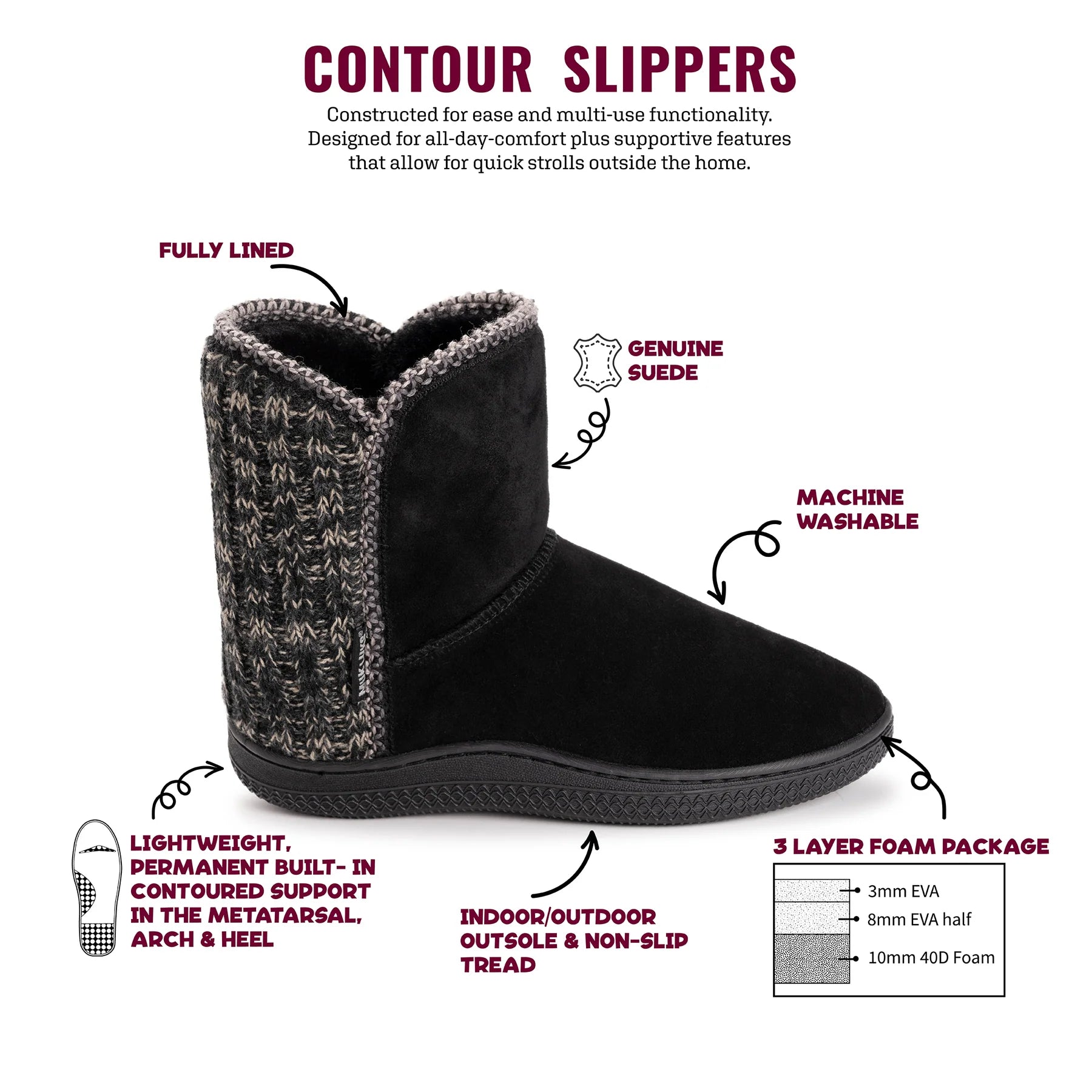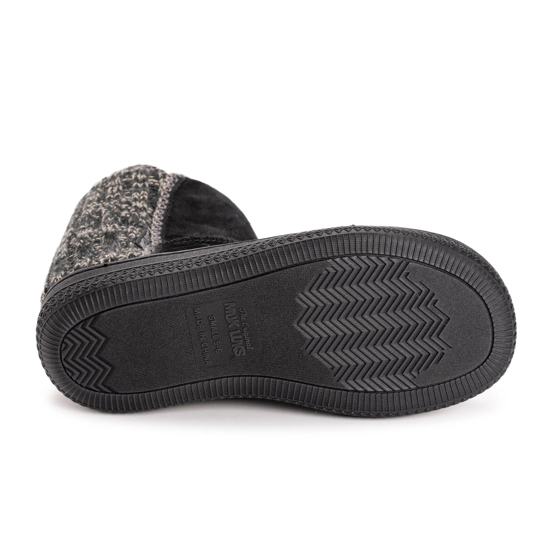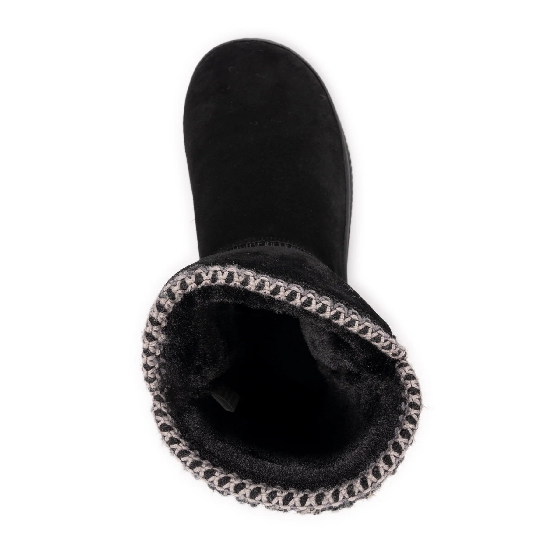 Step into cozy style with the MUK LUKS Cheyenne Reese Bootie. These black suede booties feature a fun knit design on the back and a plush faux fur lining for extra warmth. The pull-on design makes them easy to wear, while the durable indoor/outdoor sole lets you take them anywhere. Perfect for chilly days, these booties combined comfort and fashion effortlessly.