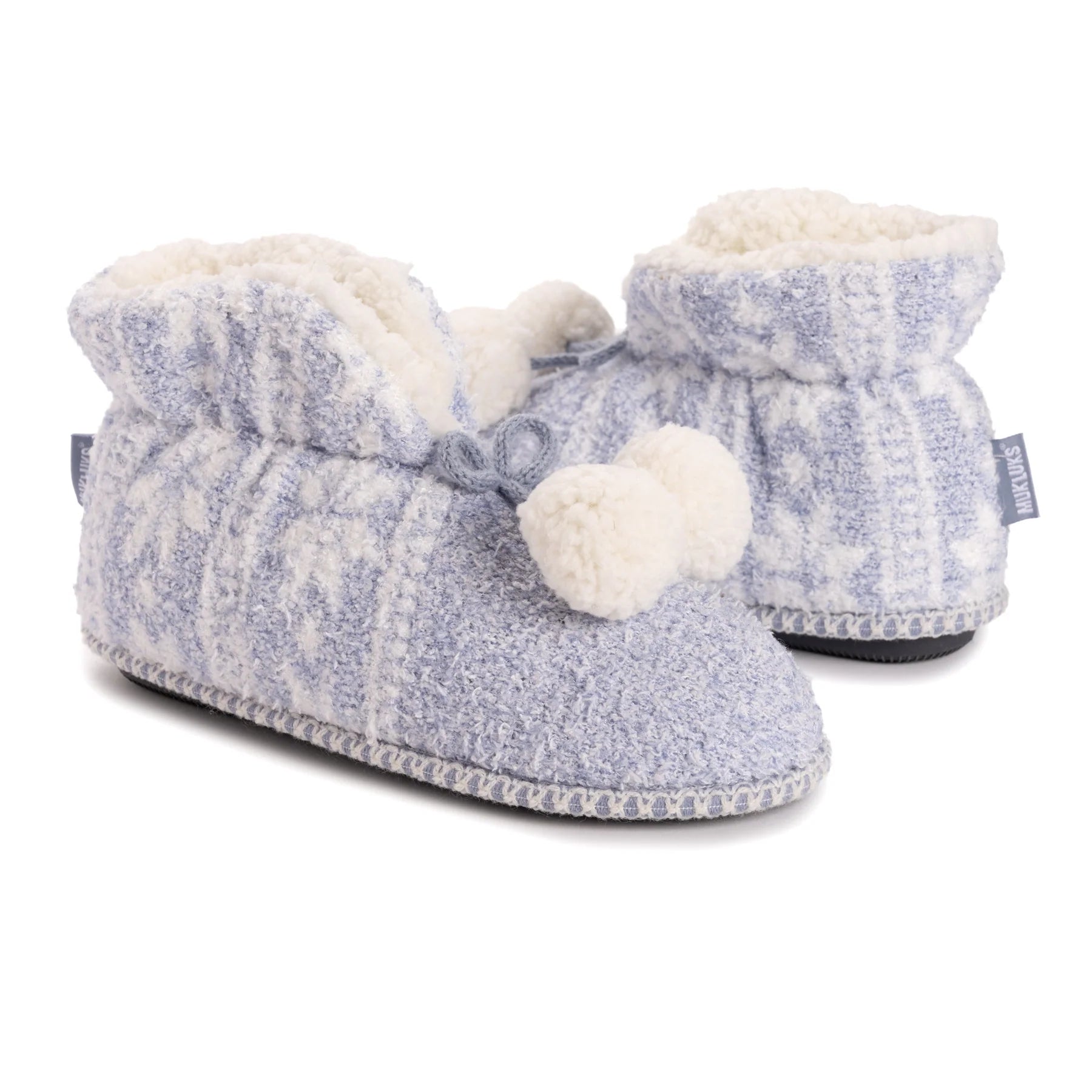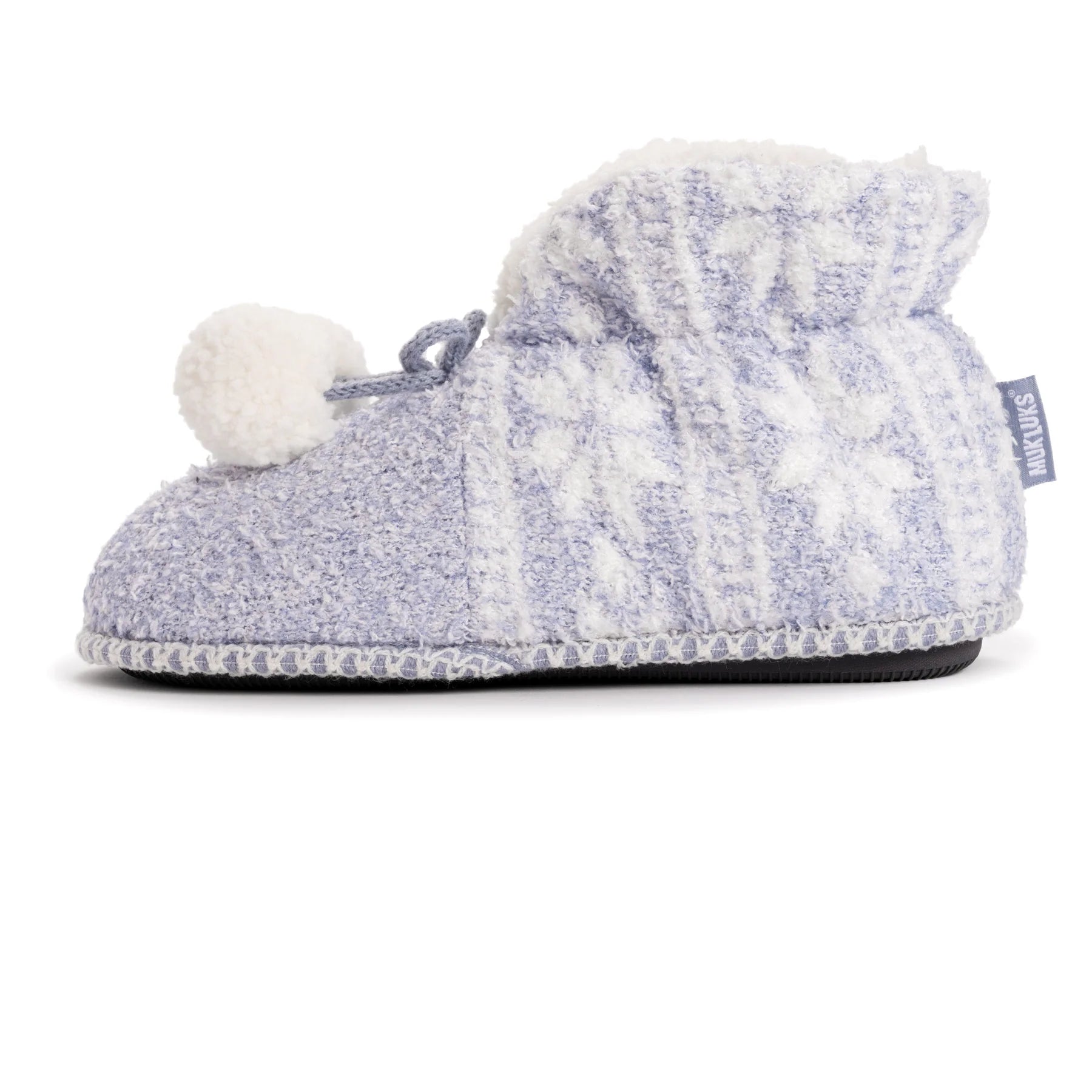 Keep warm and cozy with MUK LUKS® Lelilani Bootie Slippers. Easy pull-on style, infused with Vitamin E. Pom detail and durable indoor/outdoor sole makes this full coverage bootie a classic cold weather favorite. Machine wash on gentle cycle, no bleach, tumble dry low heat.