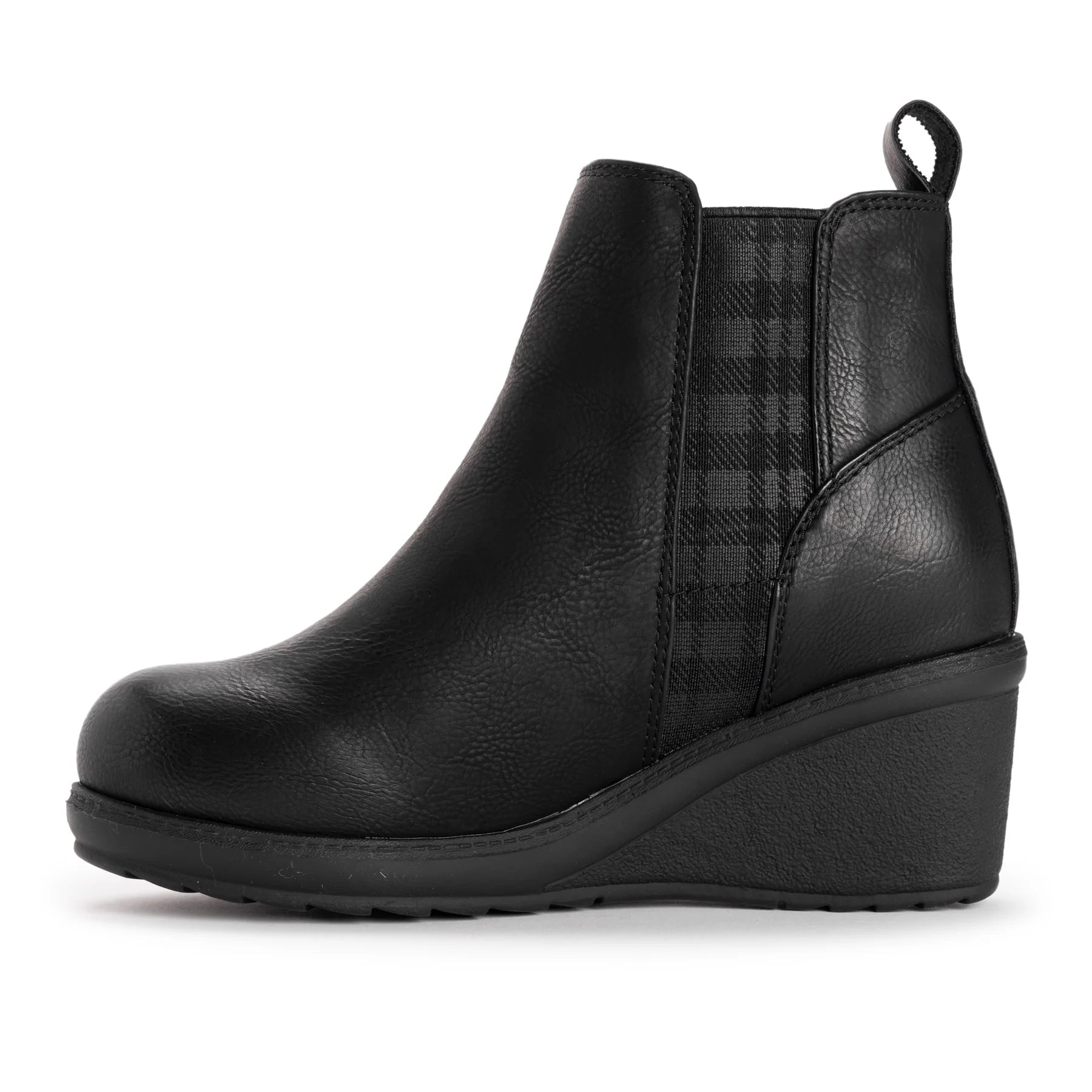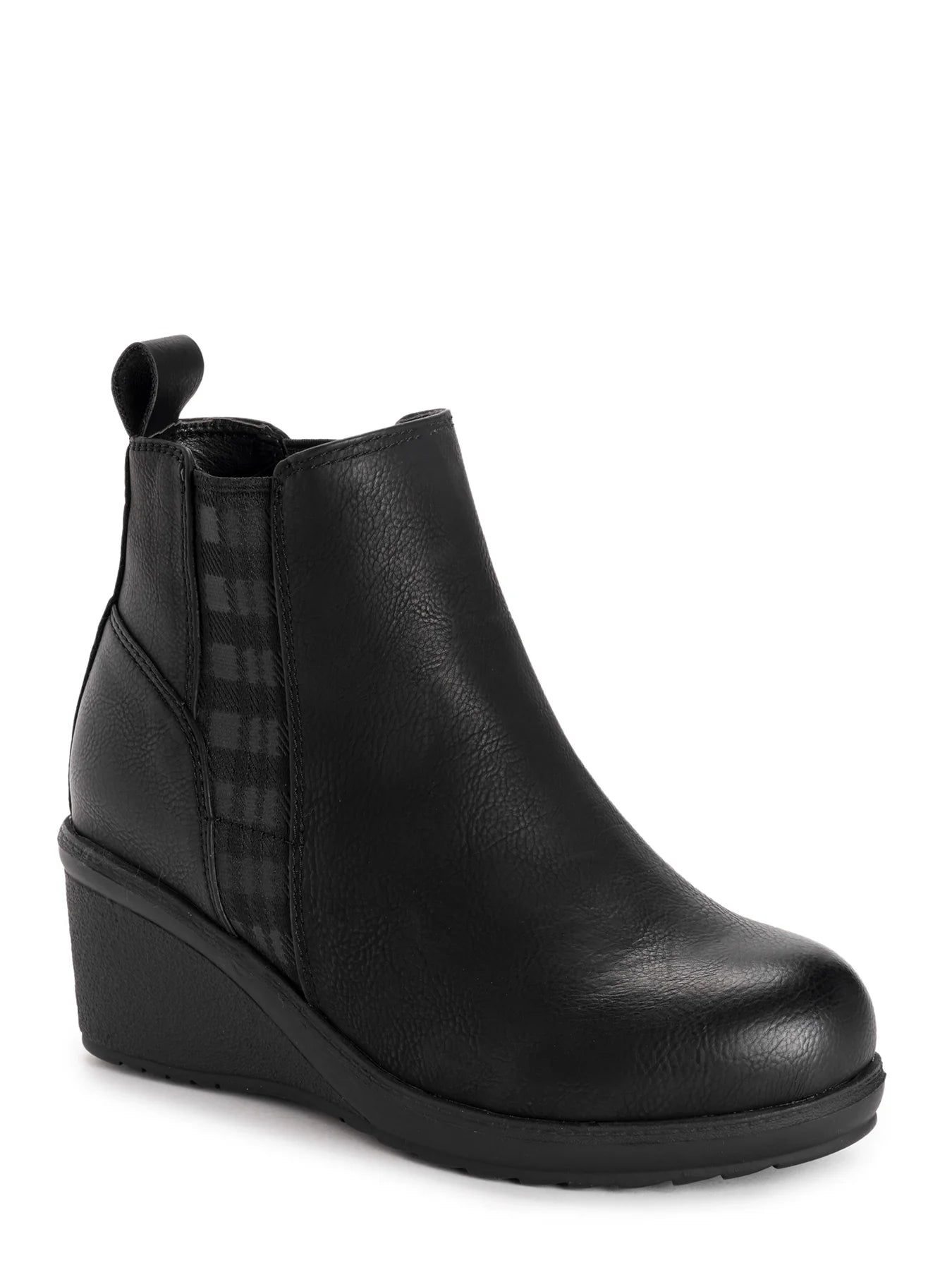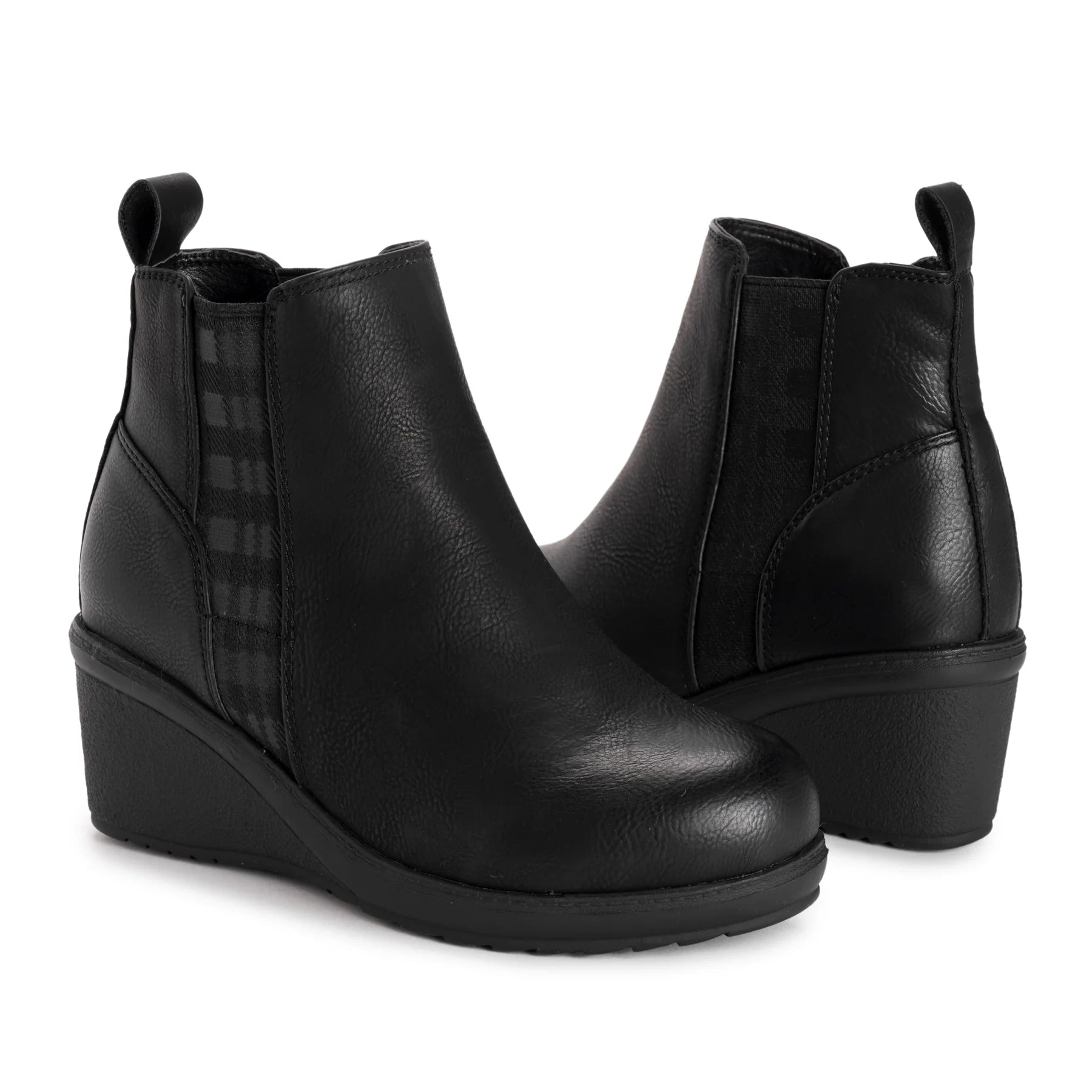 Make every step count in MUK LUKS Women's England Oxford Wedge. This wedge ankle bootie has a detailed plaid elastic gore that allows added flexibility for easy on and off while memory foam insoles offer you superior support and comfort all day long. nWipe with a damp cloth to clean, no bleach, lay flat to dry. Imported. - Durable TPR Sole- 100% Polyester Faux Fur Insole- 100% Polyurethane Upper- 100% Polyester Faux Fur Lining- 2.5 Inch Wedge Heel-Memory Foam Insole- Multiple color options available- Women's Whole and Half Sizes 6-11