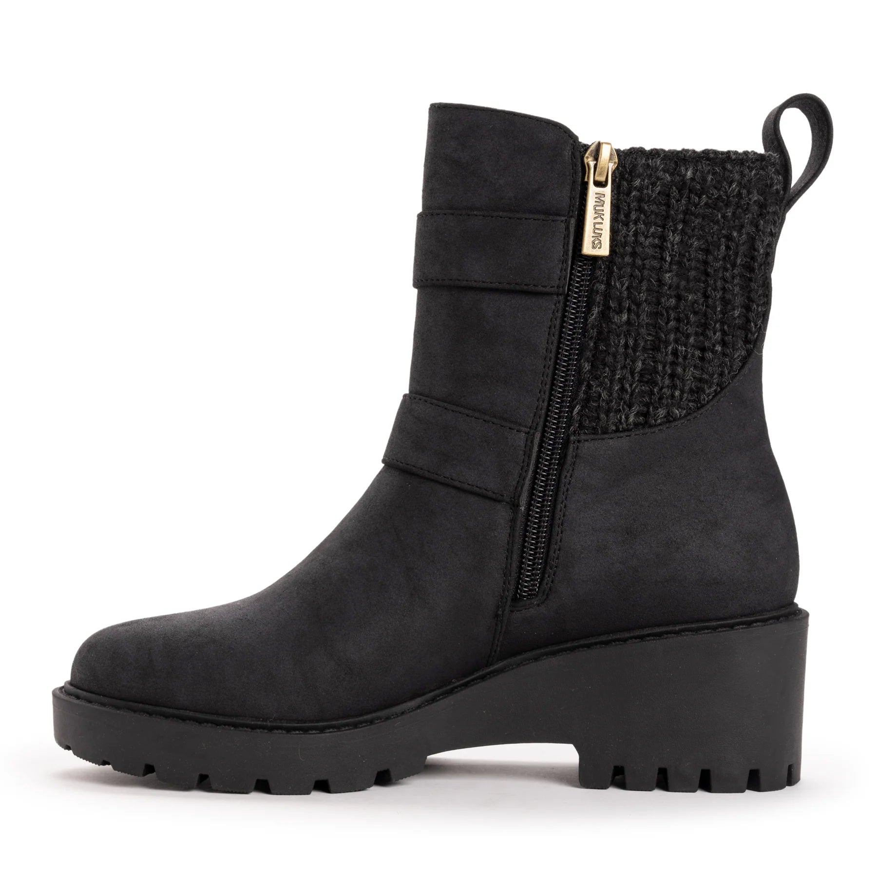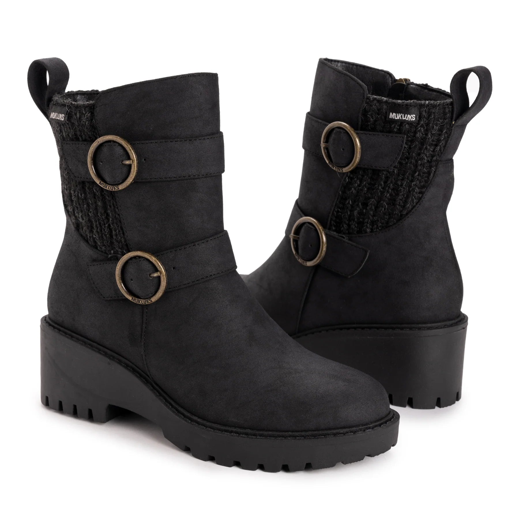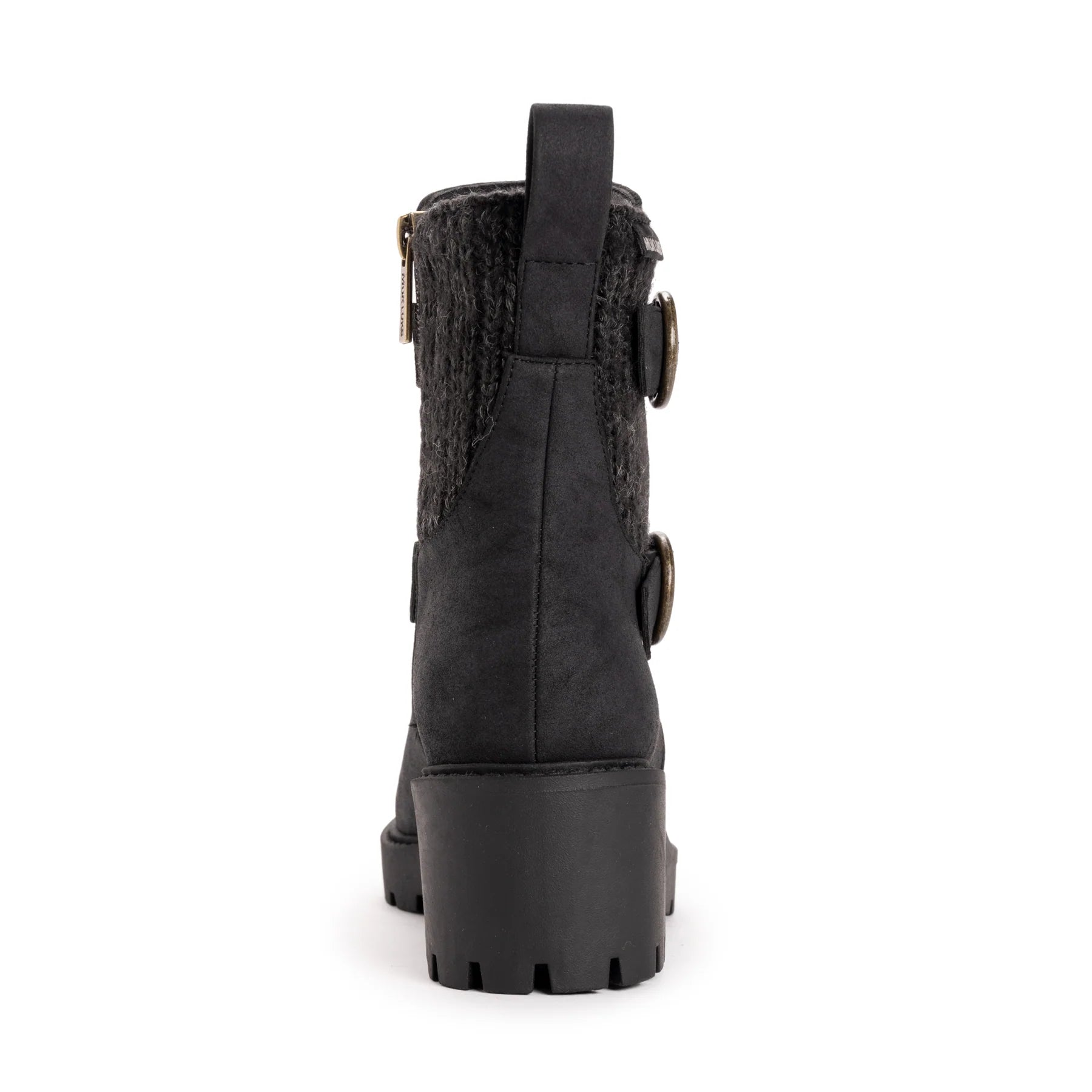 The chunky lug sole of the MUK LUKS Women's Faith Boot puts a 90s spin on this side-zip modern boot. Not only will you appreciate the neutral sweater detail and buckles, but your feet will feel cozy, thanks to the signature Muk Luxe lining. Sweater Detail. Spot clean, no bleach, lay flat to dry.