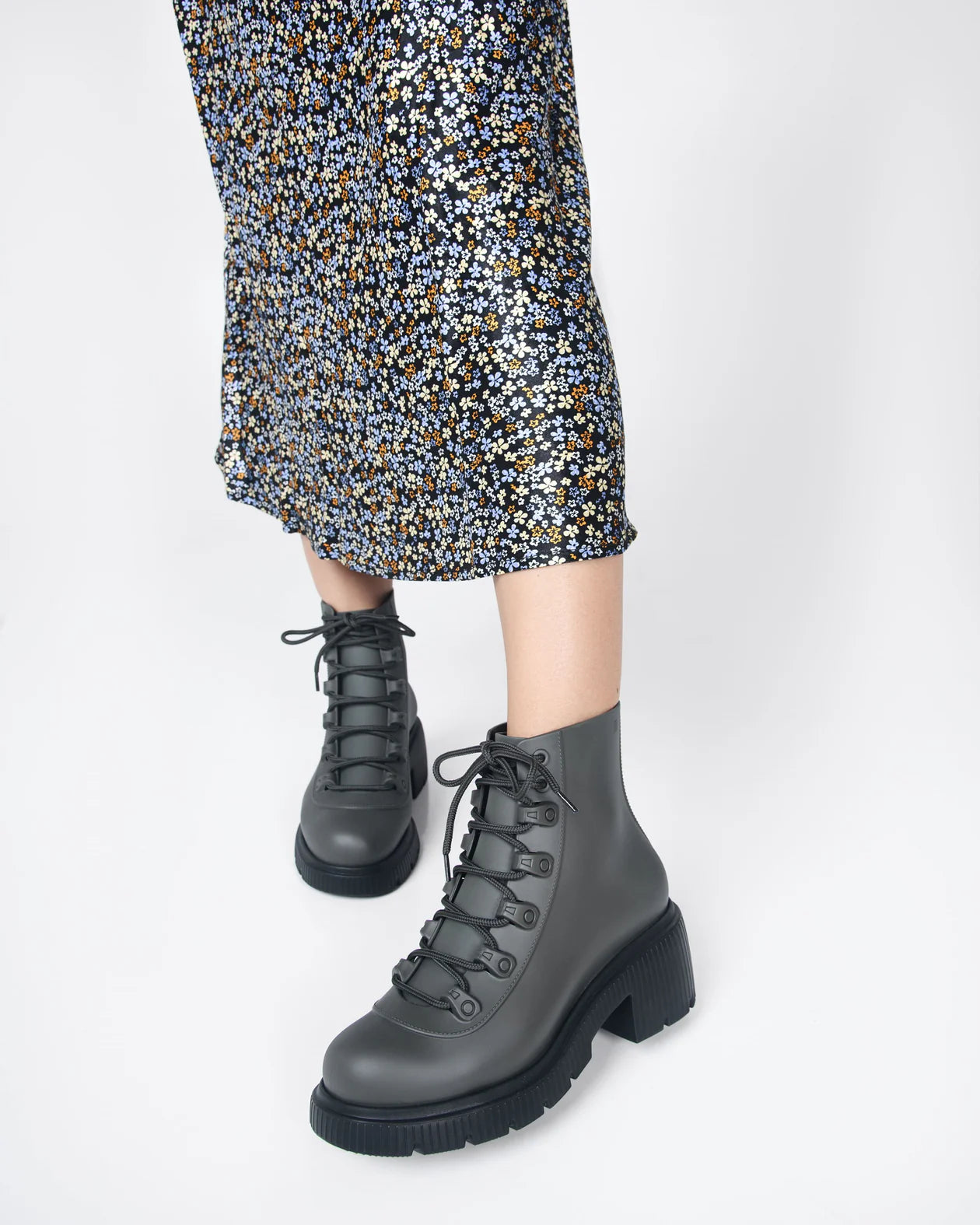 Inspired by the punk, grunge and gothic movements, the Melissa Cosmo Boot is a boot full of irreverence. This style has a medium upper, Melflex upper, dry insole that absorbs moisture and biobased EVA sole (more sustainable). The textile material lace closure brings power to the shape that has everything to become the darling of attitude fashionistas. Highlight for the color palette, which brings more closed and sober tones.