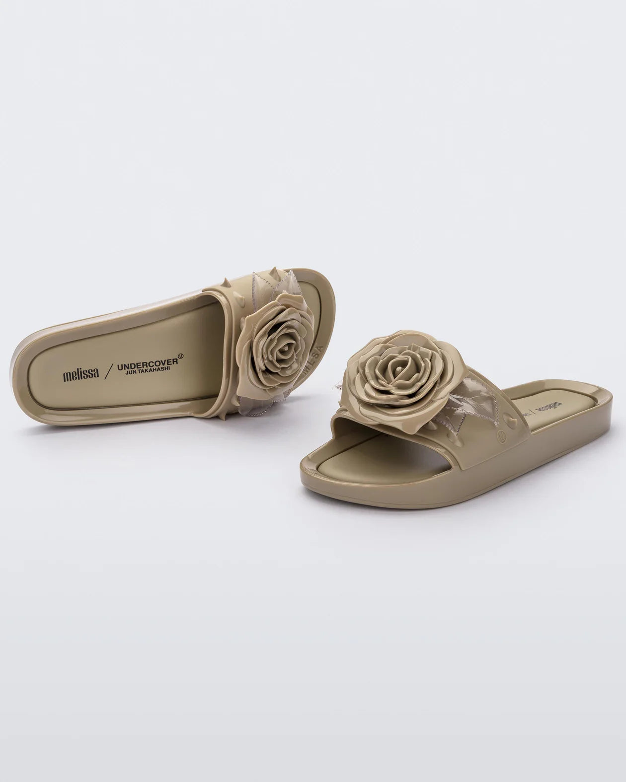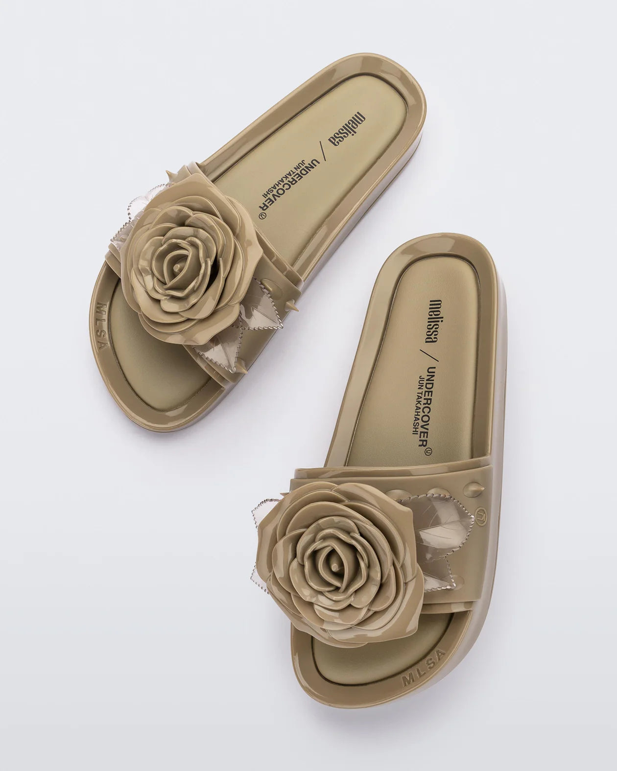 Melissa + Undercover Spike is a new version of Melissas's classic shape: the beach slide. In this super cool version, the slide gets the maxi rose adornment on the Upper strip, with translucent leaves and spikes. It is the perfect choice for those who want to add fashion information to the look of day to day.
