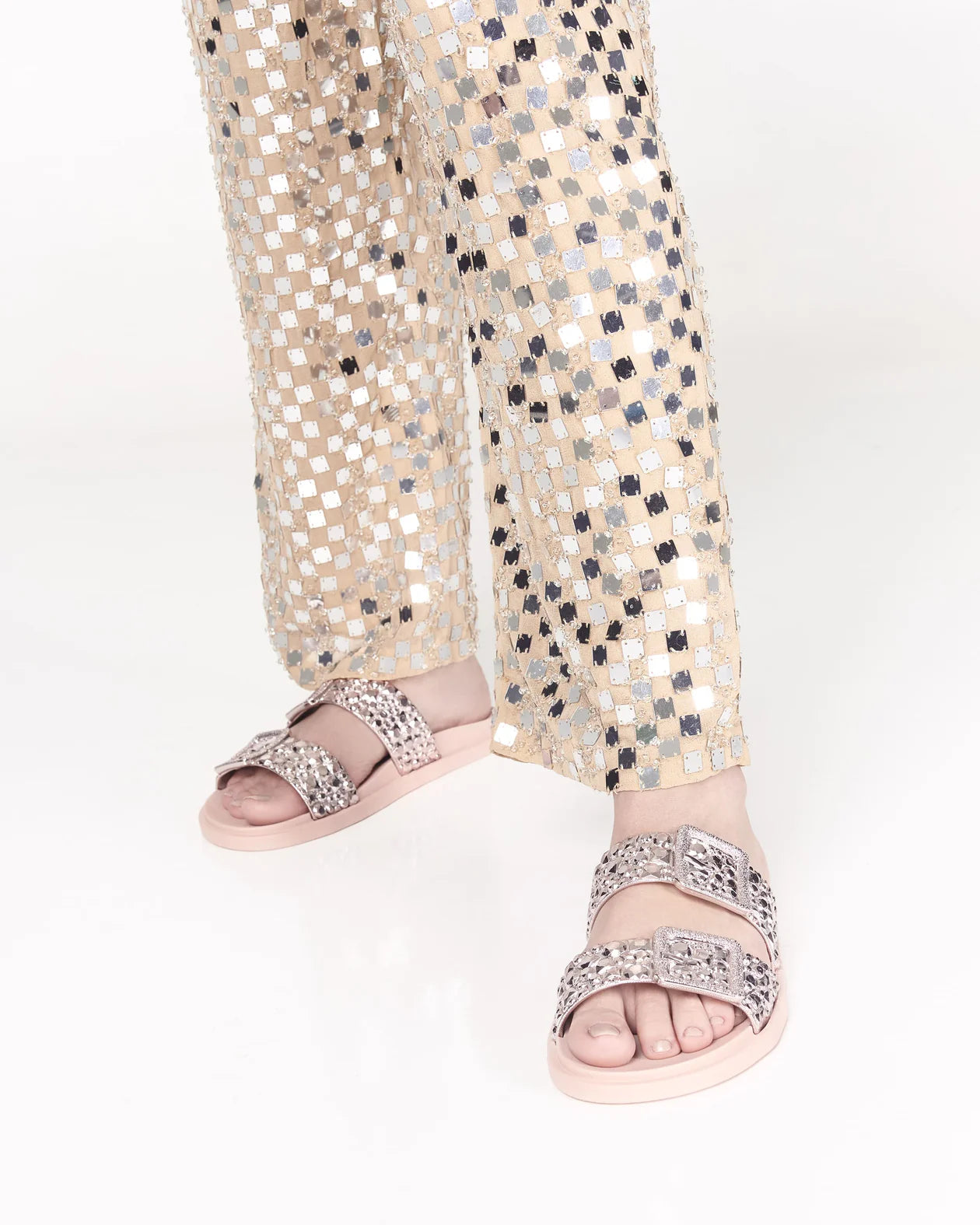 Get ready to dazzle with the Melissa Lust Slide. This fashion-forward slide sandal boasts a beautiful chrome upper. The expanded outsole ensures ultra-lightweight comfort and the buckles add a touch of edge to this dazzling design. Because who says casual can't be captivating?