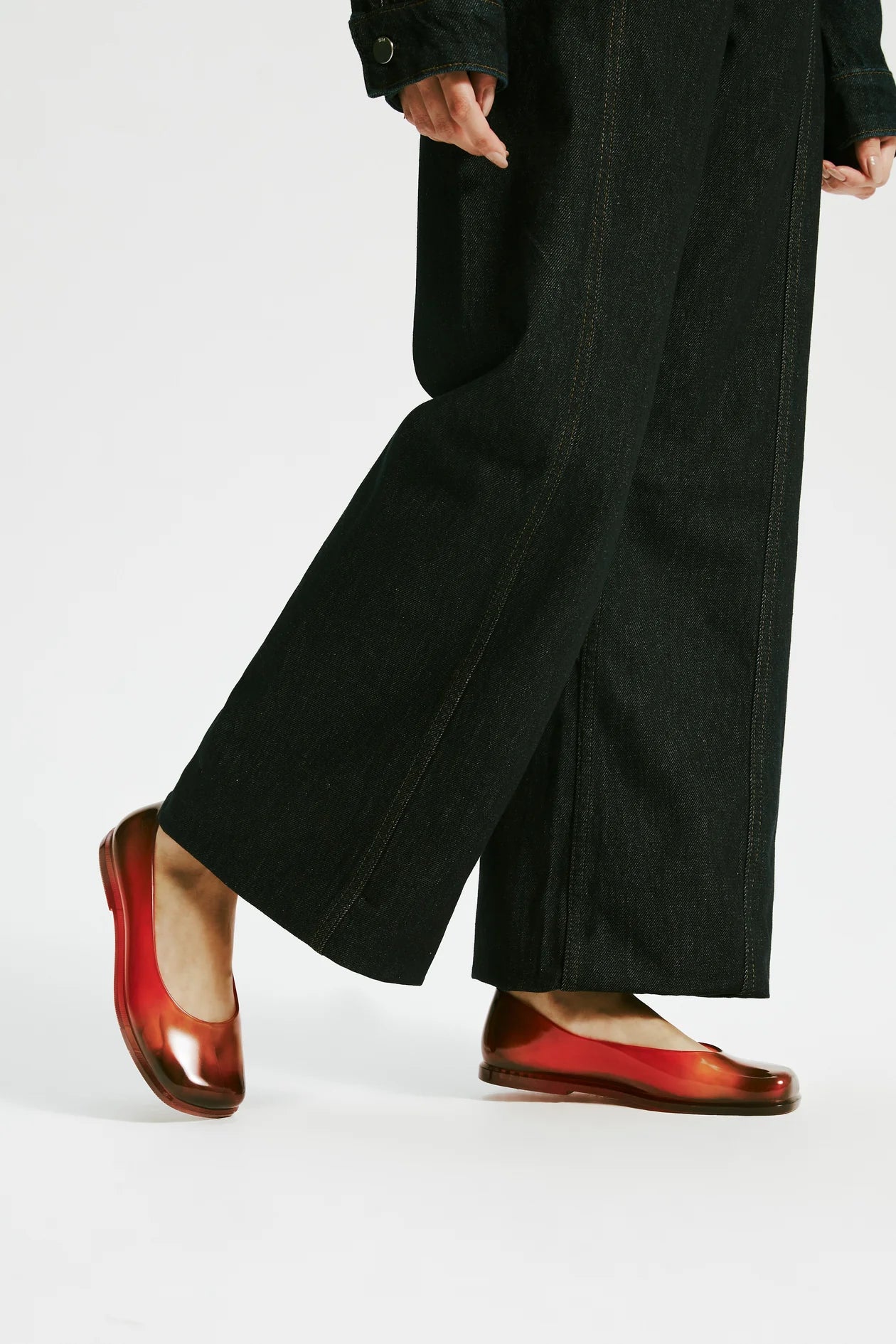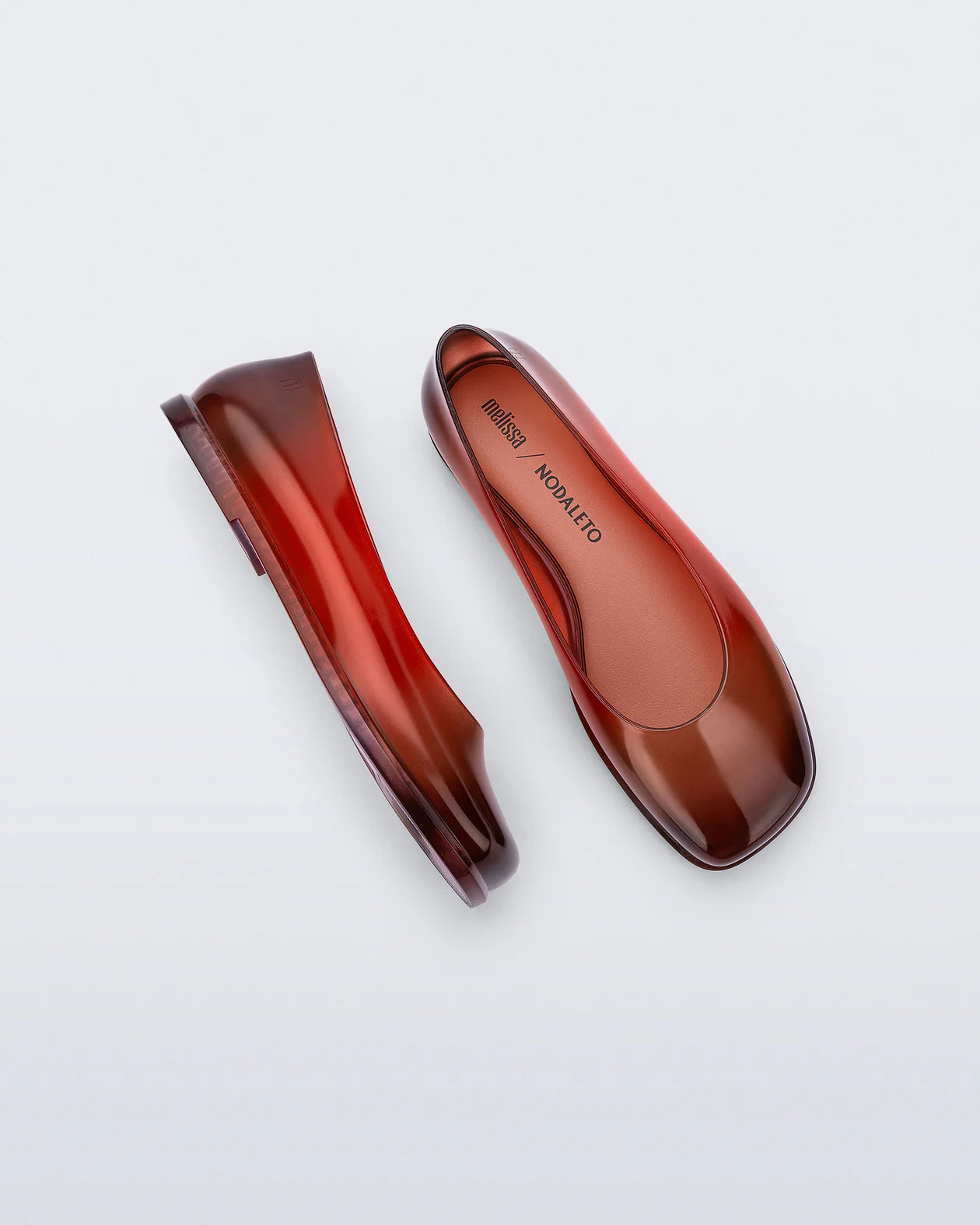 Inspired by the colorful tones that blend on the horizon, the Melissa / Nodaleto Ruby Flat celebrates the beauty of a summer sunset. Gradient painting techniques on translucent Melflex® bring the magic of dusk to our square-toed ballerina for a one-of-a-kind take in collaboration with the luxury footwear brand.