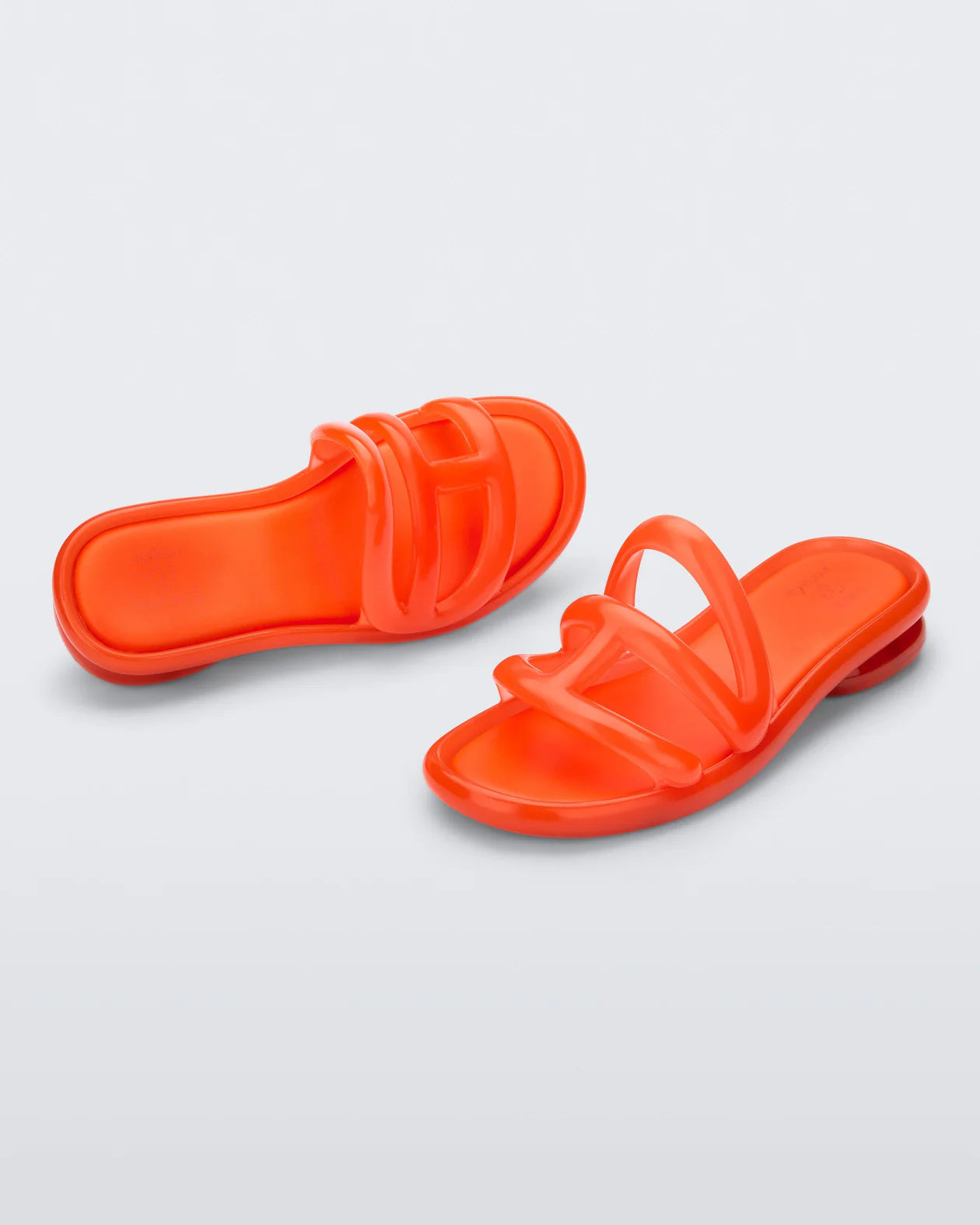 The Melissa x Telfar Jelly Slide — features a tubular design forming a logo strap before snaking around the foot and under the heel for a little lift. This slide is an instant icon molded using Melissa's exclusive Melflex material.