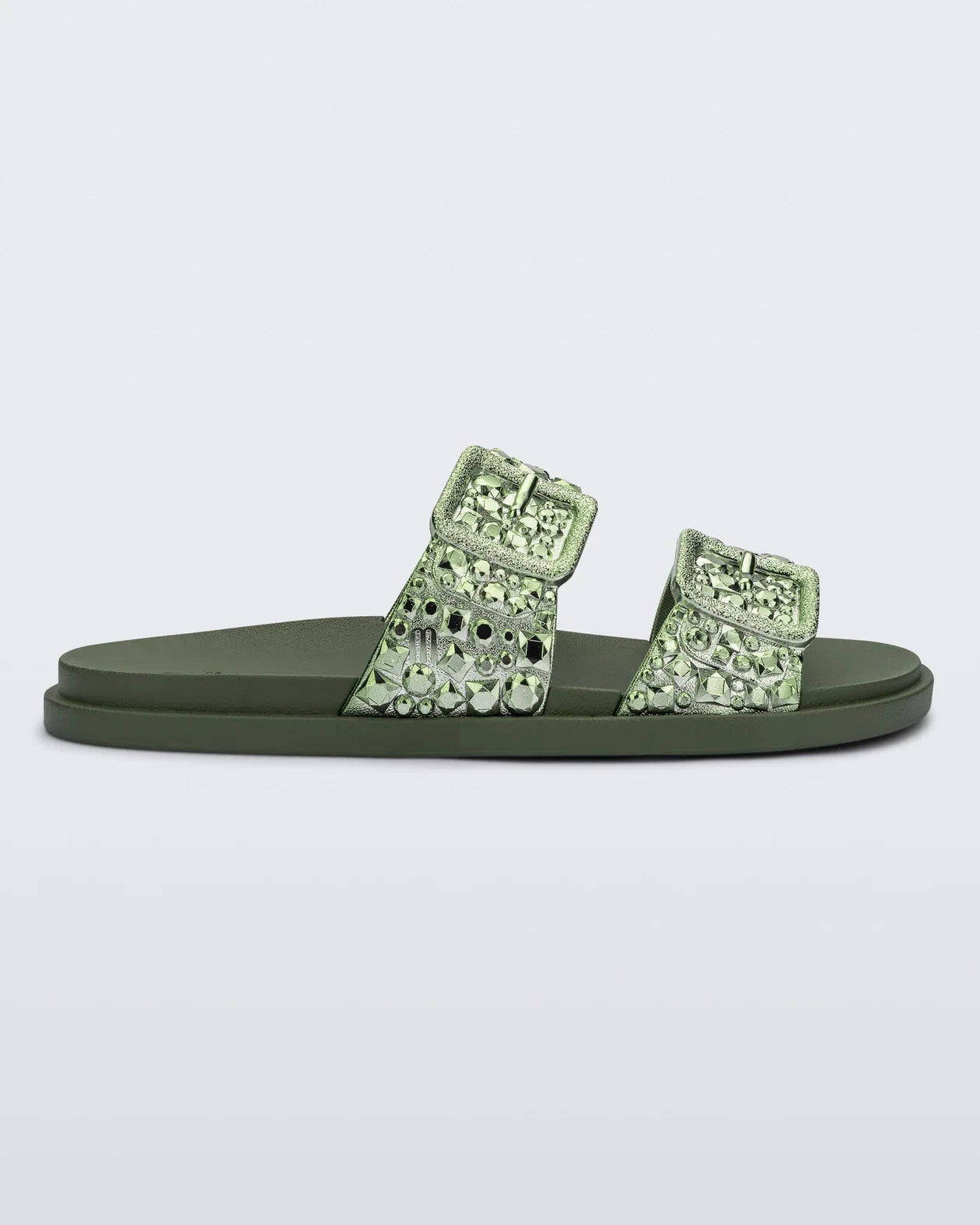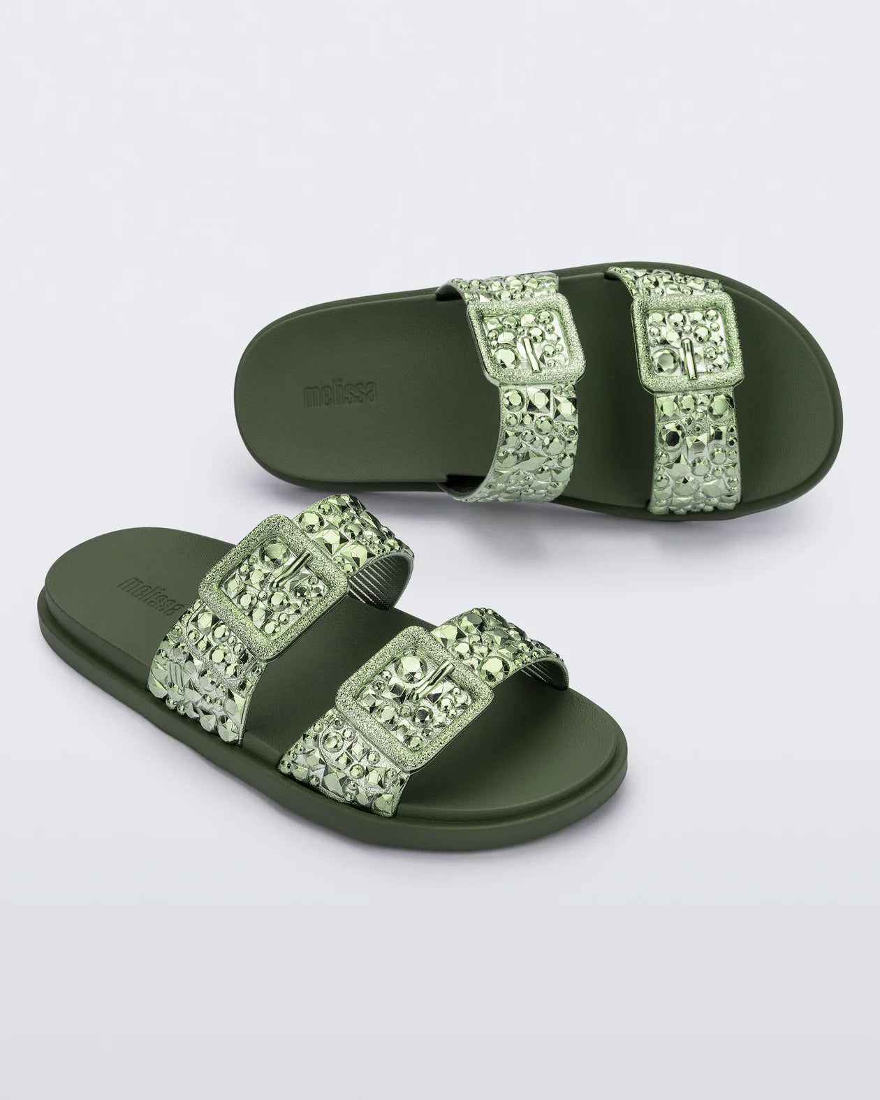 Get ready to dazzle with the Melissa Lust Slide. This fashion-forward slide sandal boasts a beautiful chrome upper. The expanded outsole ensures ultra-lightweight comfort and the buckles add a touch of edge to this dazzling design. Because who says casual can't be captivating?