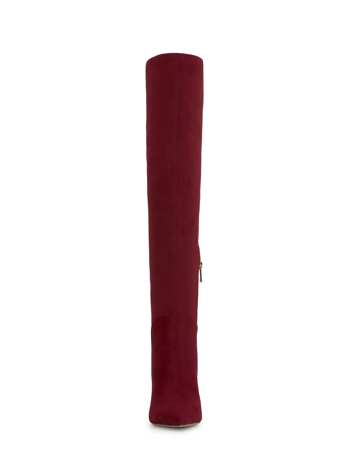 This over-the-knee, high-heeled boot has a pointed toe and a slim stiletto heel giving it a sleek and elegant look