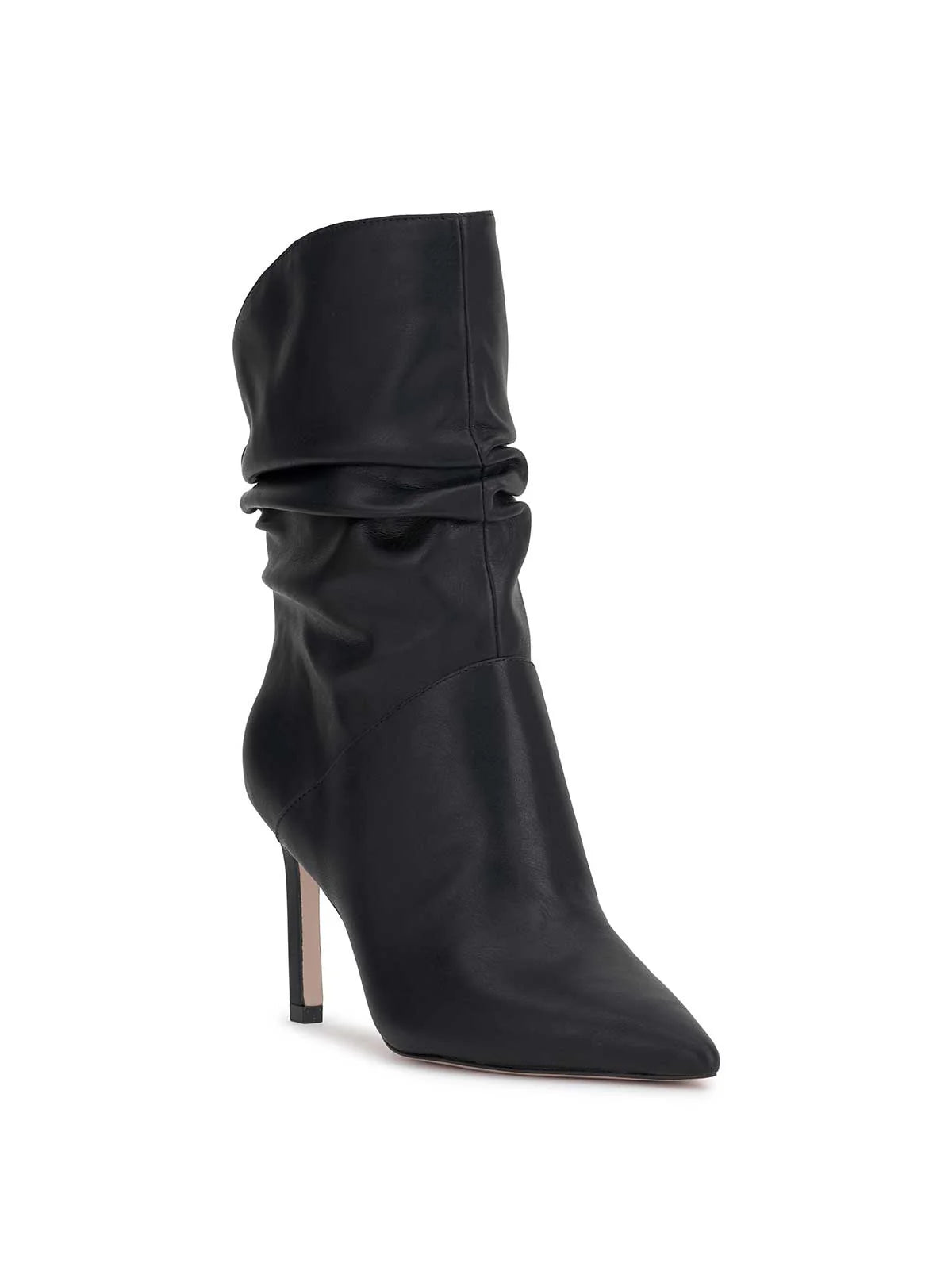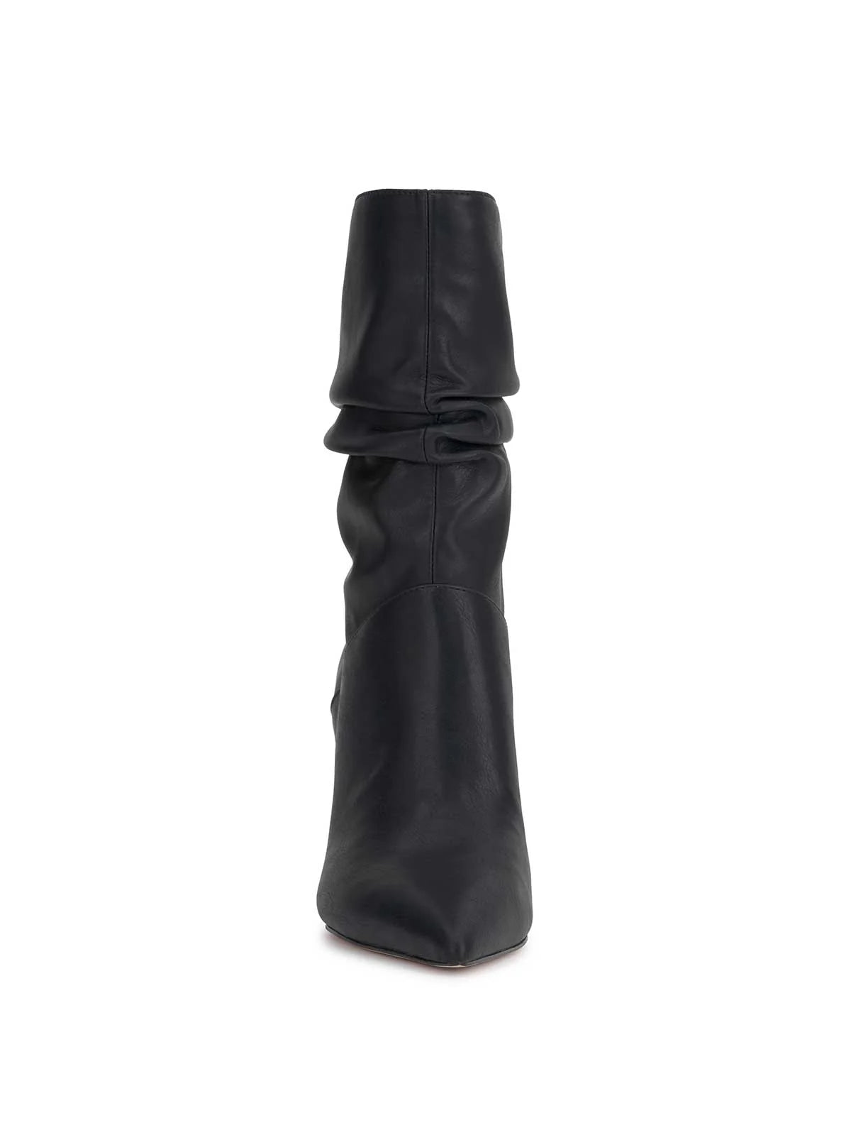 This is a sleek black mid-calf boot featuring a pointed toe and a slim high heel. It has a relaxed, slouchy shaft for an effortlessly chic silhouette, making it versatile for both casual and dressy outfits.
