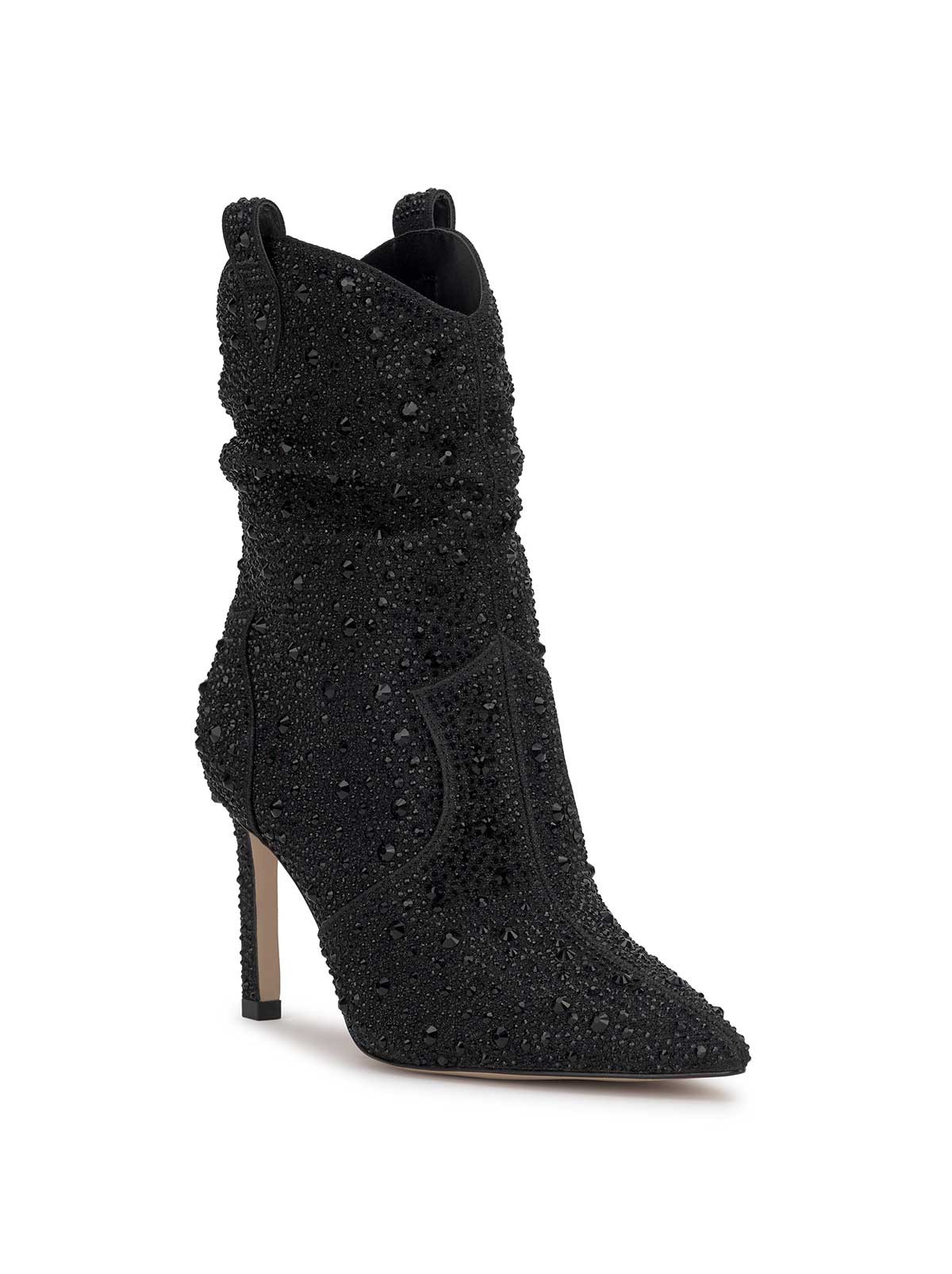 Turn heads with this glam-meets-Western ankle boot, designed to make a bold statement. Featuring a pointed toe and sleek stiletto heel, this boot blends cowgirl charm with high-fashion flair. Covered in sparkling rhinestone embellishments, the design catches the light with every step. Pull tabs and Western-inspired stitching complete the look, making it the perfect choice for concerts, parties, or adding standout style to your everyday wardrobe.