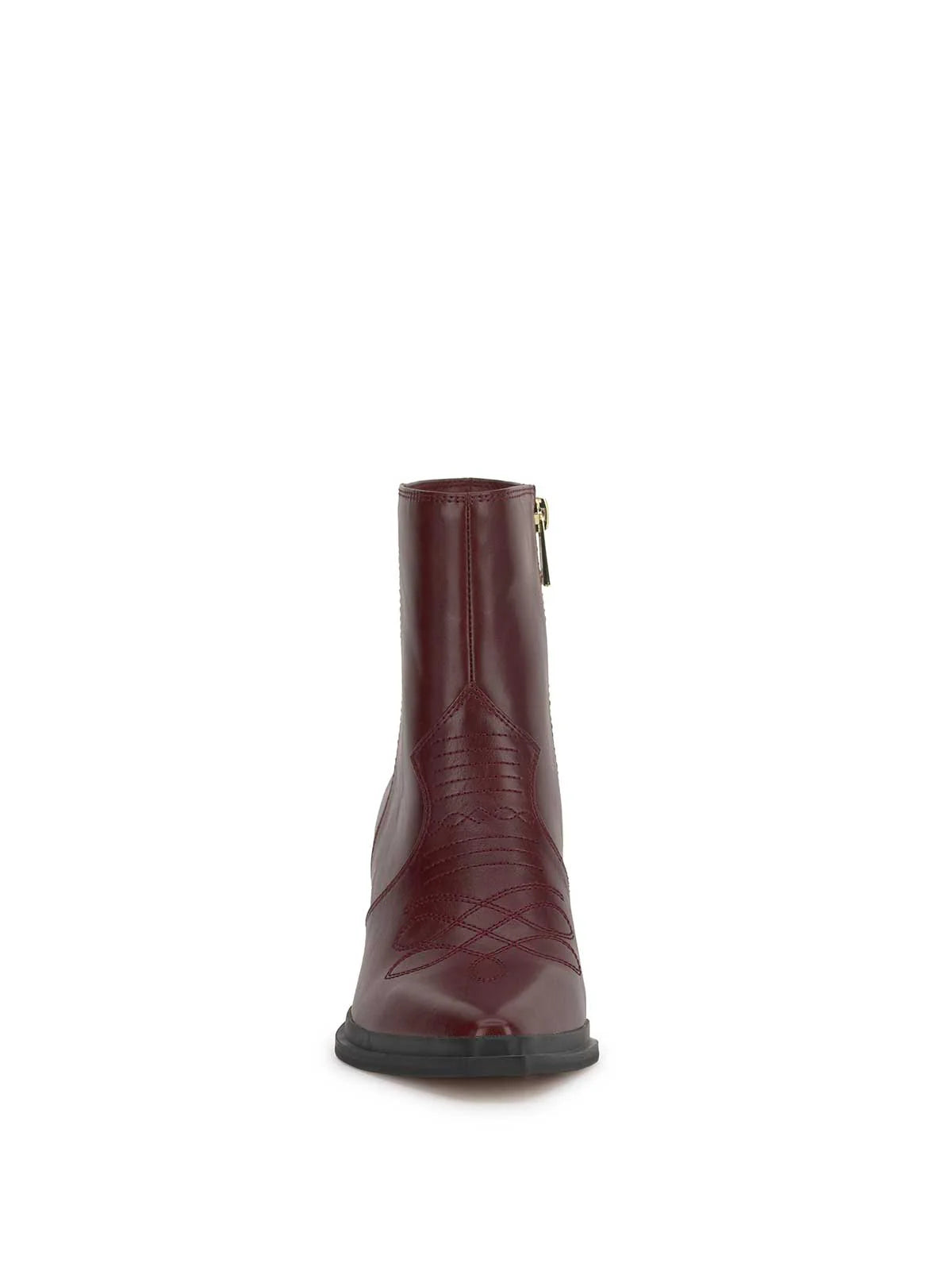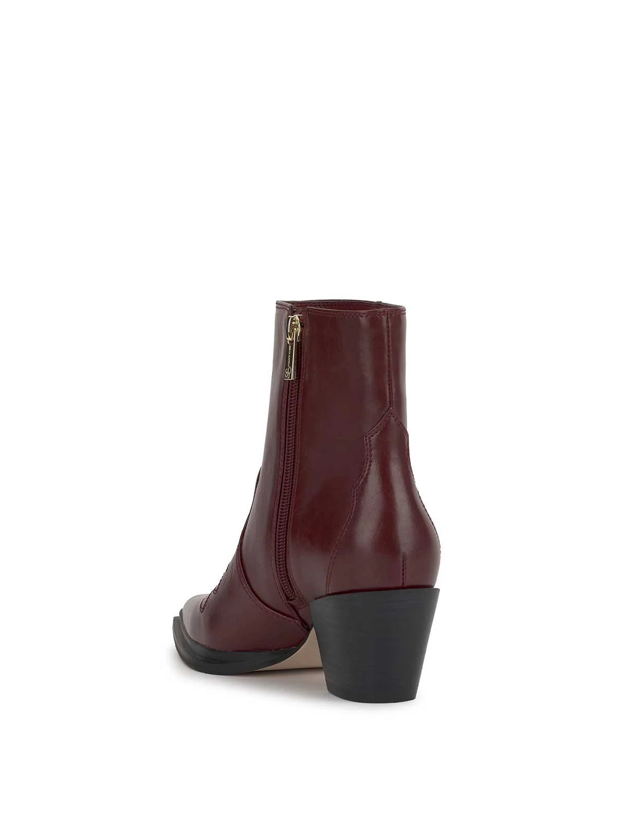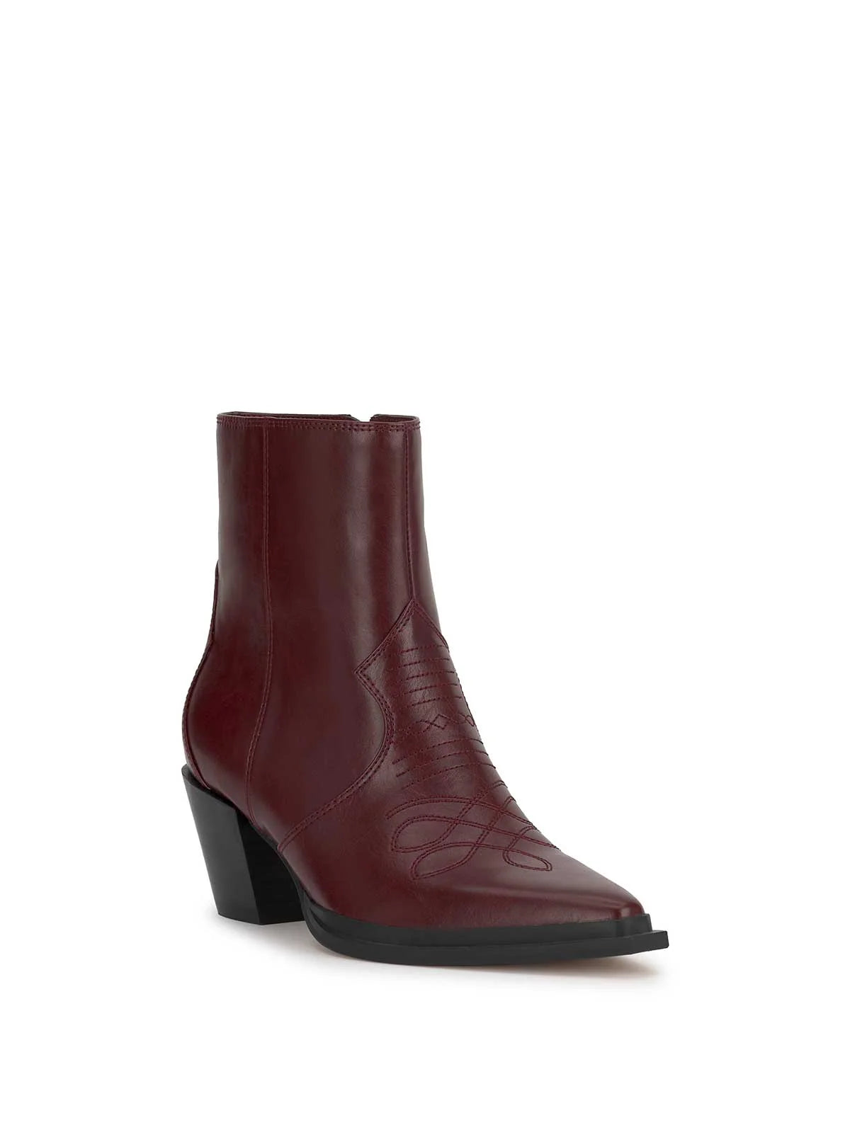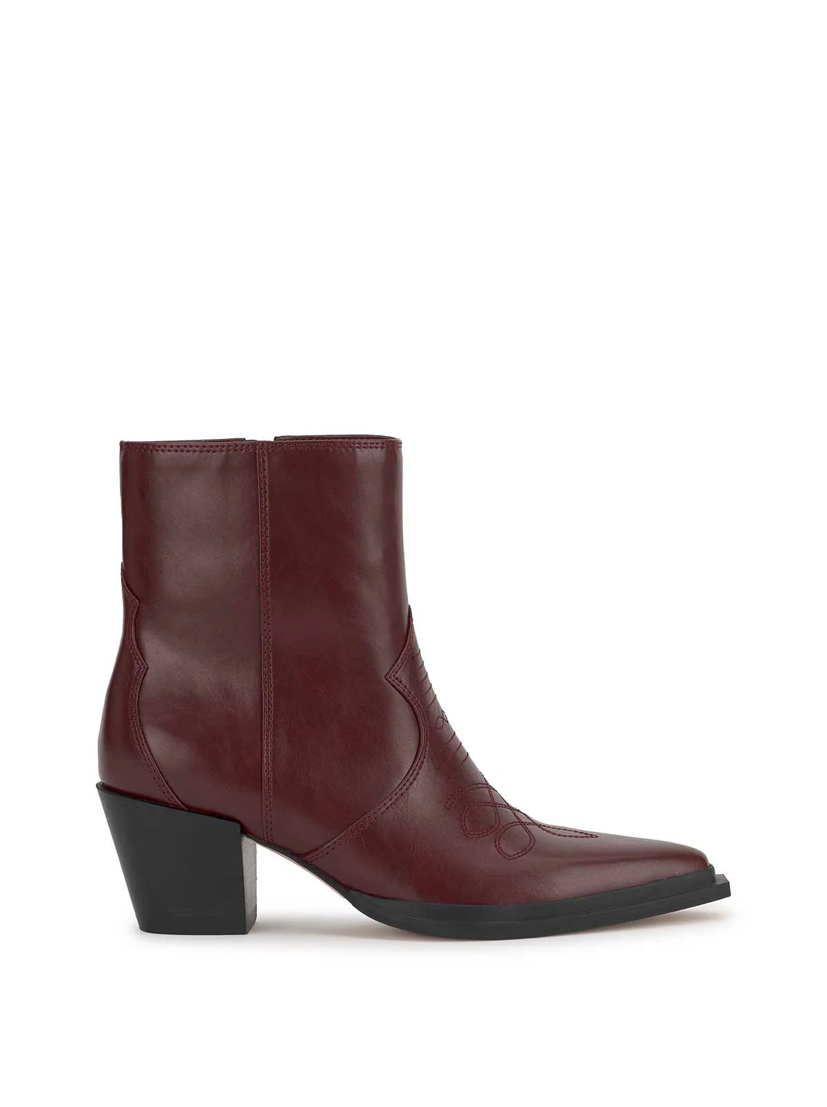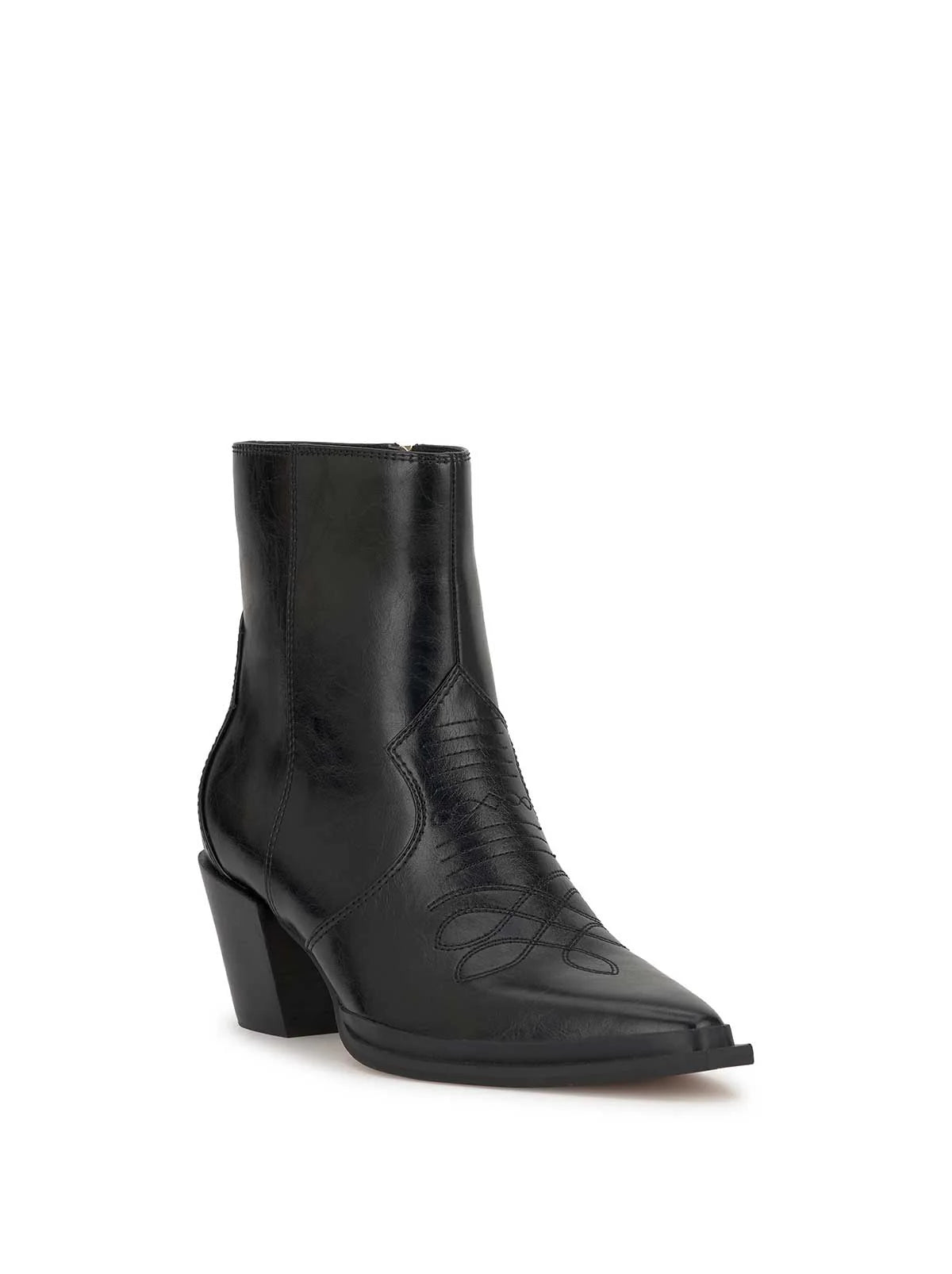 This ankle bootie has a pointed toe and a mid-height block heel. It features a sleek, Western-inspired design with minimal stitching details.