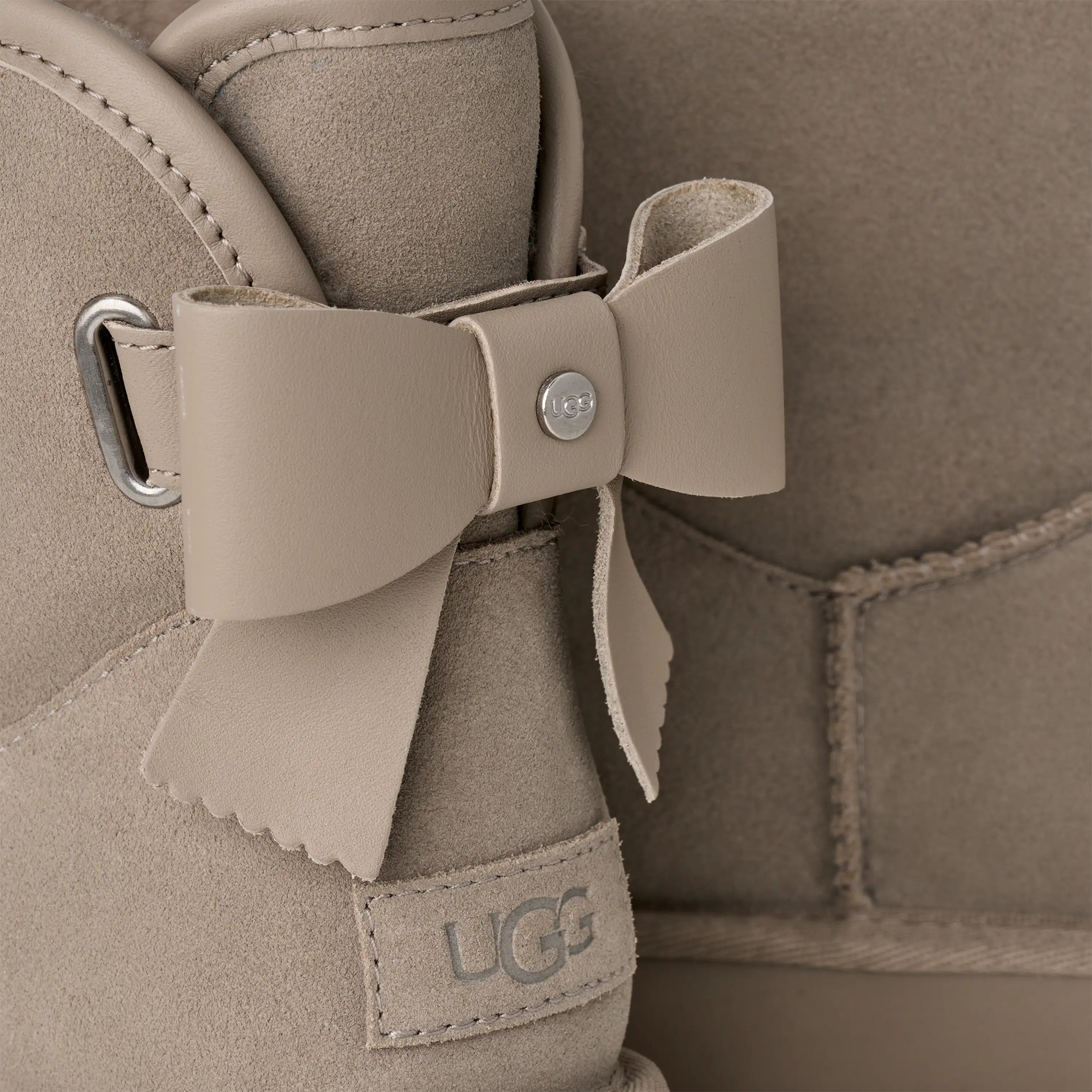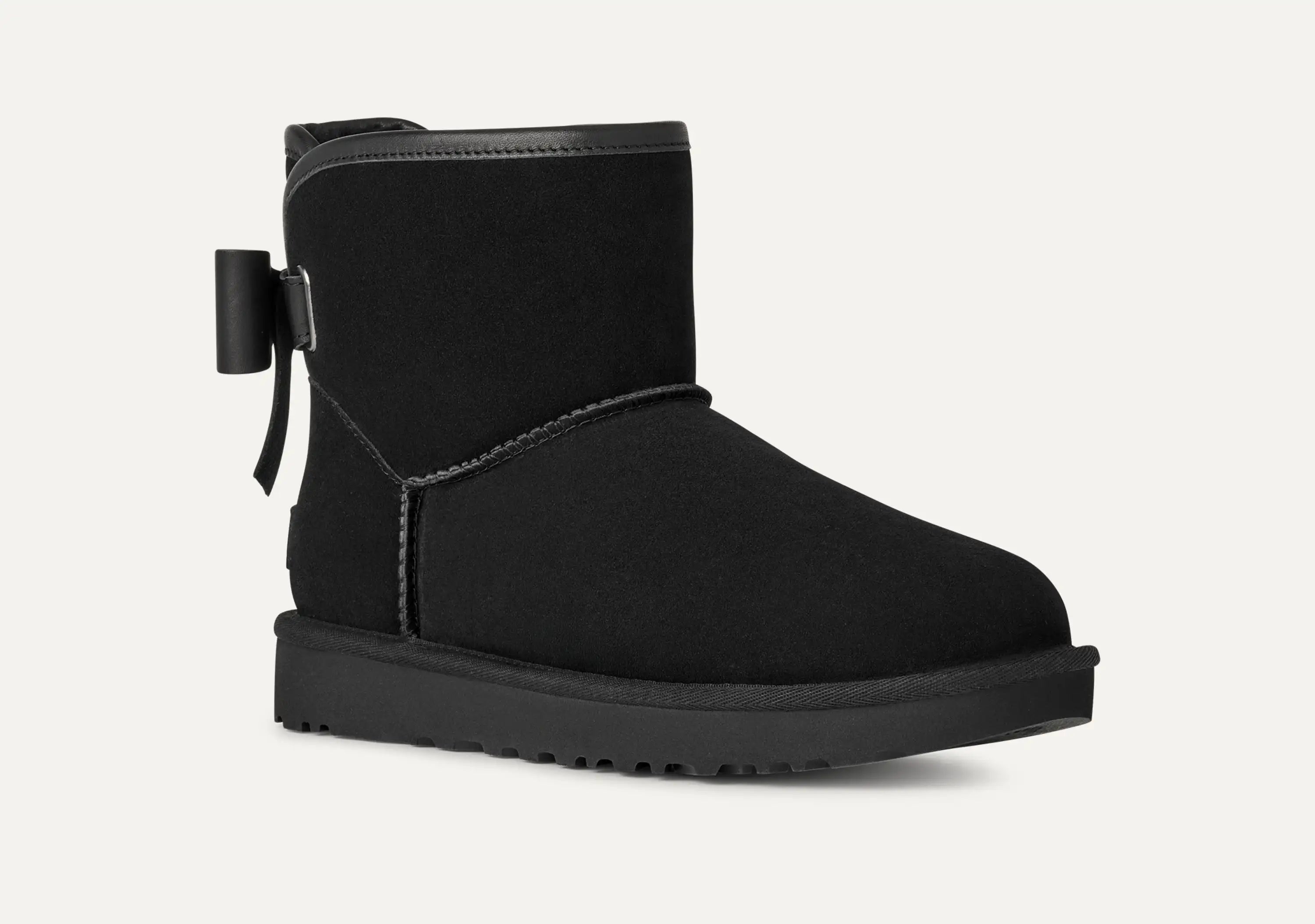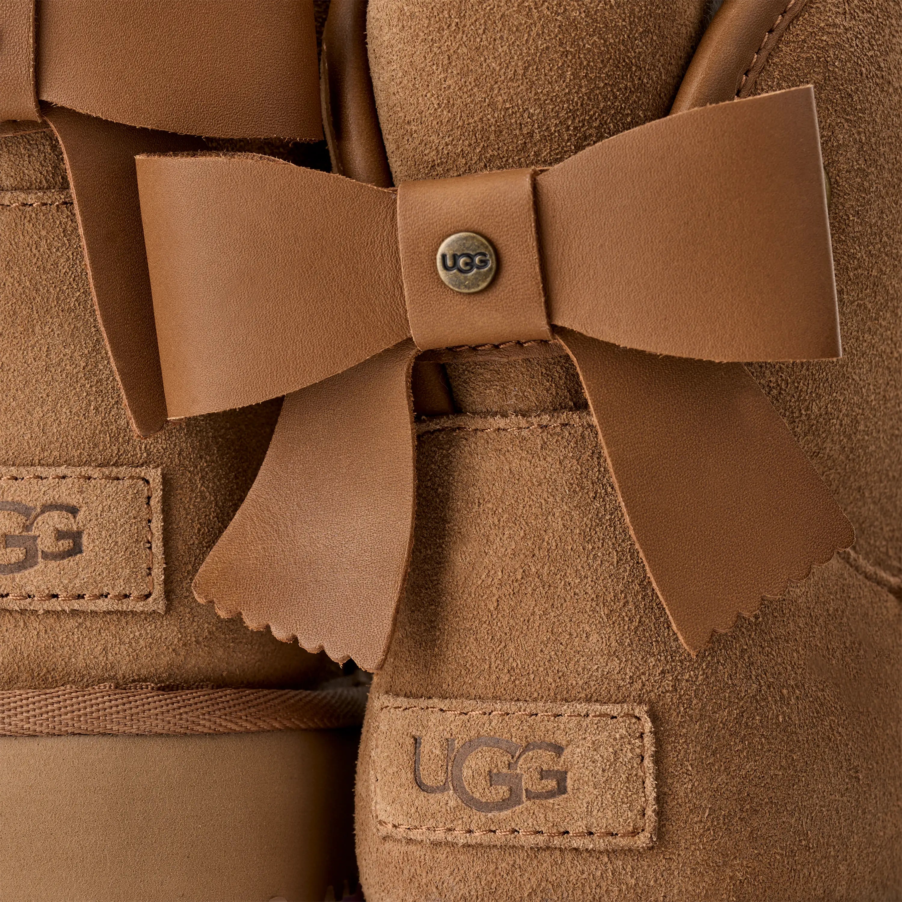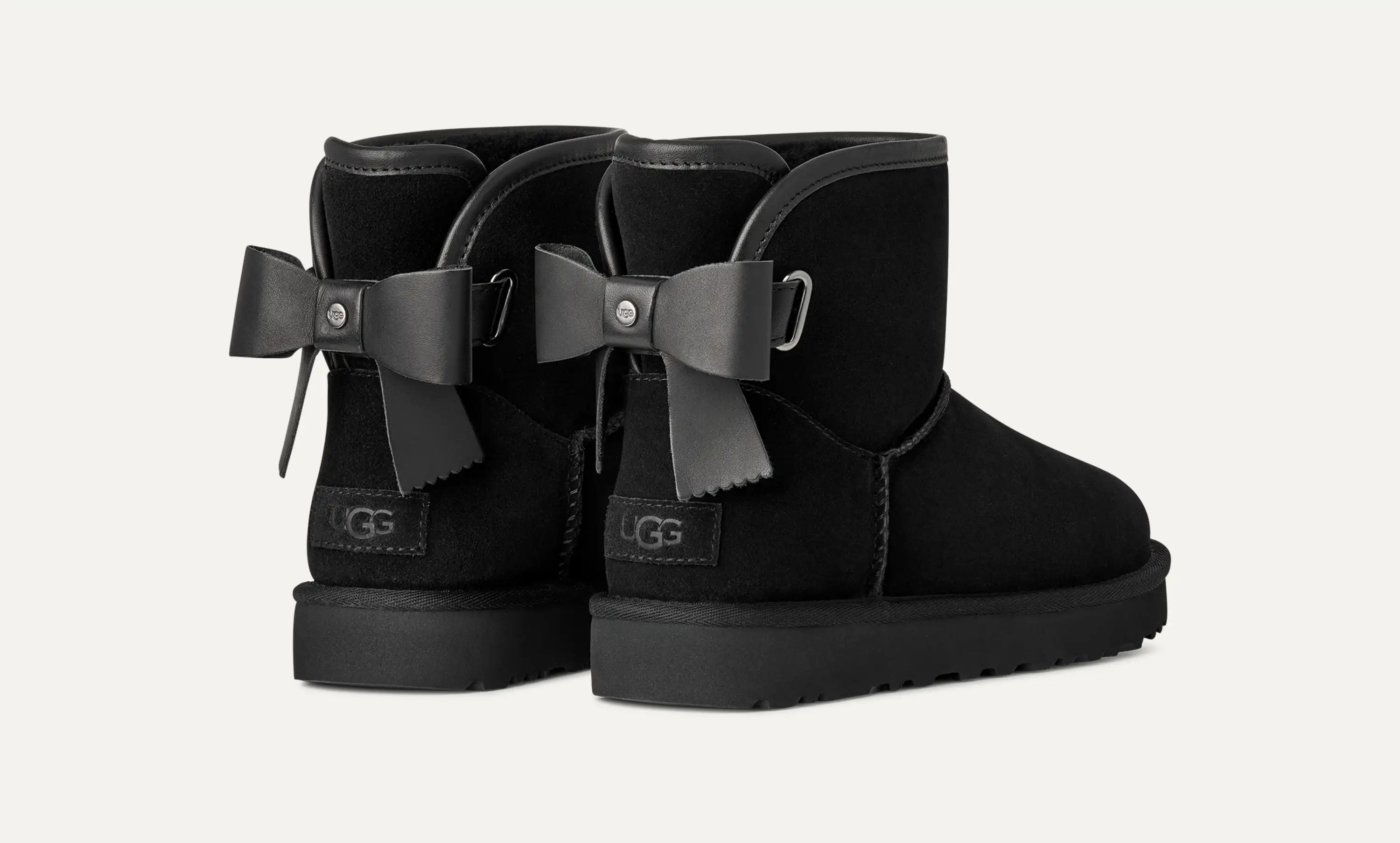 The boot you know and love with a leather bow at the back. Our Ultra Mini Bailey Leather Bow is made with subtle touches of metal hardware, a sugarcane EVA outsole, and a super soft microfiber lining.