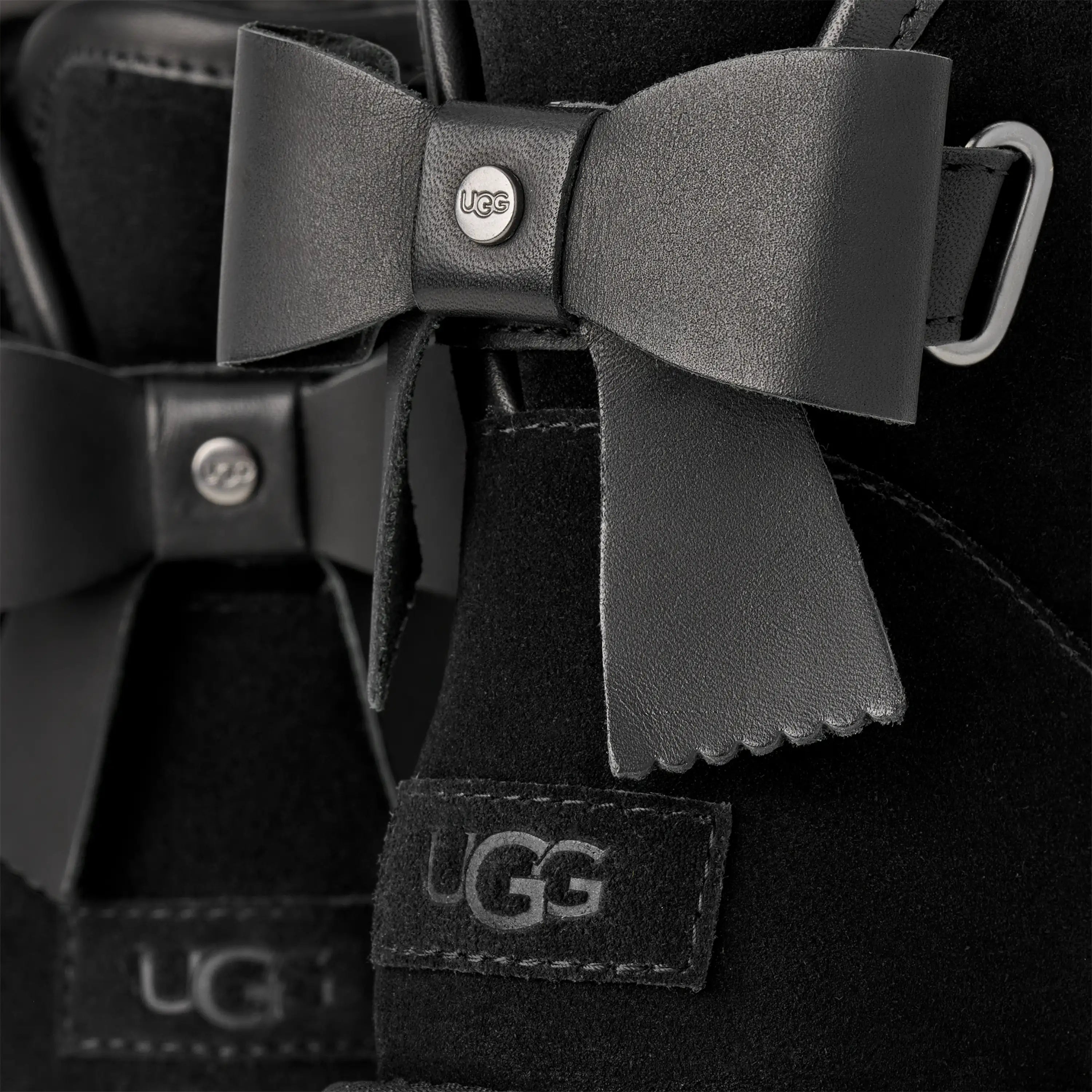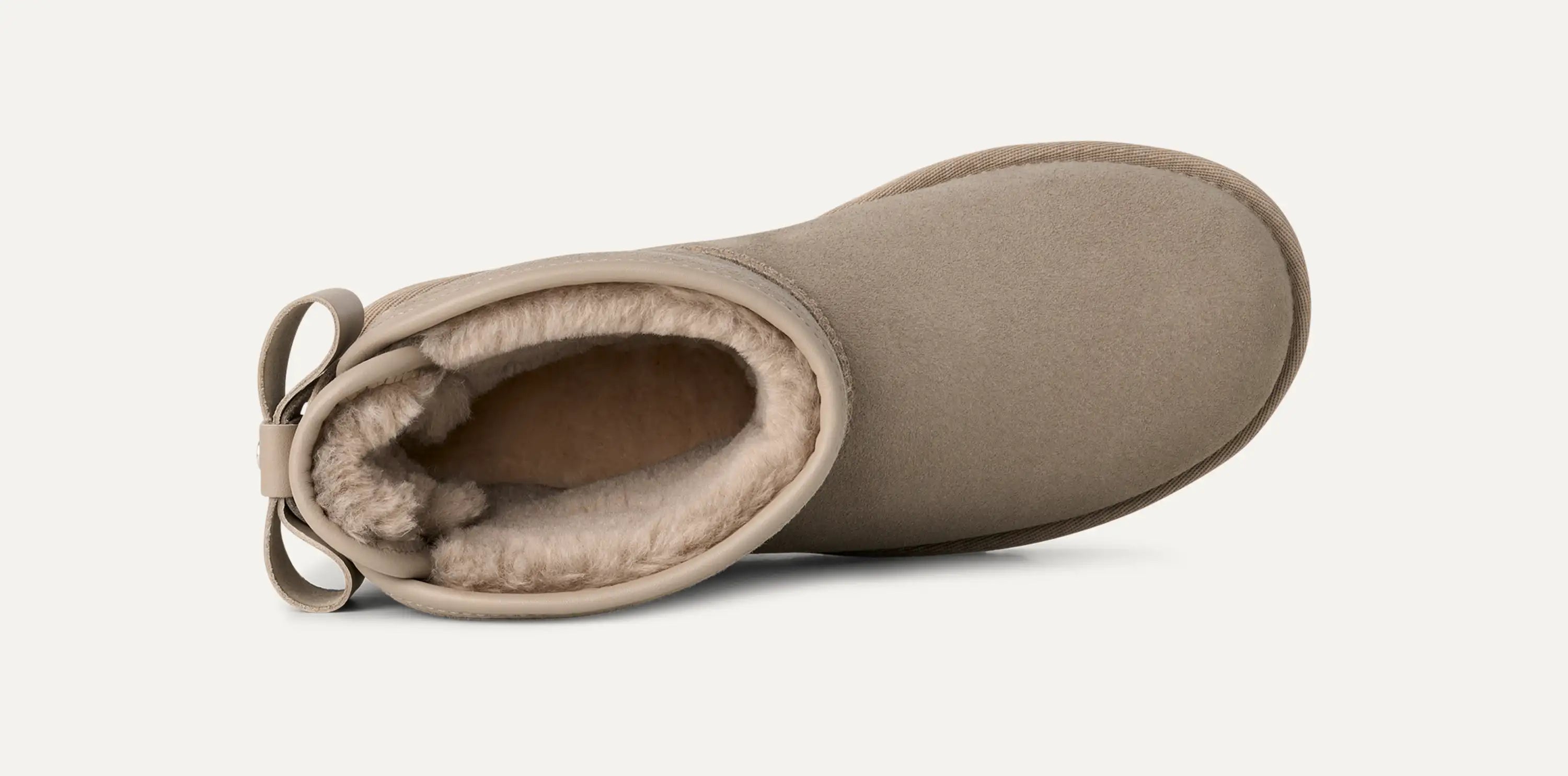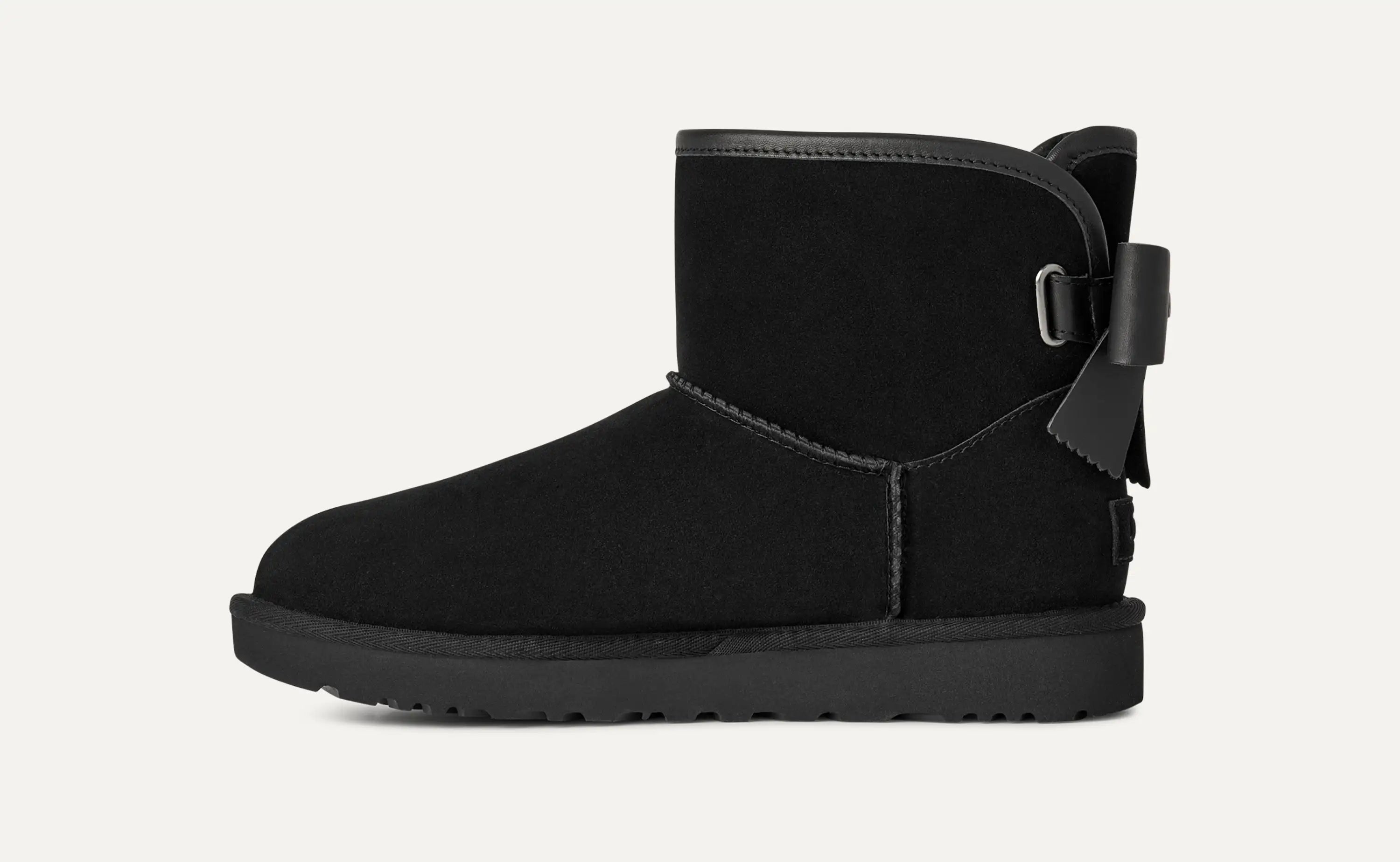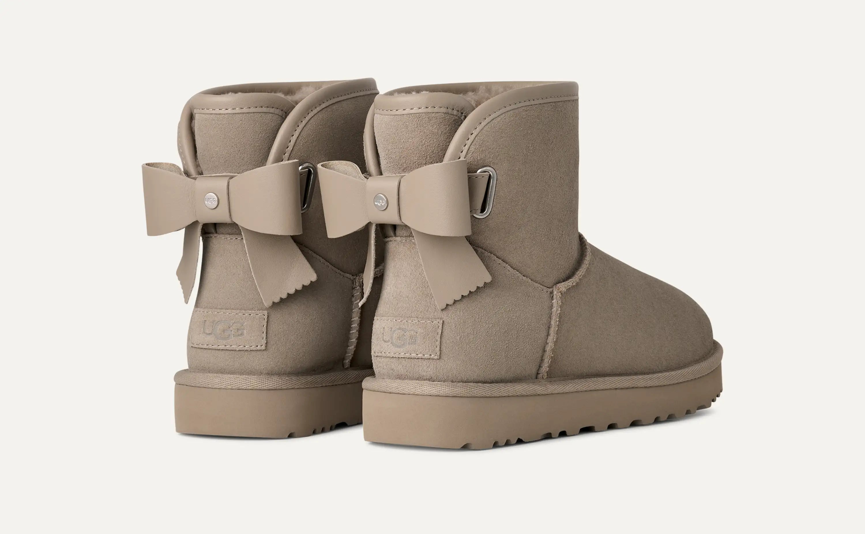 The boot you know and love with a leather bow at the back. Our Ultra Mini Bailey Leather Bow is made with subtle touches of metal hardware, a sugarcane EVA outsole, and a super soft microfiber lining.