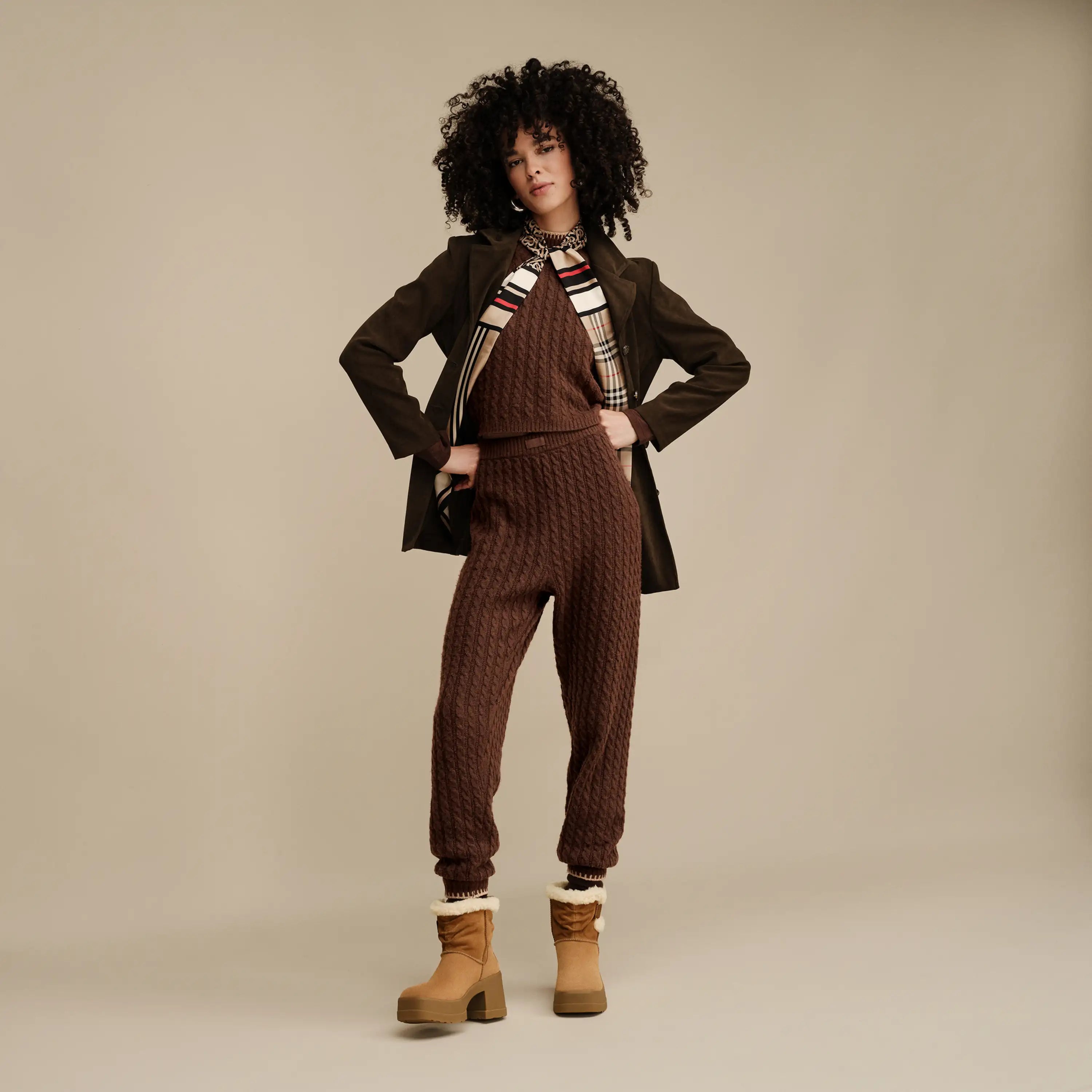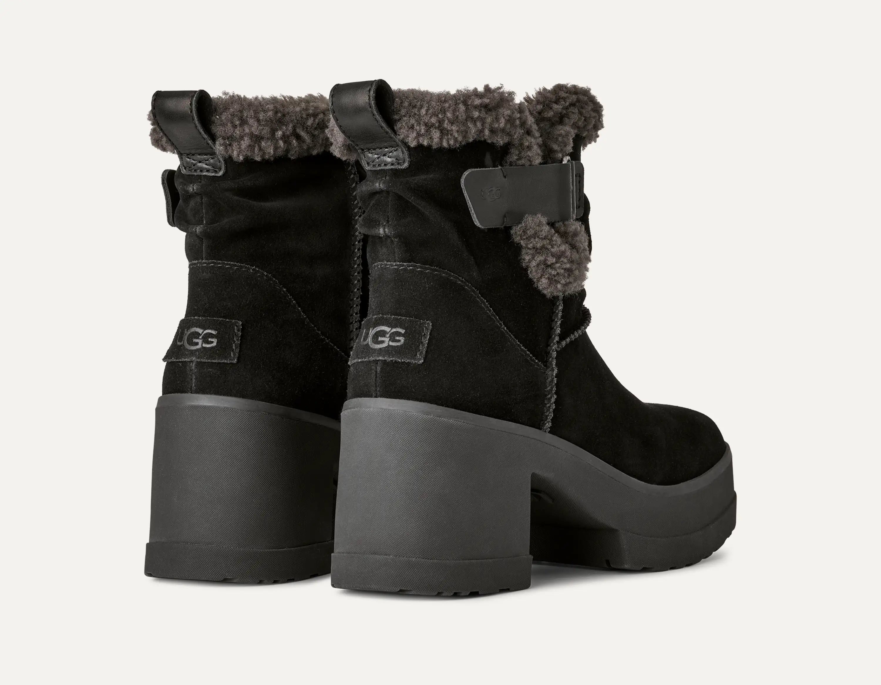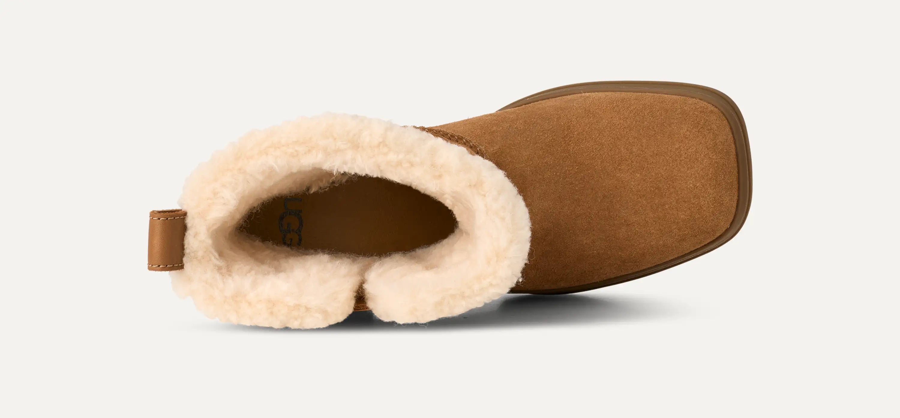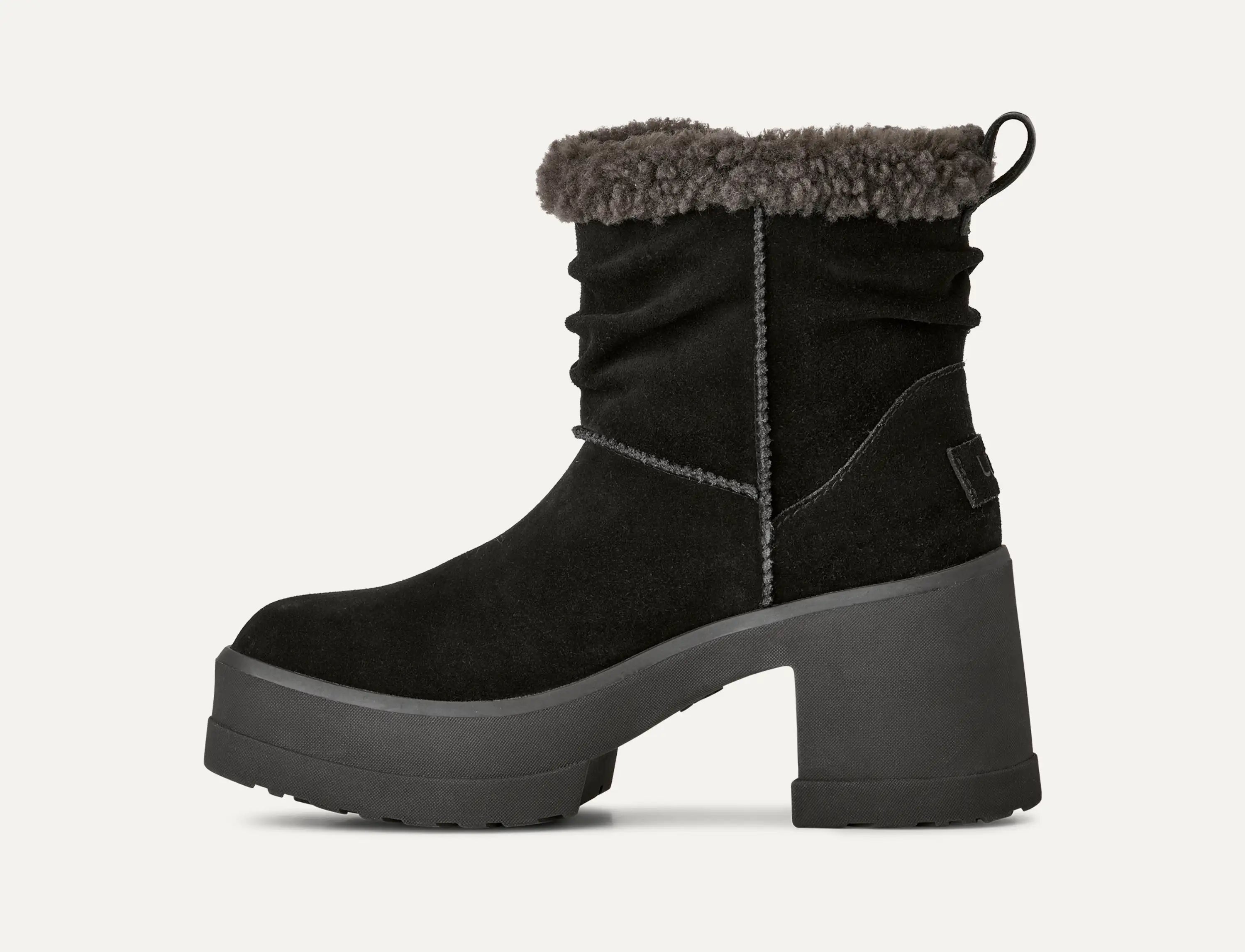 Our Moxy Pull On takes the bold lug tread of our Brooklyn and infuses it with a rich mix of suede and leather. Steeped in UGG® heritage, this boot has The Twin Seam details and a plush, curly sheepskin collar. It's boosted on a 3.2" platform and 4.5" heel made from lightweight rubber with an EVA fill.