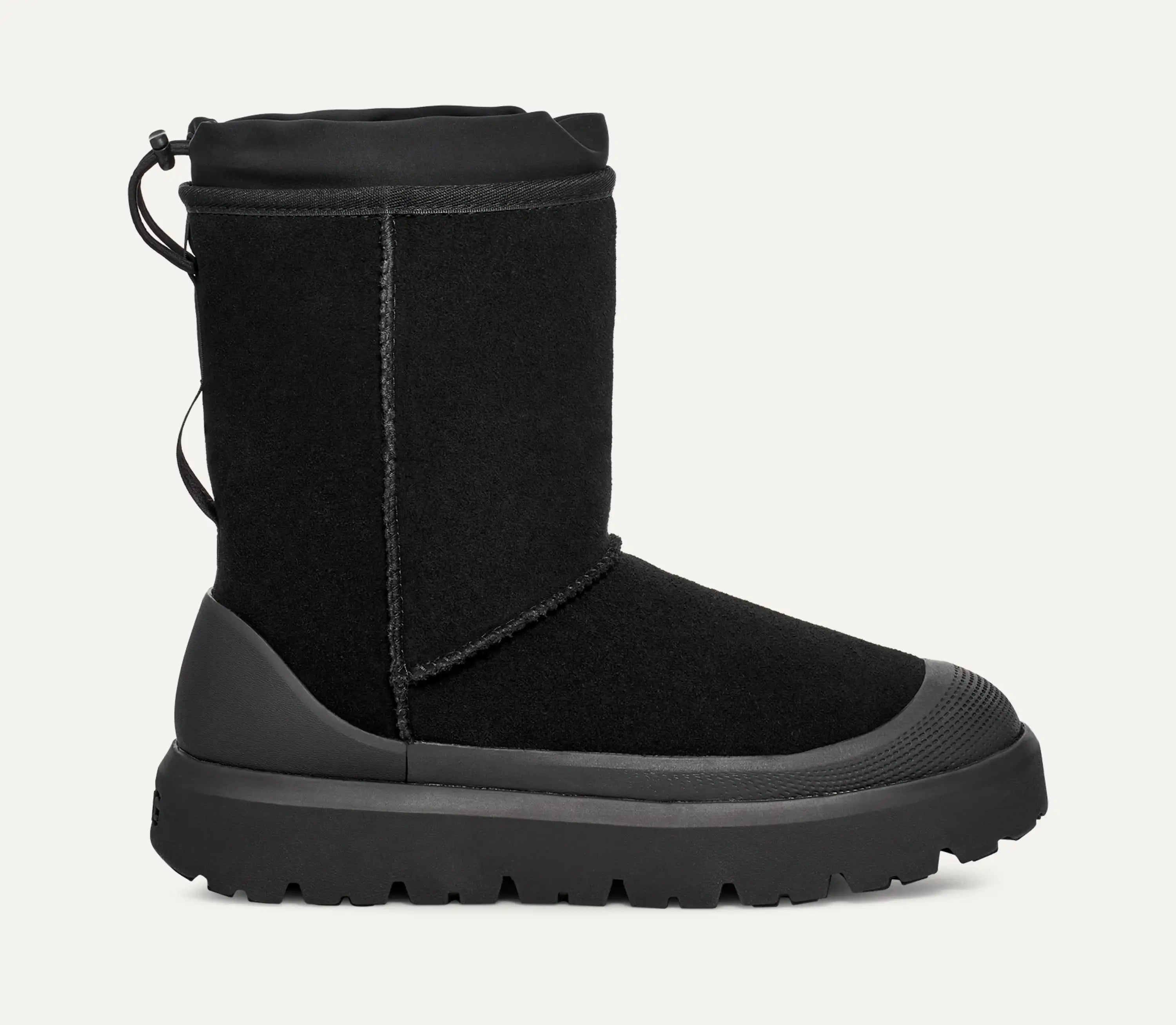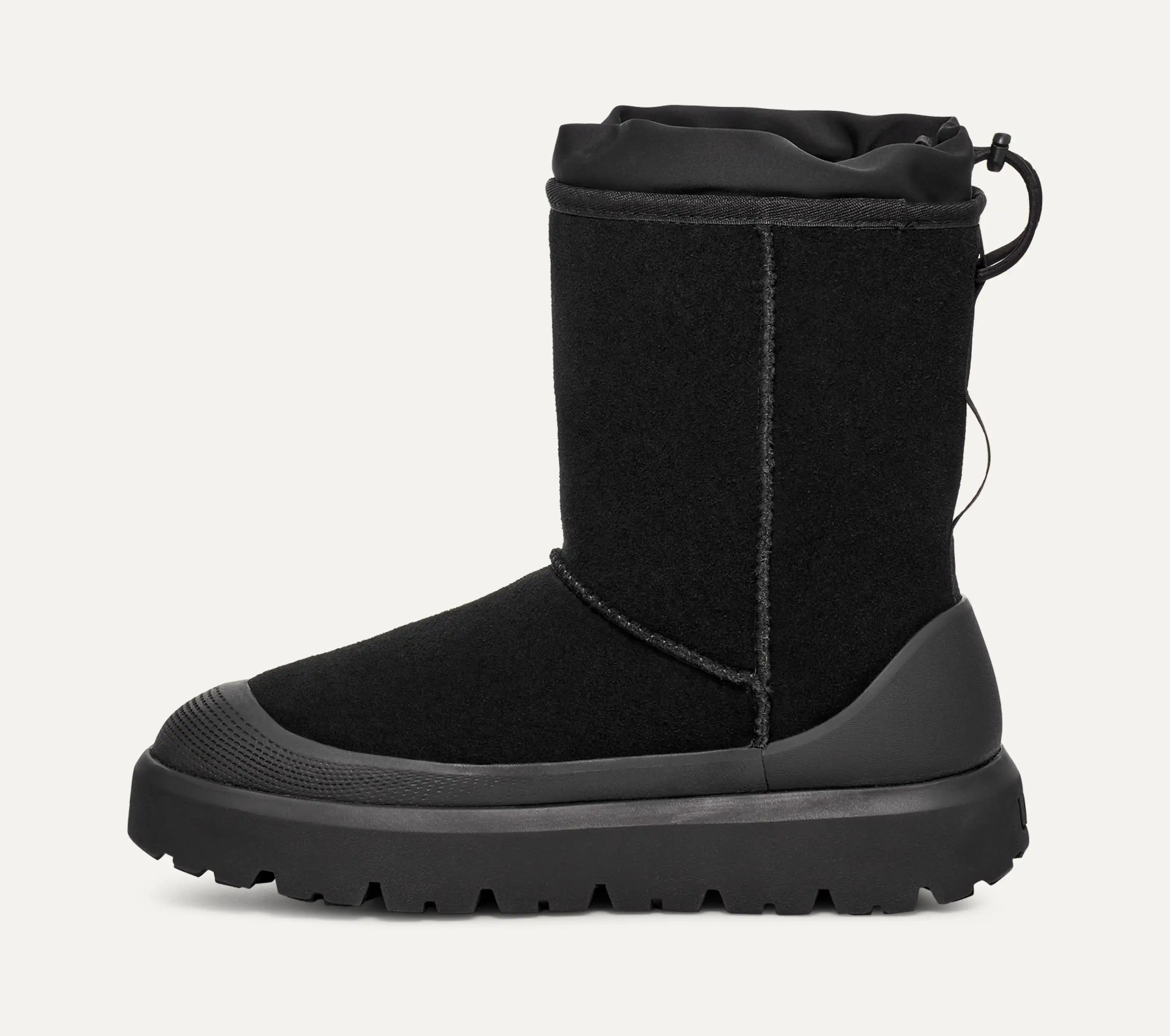 Our iconic Classic Boot gets a weatherized upgrade. The Classic Short Weather Hybrid's soft suede now offers waterproof defense against the elements. it's lined in our UGGplush™ upcycled wool blend and finished with an outsole made from renewable, rainwater-nourished sugarcane for all-day cushioning and a signature Classic-like feel. Featuring Spider Rubber™ outsole pods for traction.