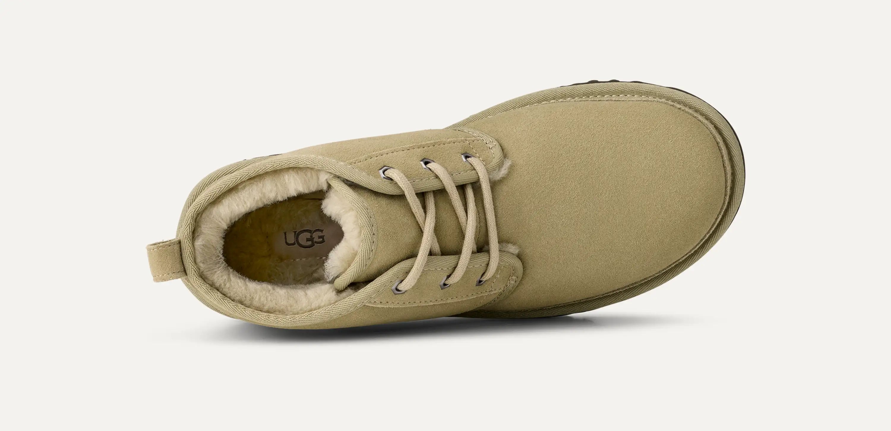 Combining premium materials and effortless style, our Neumel is our iconic Heritage chukka. A timeless boot made of rich suede, it's lined in upcycled UGGplush™ wool and finished with a durable outsole for all-day cushioning, offering a signature slipper-like feel indoors or out.