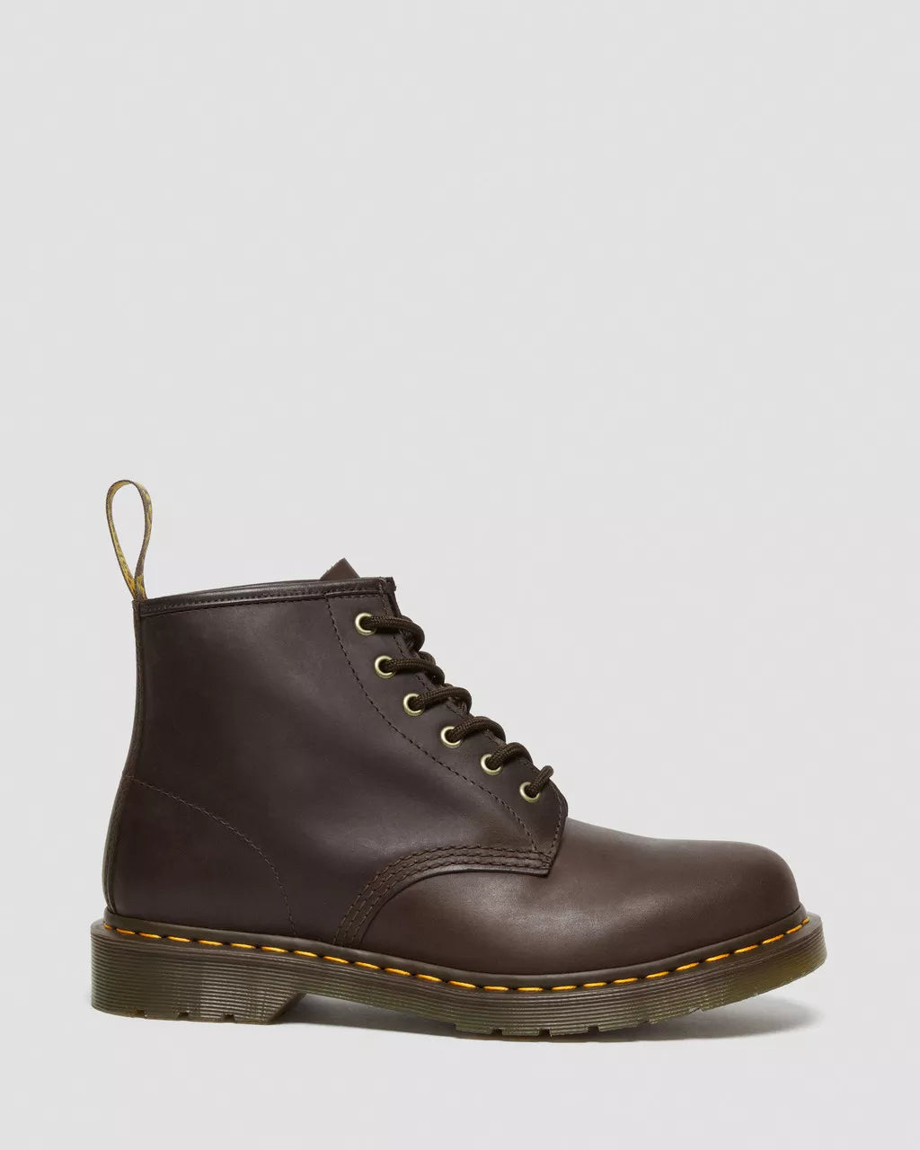 Crazy Horse leather is a well-worn DM’s classic and a mainstay of our most iconic silhouettes. A heavyweight leather that looks beaten up and worn-in from the first step — and only gets better with age. We’ve rebuilt our sleek 6-eye 101 boot with Crazy Horse leather, detailed with brass eyelets and brown laces. Welted on our rugged air-cushioned sole and marked with signature yellow welt stitching. Finished with a scripted AirWair heel loop.Made for workers. Subverted by rebels. The 101 boot packs all our unmistakable DNA into a sleek 6-eye silhouetteCrazy Horse is a heavyweight leather with a tough, textured appearance — designed to look worn in from the first stepA pillar of DM’s construction. Our Original and most recognizable sole. A height of 1 1/8 inch — marked by traditional DMS tread pattern that's unique to Dr. Martens. One of our most flexible soles, well known for its comfort and stabilityConstruction - Made with our Goodyear-welted lines that are heat-sealed at 700˚C and reinforced with our signature welt stitchStandard last - Recommended for all feet, but perfect for average to wide width feet