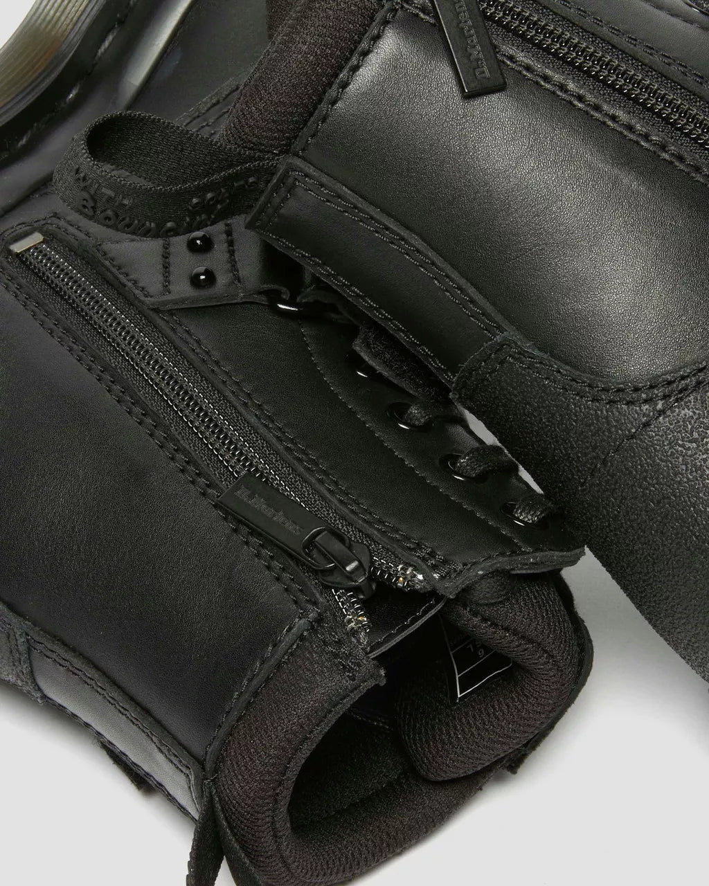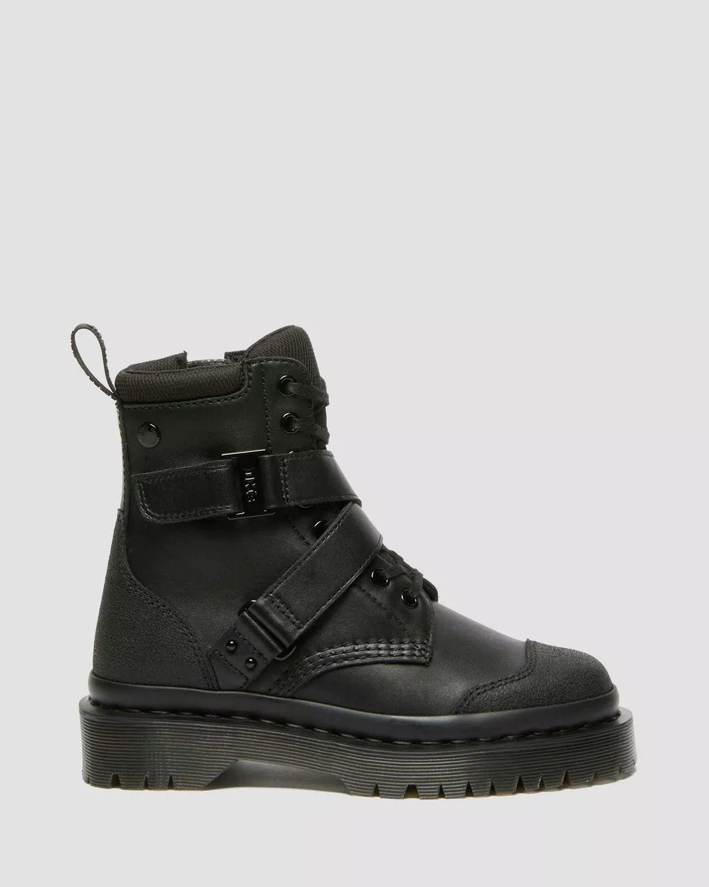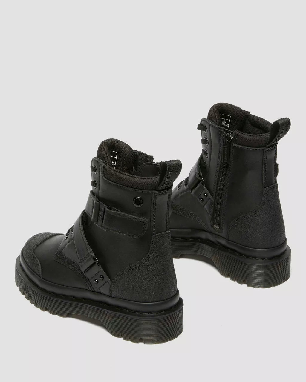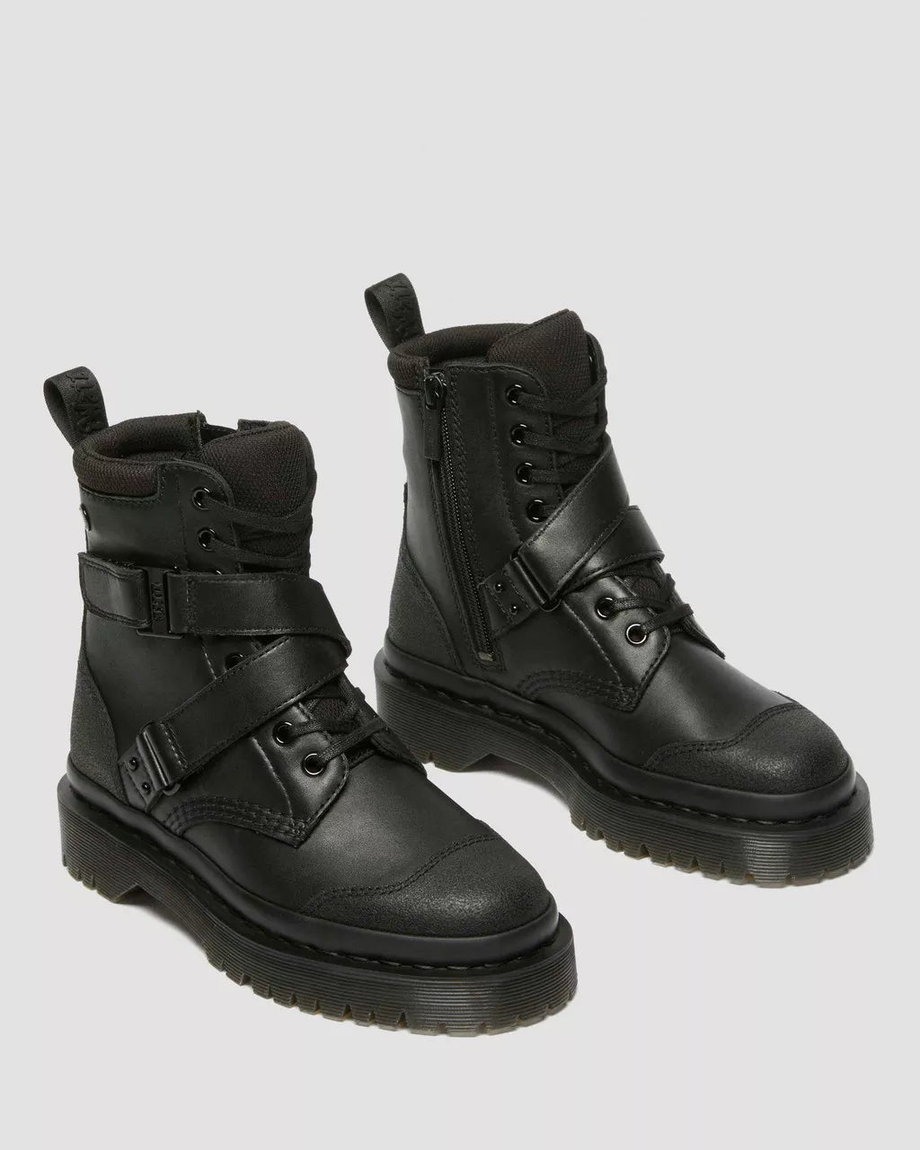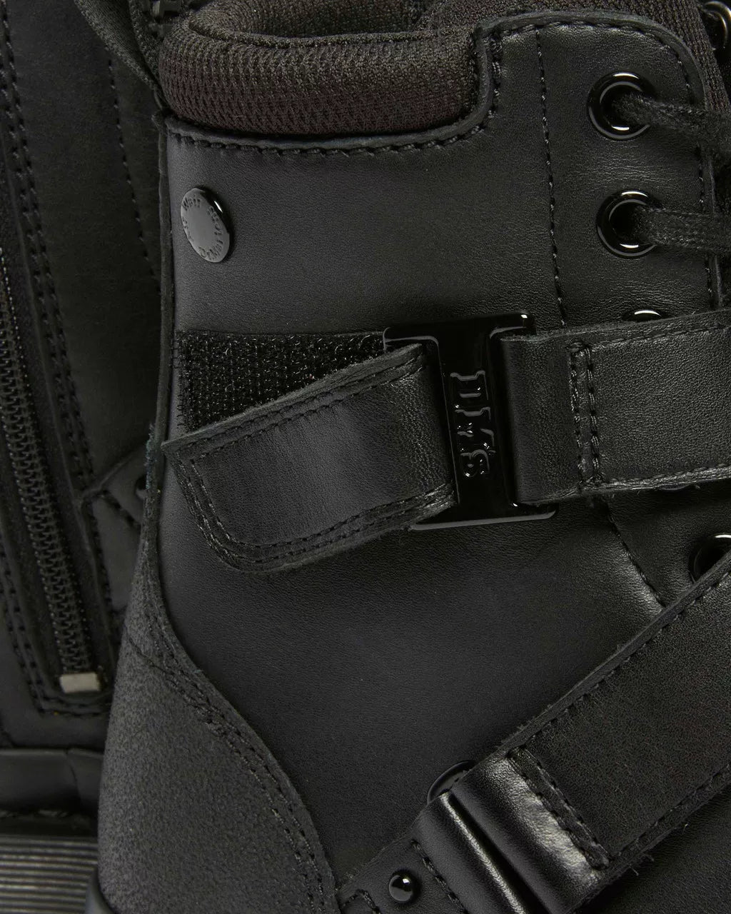Lace up. Strap in. Our latest iteration of the 1460 boot comes topped with adjustable straps that wrap around the upper. Flat laces elevate the 8-eye silhouette, and a fully monochrome finish includes an all-black heel tab, hardware and stitching. The style is welted onto a raised Bex sole offering a slight lift.