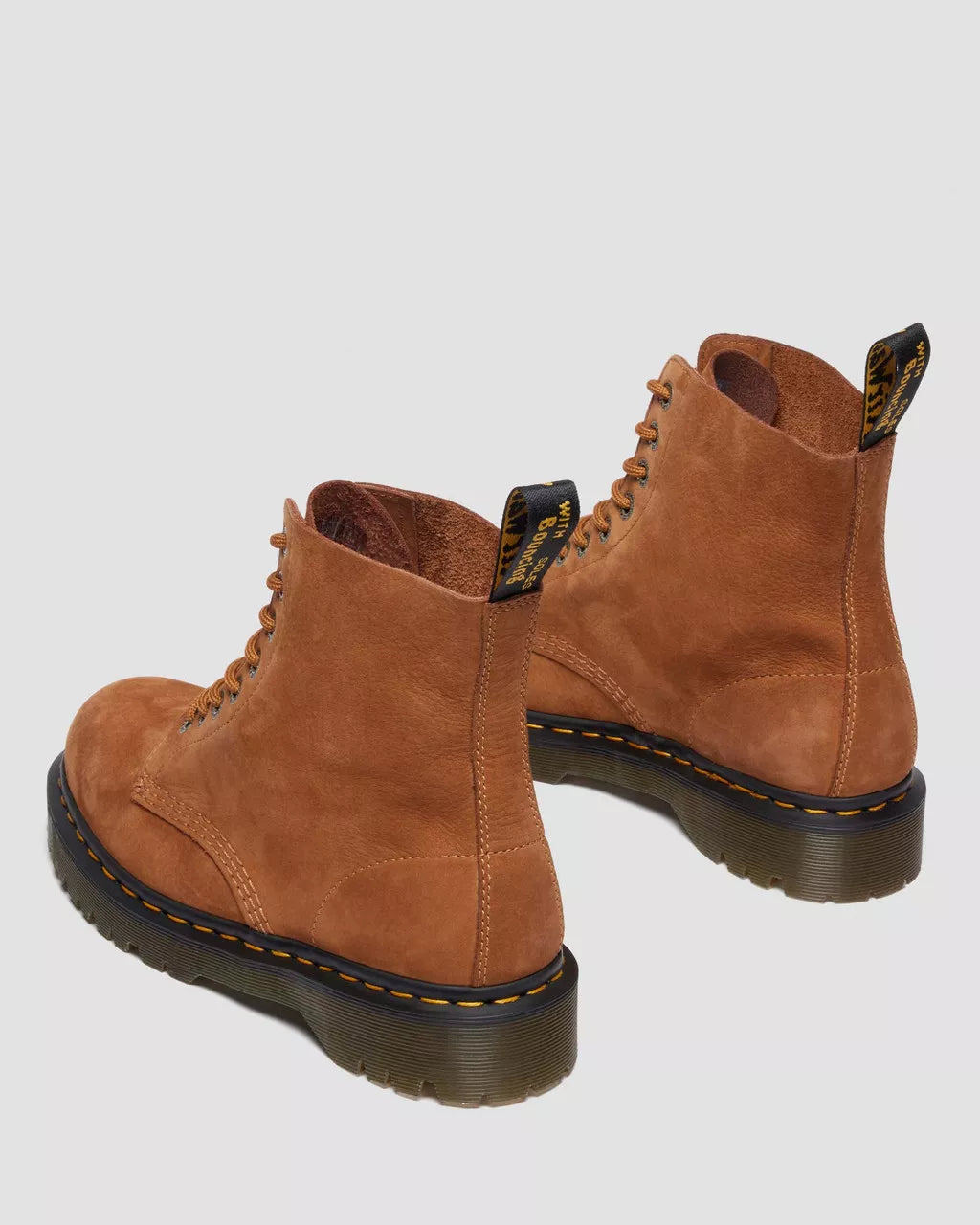 A tumbled transformation. Our fan favorite silhouette takes on a softer form as the 1460 Pascal Bex 8-eye boot. Milled Nubuck leather is known for its relaxed and silk-like feel, giving the boot a more supple finish. But the silhouette retains the toughness and quality of a classic DM’s boot, underscored by our signature detailing: a scripted heel loop. Yellow welt stitching. And a slightly raised trans Bex sole – taller than the original DMS sole but not as high as a platform.