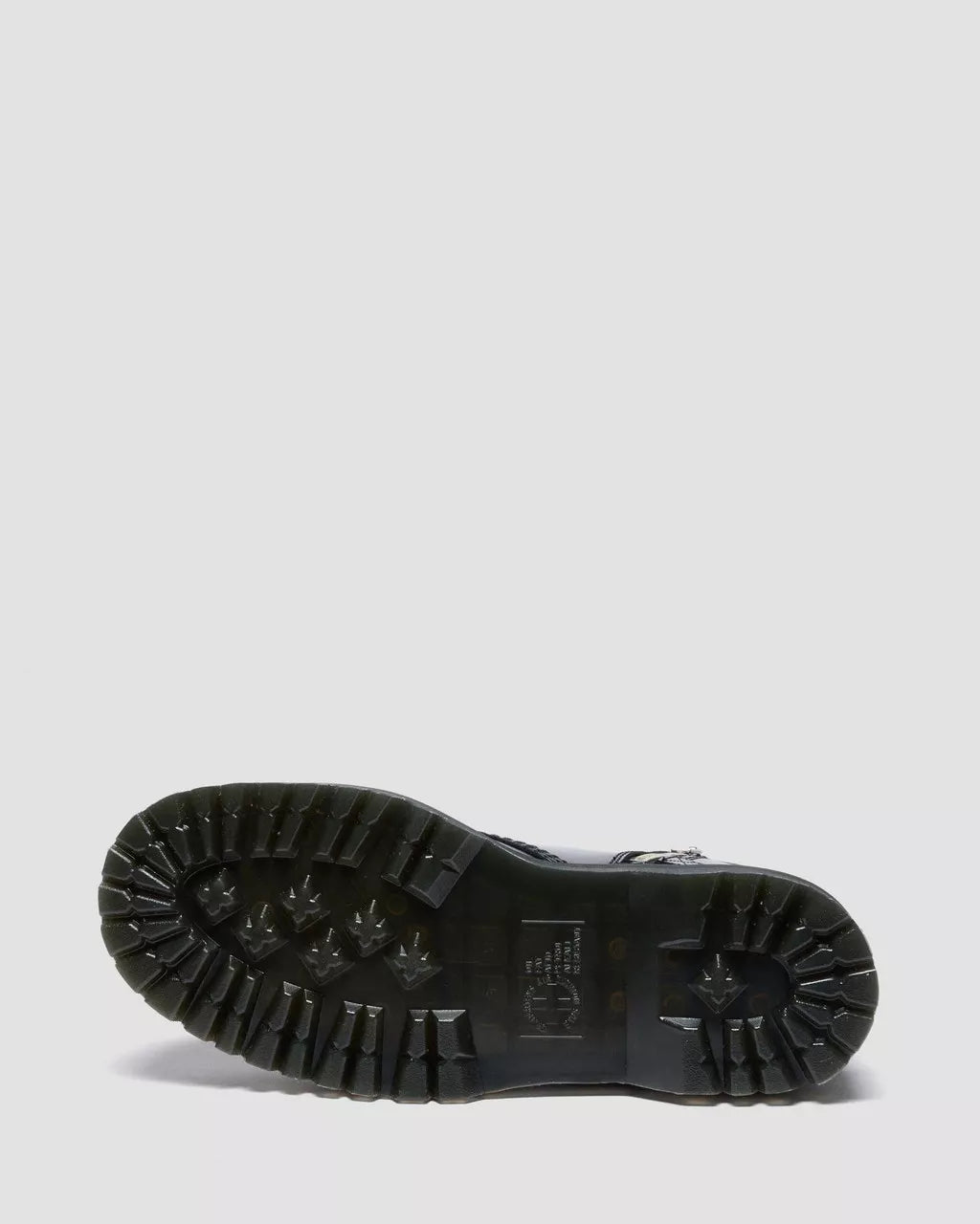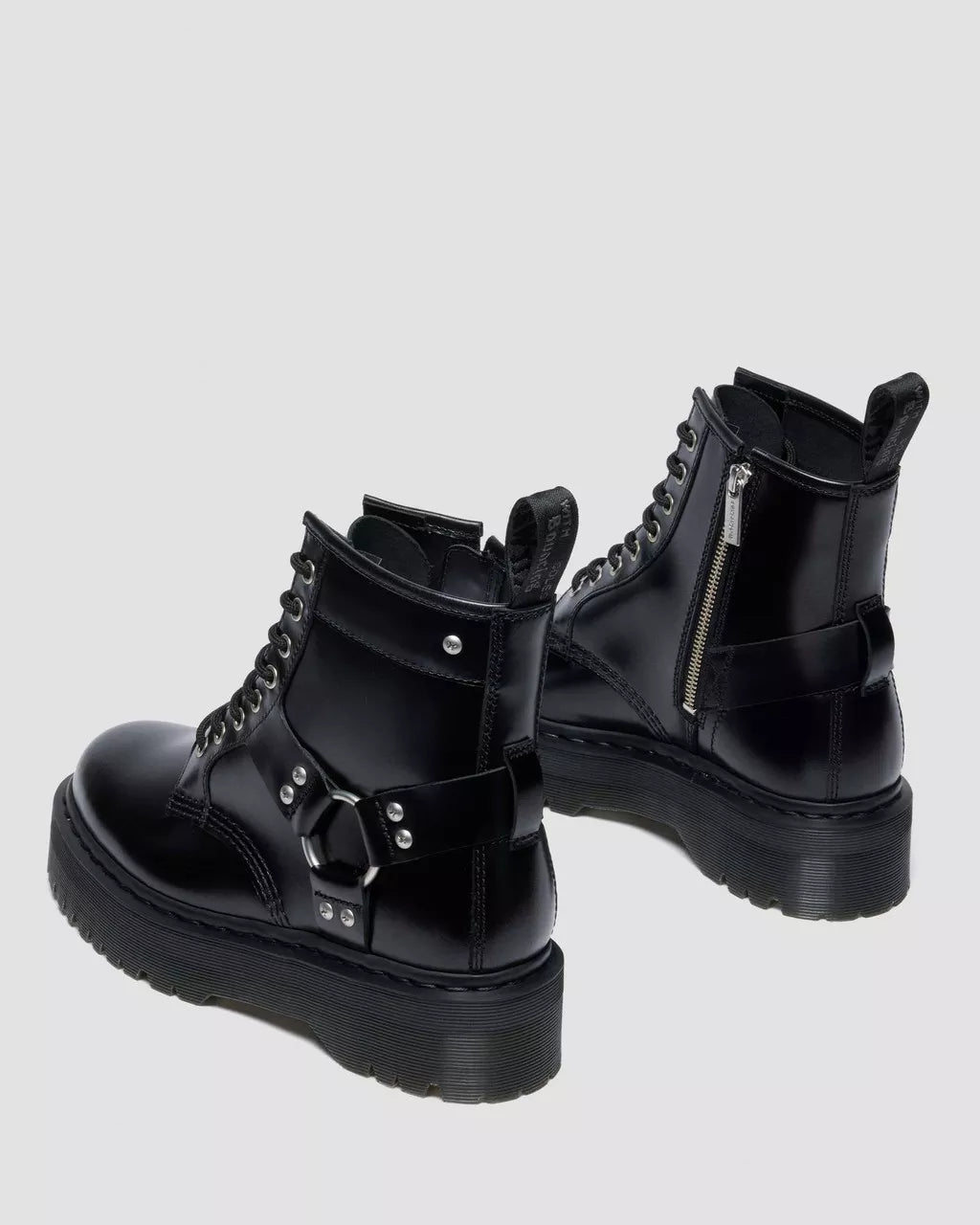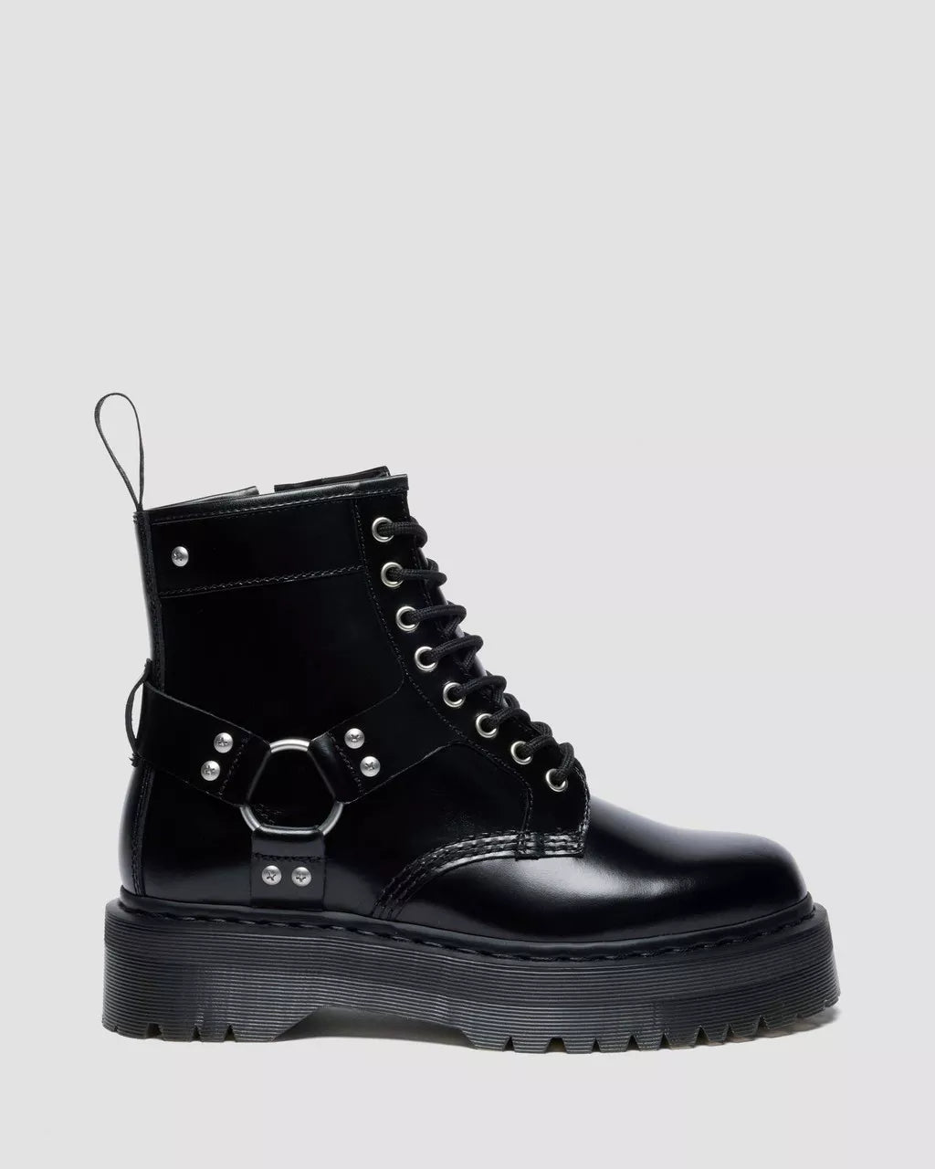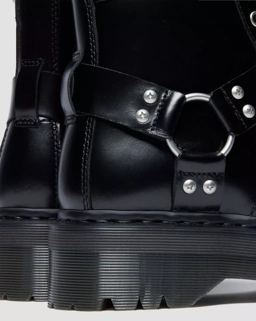 Strapped in but unrestrained. The 1460 Quad Harness 8-eye boot armors up in contrast hardware on high-gloss black leather. Known for its smooth finish and strong wax coat, Analine leather is a force of durability. Decorated with silver eyelets and harness detailing, other features are dialed down in subtle monochrome: a black and gunmetal heel loop, black welt stitching and black Quad sole for greater height – and impact.