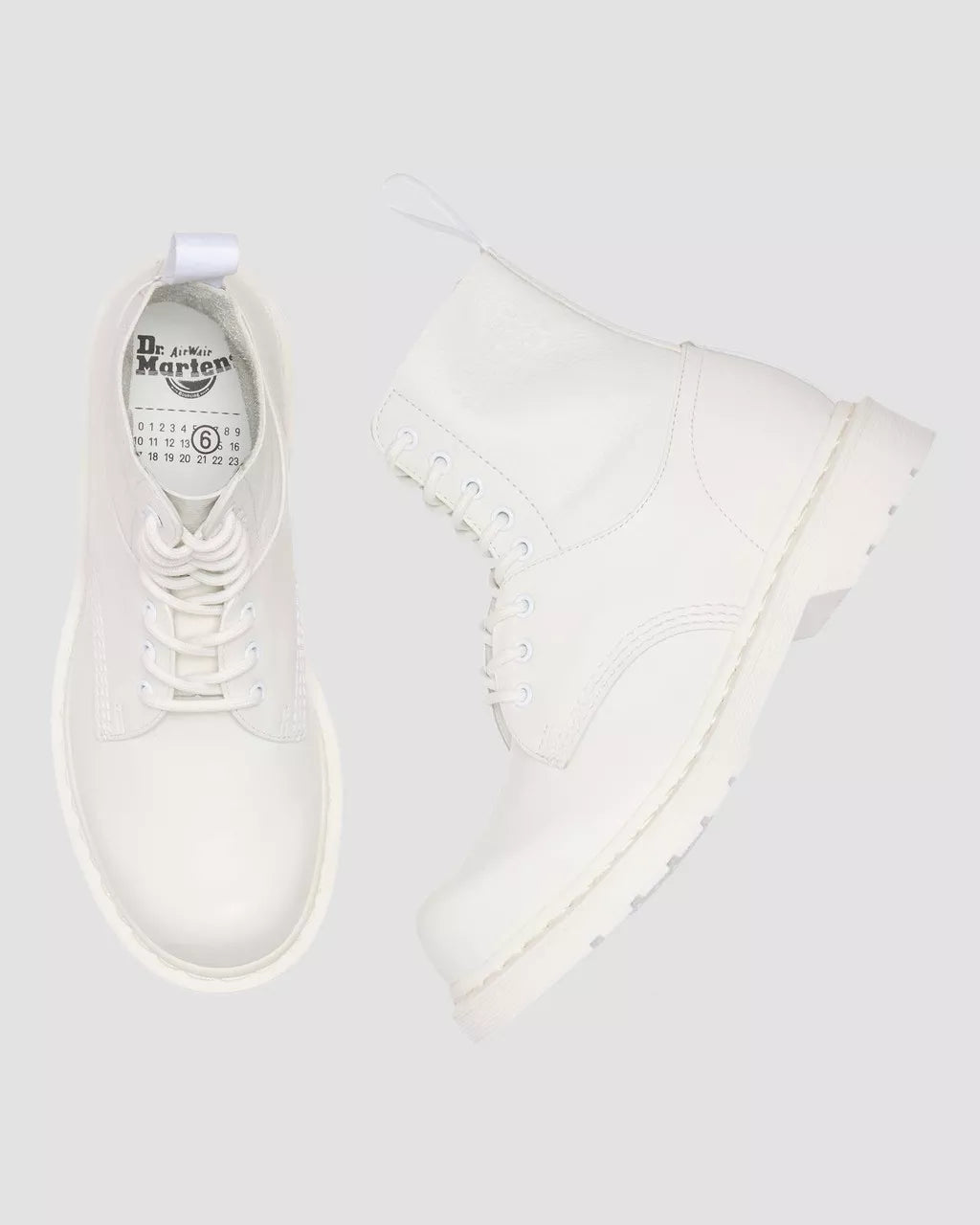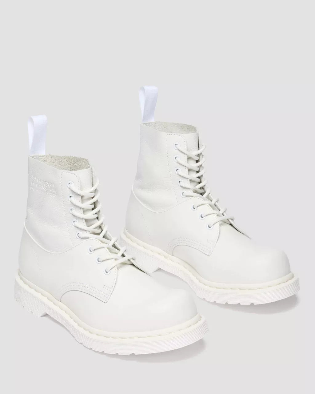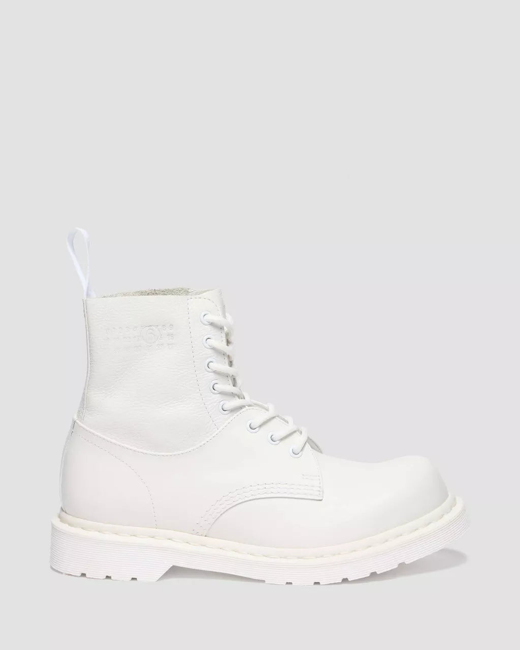 A collision of icons. Our 1460 8-eye boot is reimagined through the lens of MM6, fused with the 1461 shoe to create a hybrid silhouette with an exaggerated bump toe. The unexpected boot combines soft Virginia leather and Smooth leather for contrast in texture. Finished in a triple white execution, with tonal eyelets, laces, and stitching. MM6’s debossed numeric signature marks the ankle, and our white-on-white AirWair heel loop signs it off. Set on a white DMS sole and constructed with our signature Goodyear welt.