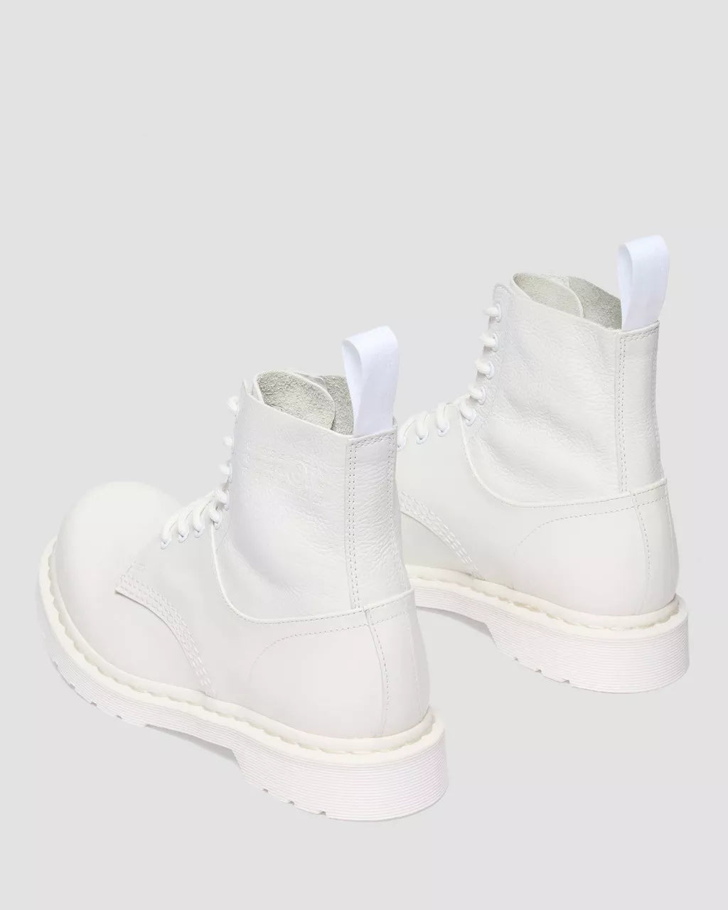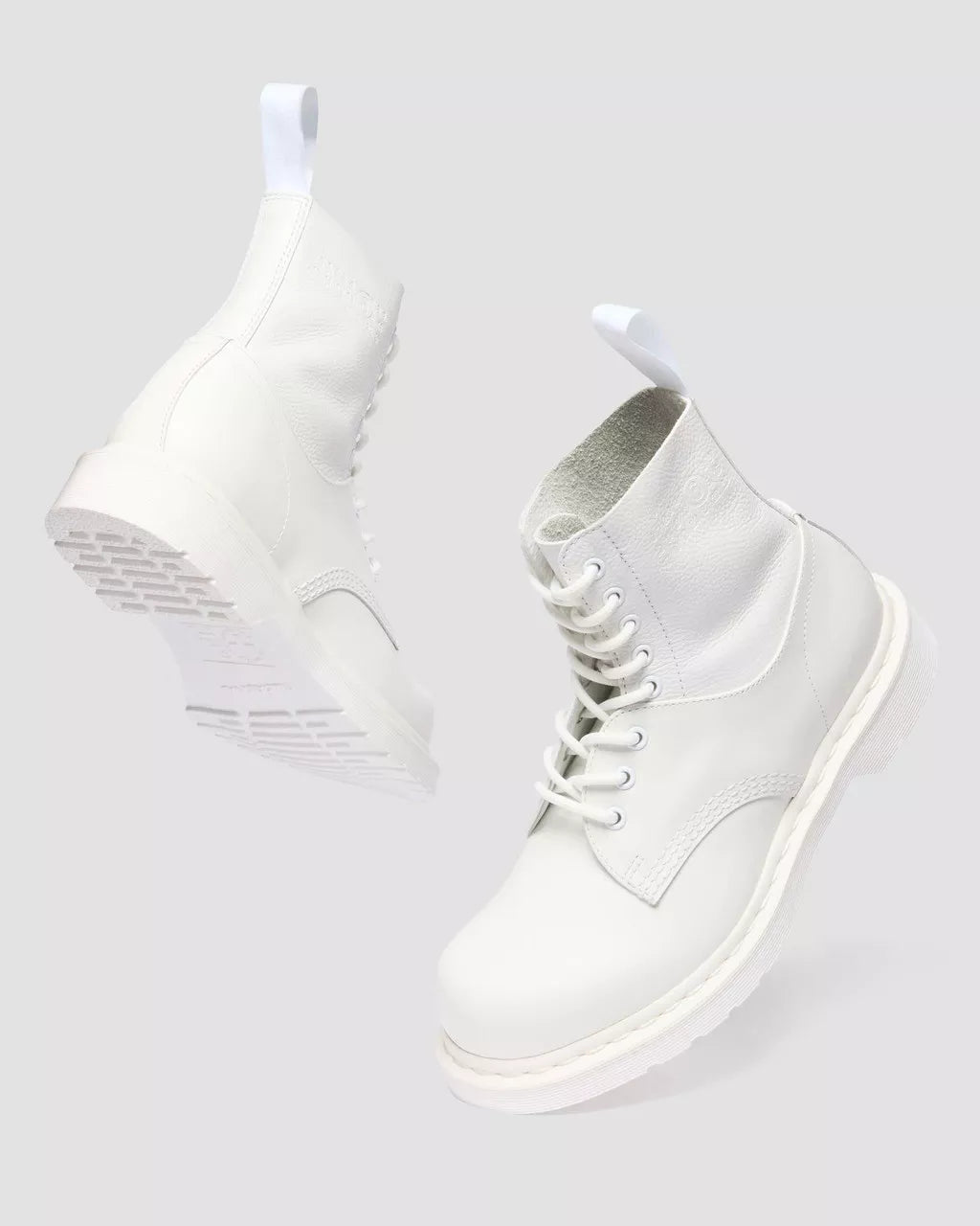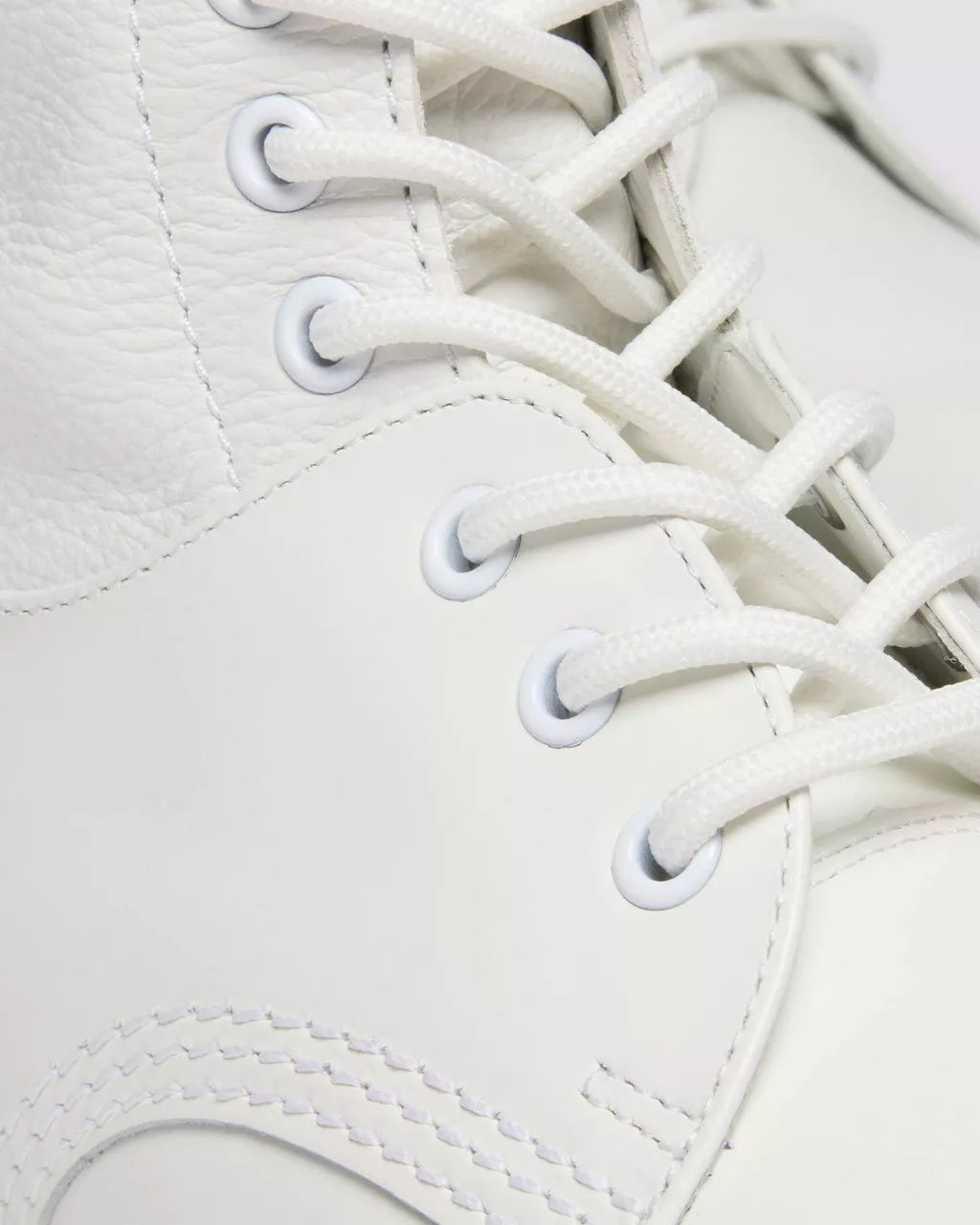 A collision of icons. Our 1460 8-eye boot is reimagined through the lens of MM6, fused with the 1461 shoe to create a hybrid silhouette with an exaggerated bump toe. The unexpected boot combines soft Virginia leather and Smooth leather for contrast in texture. Finished in a triple white execution, with tonal eyelets, laces, and stitching. MM6’s debossed numeric signature marks the ankle, and our white-on-white AirWair heel loop signs it off. Set on a white DMS sole and constructed with our signature Goodyear welt.