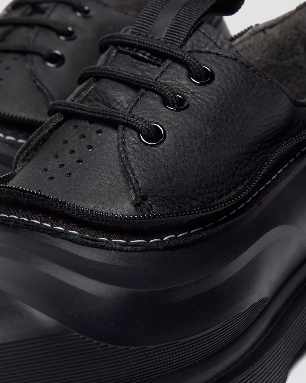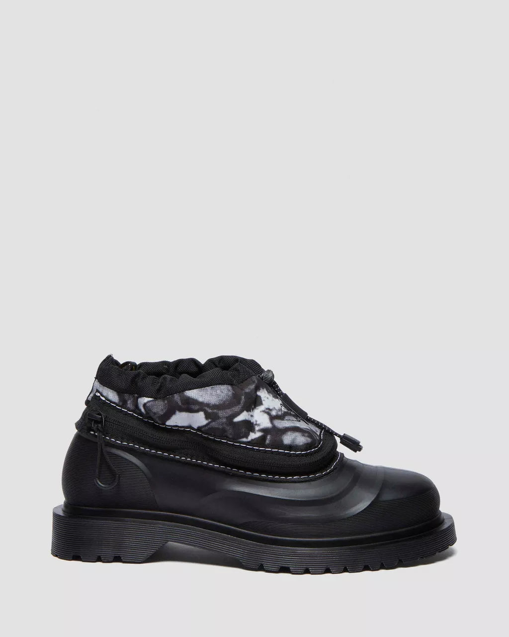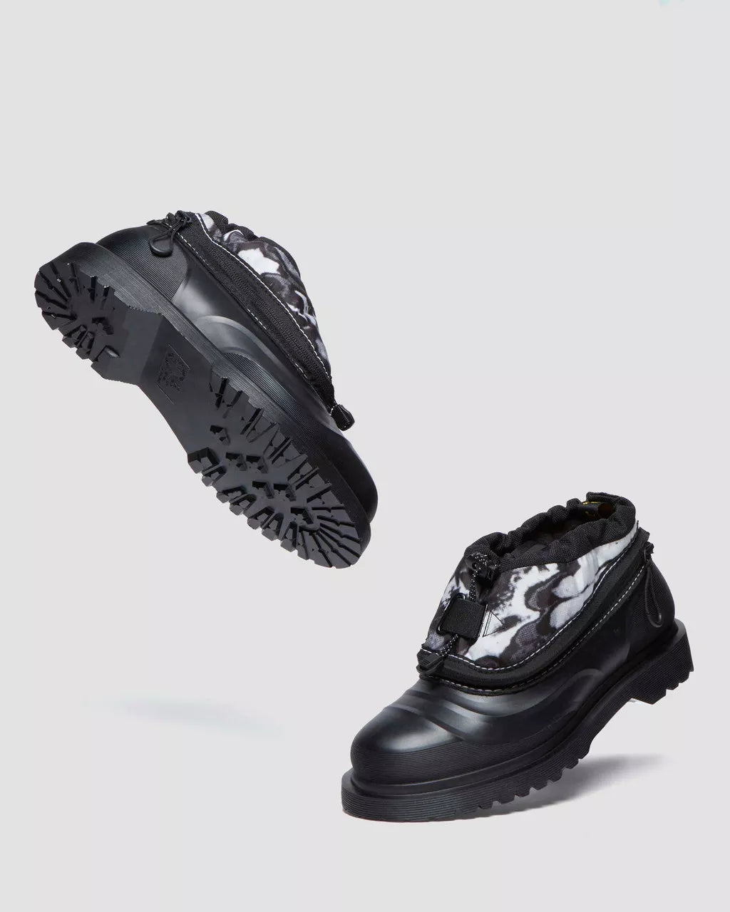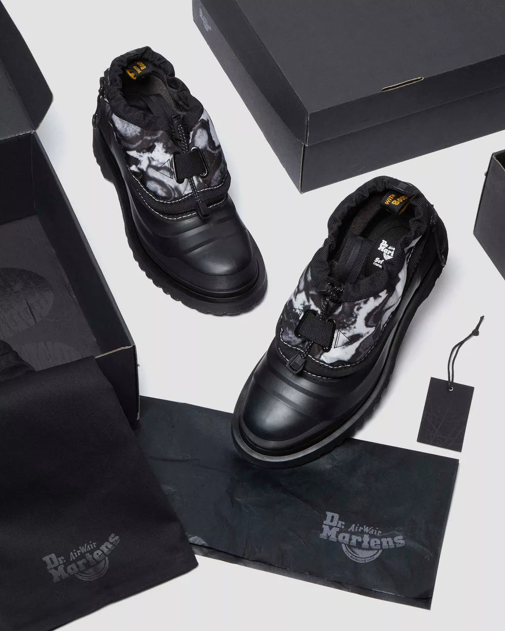 Weather protection innovation. The 1461 shoe evolved into the 14XX Sub Shoe. An exxperimental construction fusing a waterproof base/outsole unit with a water-resistant Tailgate leather upper. Augmented with removable, adjustable gaiters built from lightweight Extra Tough 50/50 and Re-RipStop. The 3-eye boot and gaiter are both lined with WarmWair and DryWair fleece for additional cold and water protection. Set on a SoftWair insole for padded ergonomic comfort. Dr. Martens DNA is on display with an AirWair heel loop.14XX. A continuum of exxperimentation. Testing the boundaries of Dr. Martens traditional design language. Heritage silhouettes viewed through the lens of an unknown future.