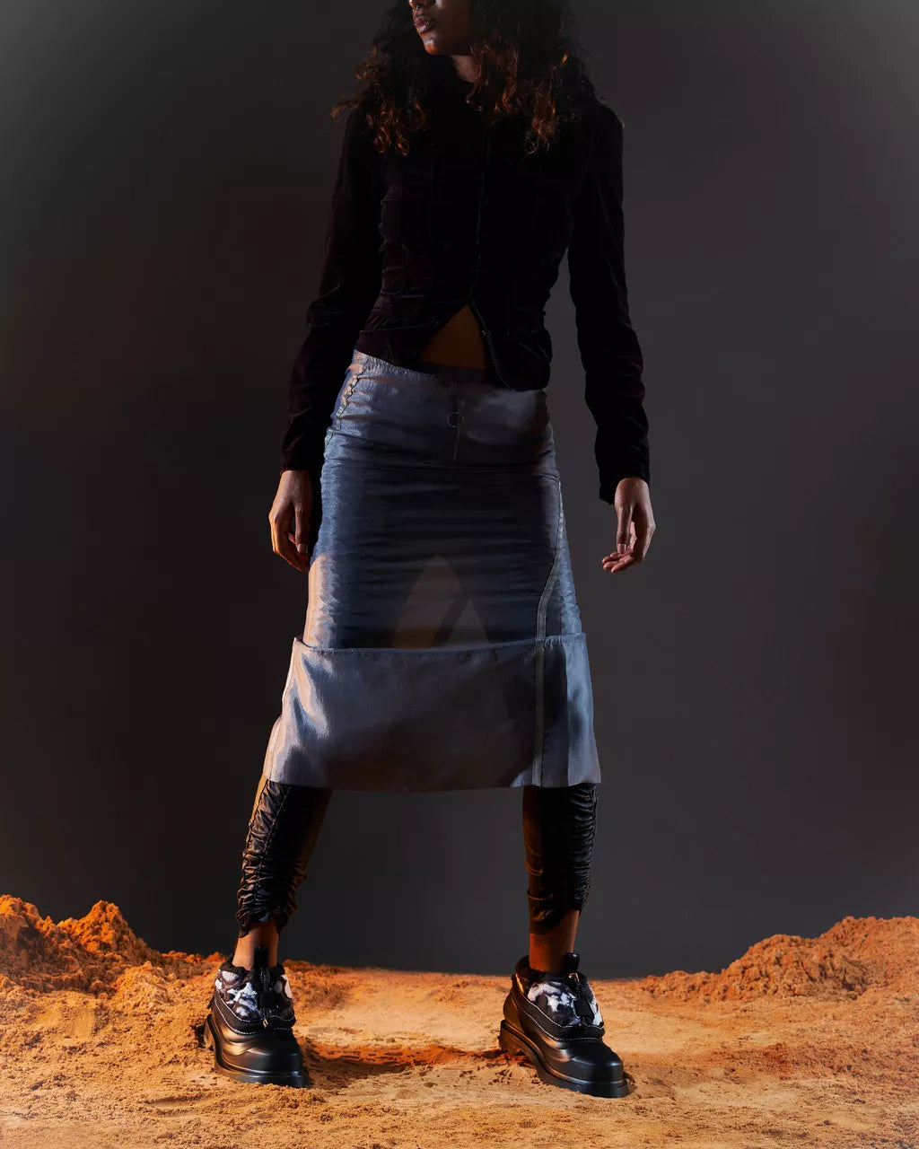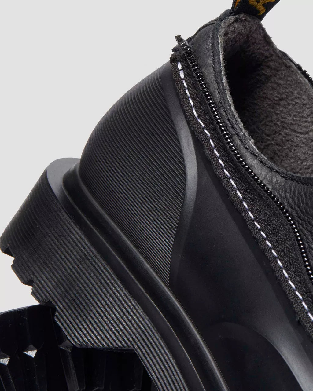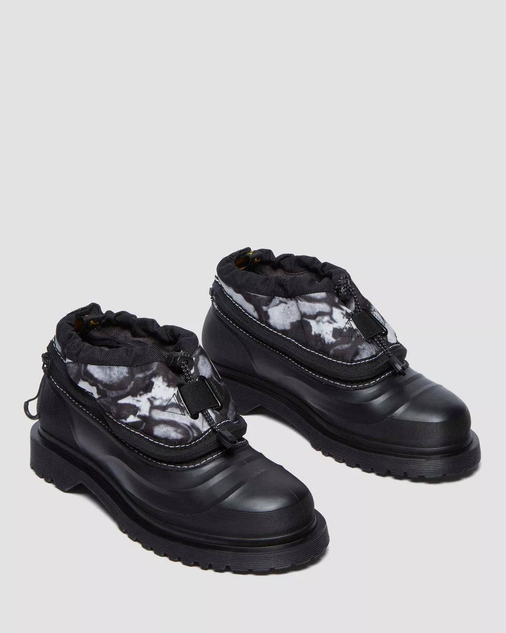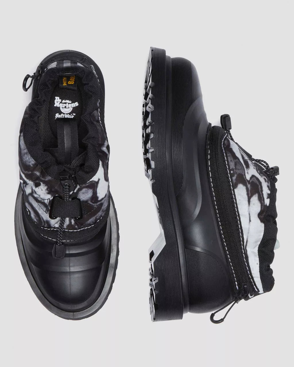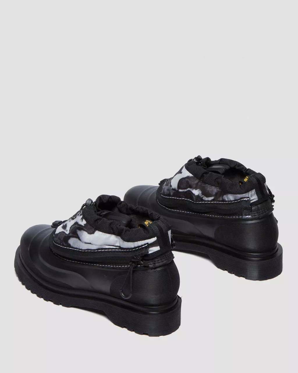 Weather protection innovation. The 1461 shoe evolved into the 14XX Sub Shoe. An exxperimental construction fusing a waterproof base/outsole unit with a water-resistant Tailgate leather upper. Augmented with removable, adjustable gaiters built from lightweight Extra Tough 50/50 and Re-RipStop. The 3-eye boot and gaiter are both lined with WarmWair and DryWair fleece for additional cold and water protection. Set on a SoftWair insole for padded ergonomic comfort. Dr. Martens DNA is on display with an AirWair heel loop.14XX. A continuum of exxperimentation. Testing the boundaries of Dr. Martens traditional design language. Heritage silhouettes viewed through the lens of an unknown future.
