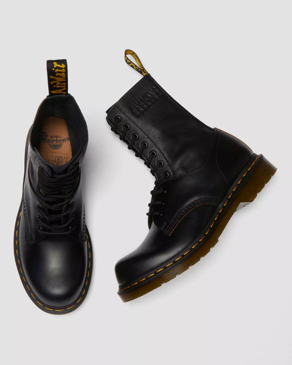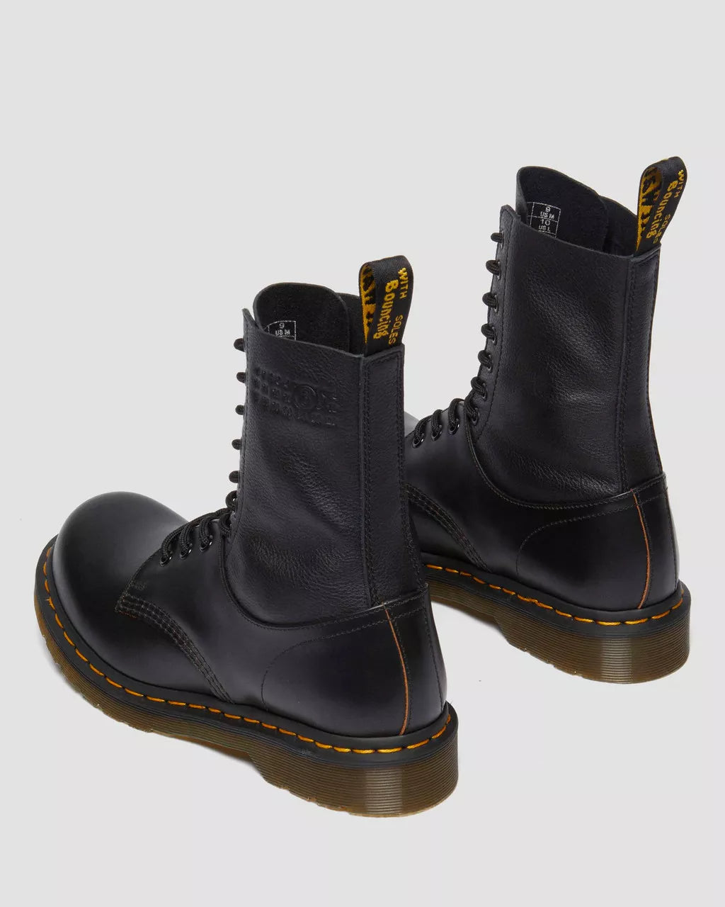 A reconstruction of foundational silhouettes. The 1490 boot fused with a bump toe 1461 shoe. The 10-eye hybrid is built from a combination of extra-soft Virginia and durable Vintage Smooth leather to accentuate the contrast between the boot and shoe forms. Debossed with the MM6 numeric signature and engrained with their deconstructivist approach to design. Set on the foundational DMS outsole with a yellow welt stitch. Finished with an AirWair heel loop.