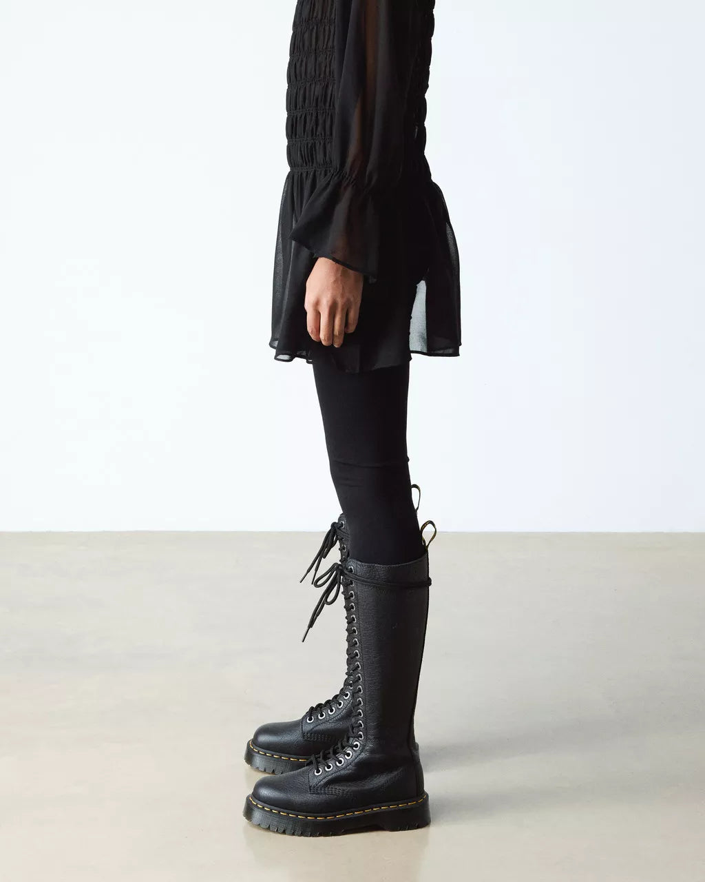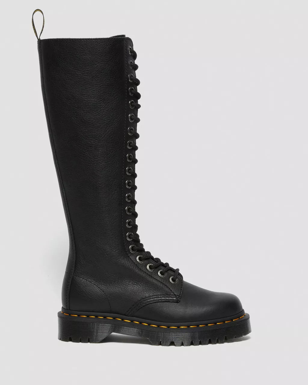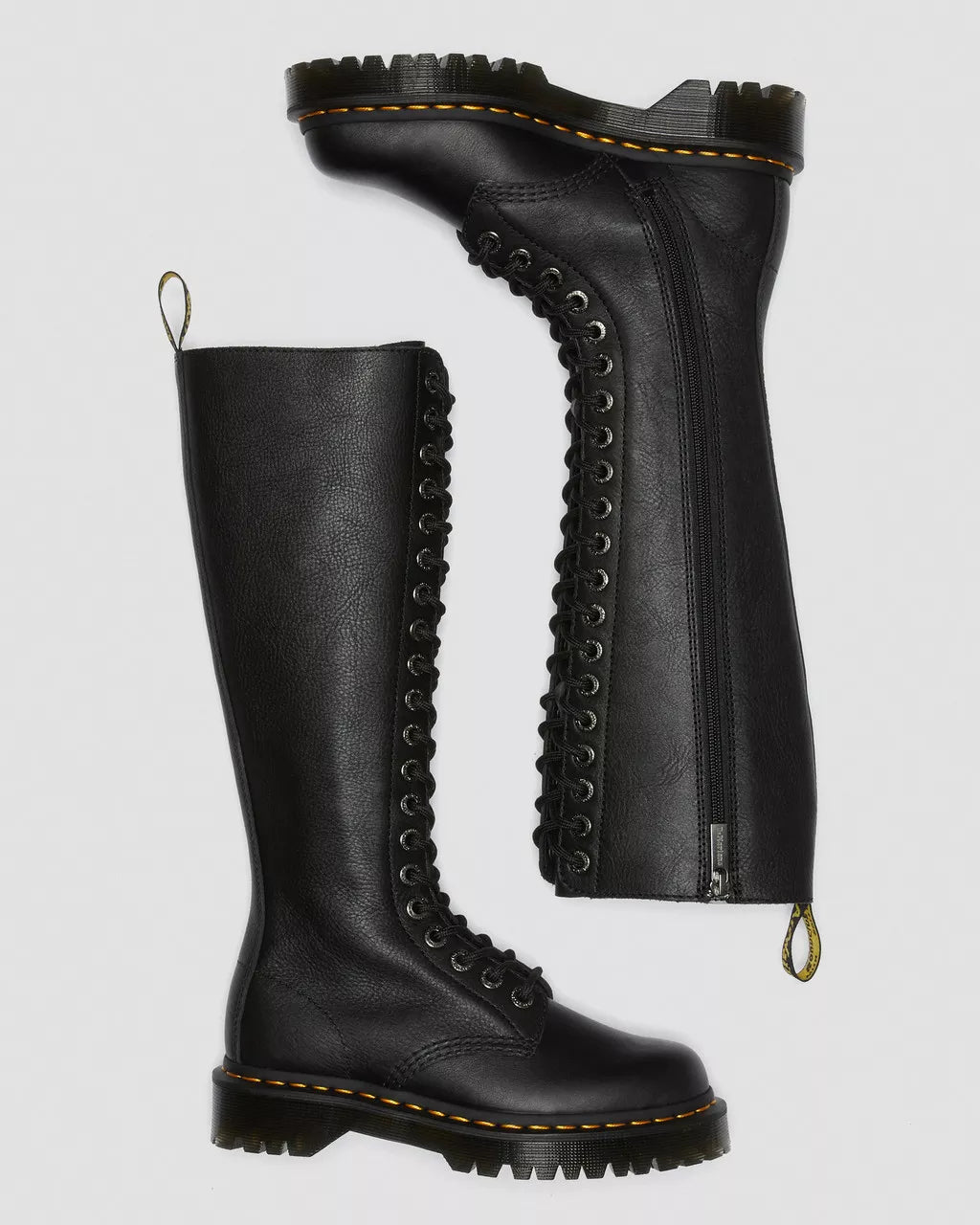 Tall. Tough. Towering. Make yourself heard in our hard-hitting 1B60 boot. Set on our double-height Bex sole for even more height and attitude, the knee-high boots have a standout 20-eye silhouette. Built for the bold, they're crafted from soft Pisa Nappa leather and finished with an inside zip for easy access as well as our classic yellow welt stitching and heel loop. Inner ankle zip for easy-on, easy-off accessPisa is a medium-weight milled nappa leather with a soft tumbled handle and richly pigmented waxy finish Our Goodyear-welted lines are heat-sealed at 700°C and reinforced with our signature welt stitchPlatform height: 1 in; Heel height: 1 3/8 in