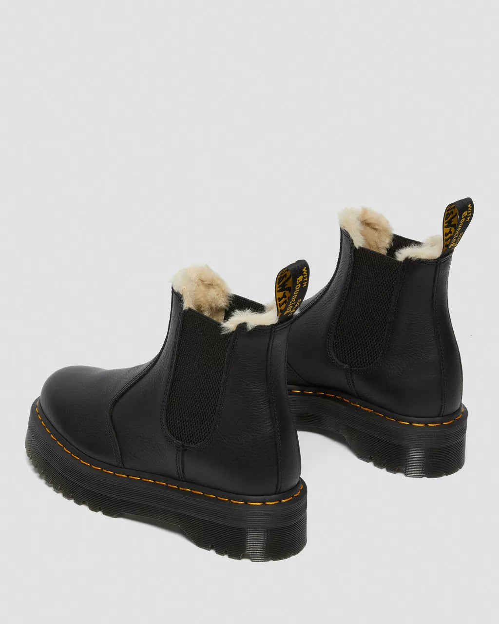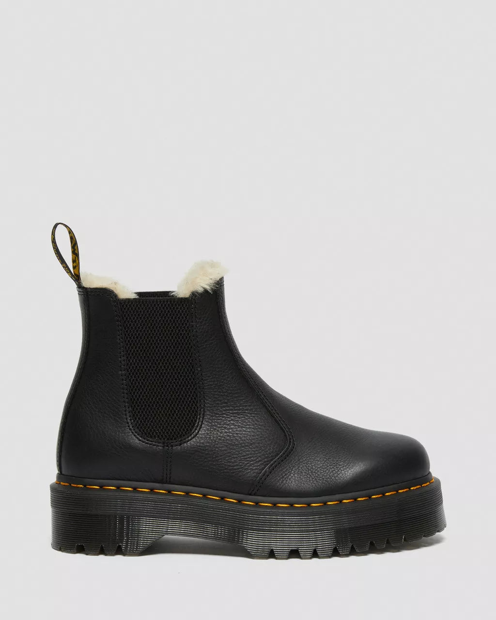 Our 2976 Chelsea boot is as iconic as it ever was. With an easy-on, easy-off elasticized gusset and a fur-lined trim, the 2976 Quad is built from soft Pisa leather and sits on an empowering 1 1/2 inch platform sole. A versatile boot that works with everything.The 2976 is our rugged take on the classic Chelsea boot. Manufactured since the 70sPisa is a medium-weight milled nappa leather with a super-soft tumbled handle and richly pigmented waxy finishLined with soft faux fur and built on the iconic and comfortable Dr. Martens air-cushioned soleMade with classic Doc's DNA, including grooved edges, visible stitching and heel-loopPlatform height: 1 1/2 in; Heel height: 1 7/8 in