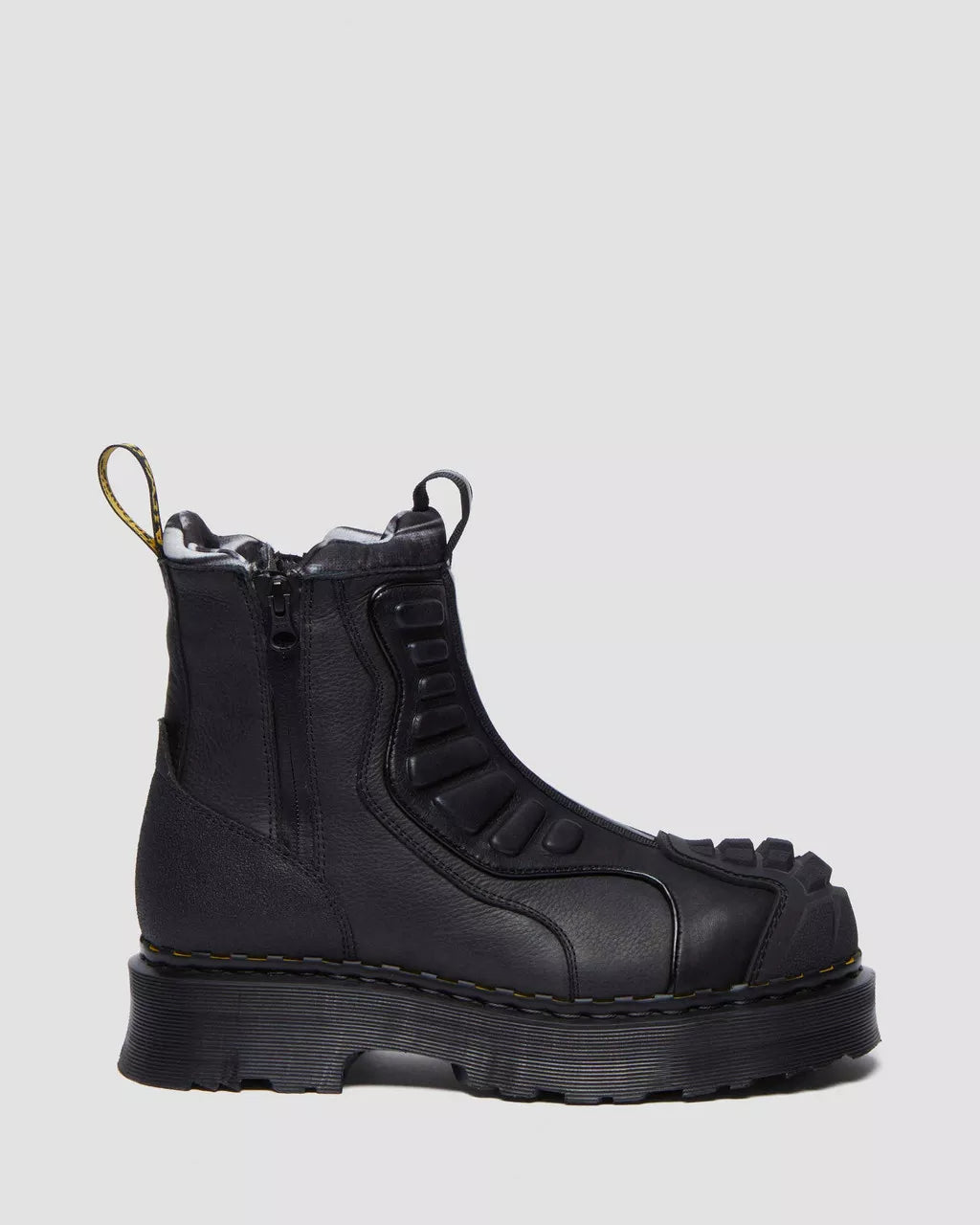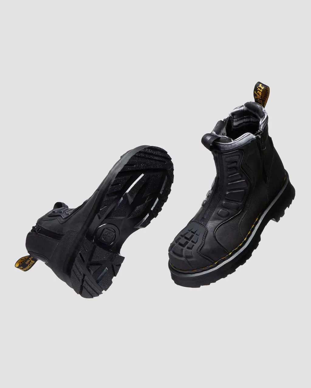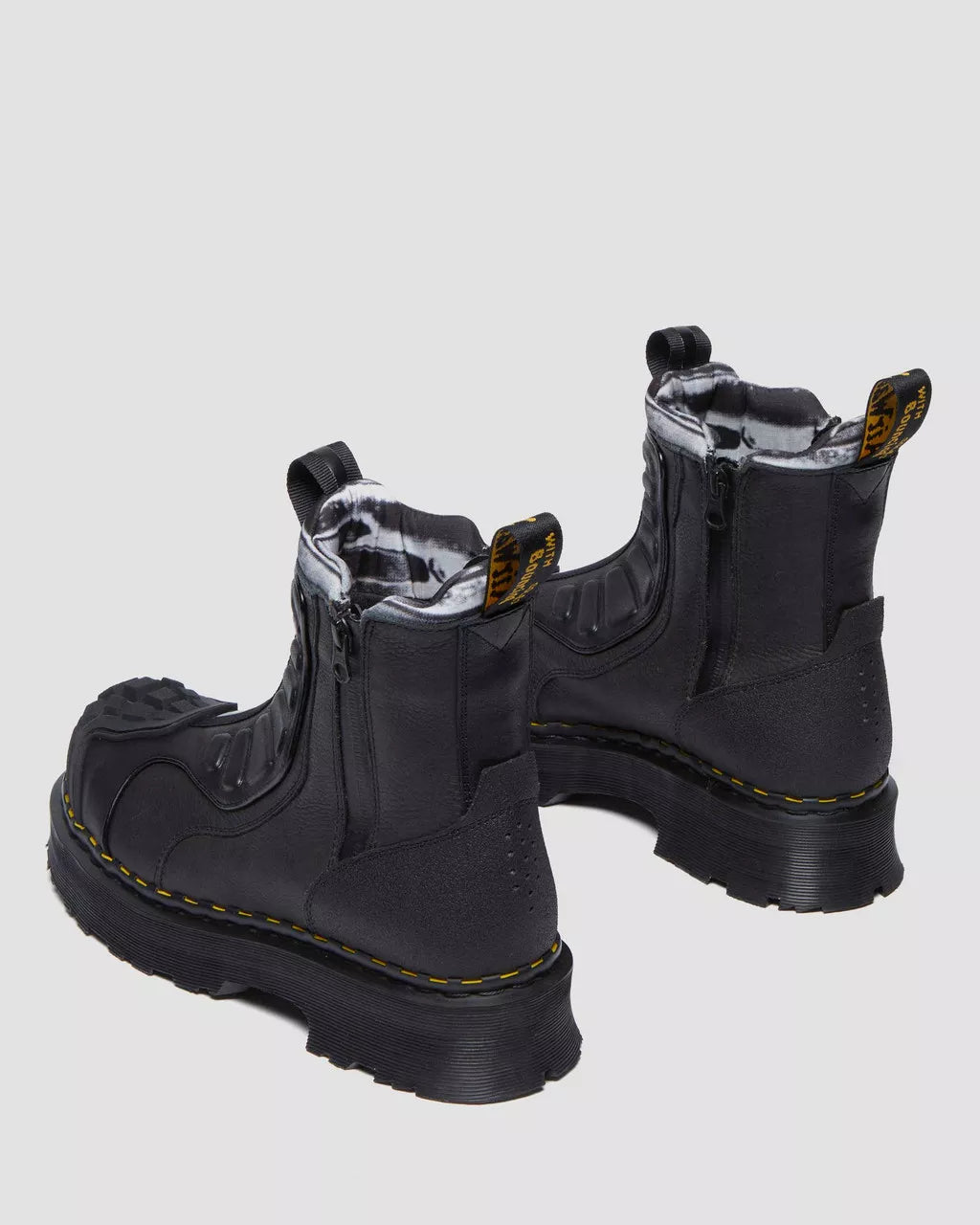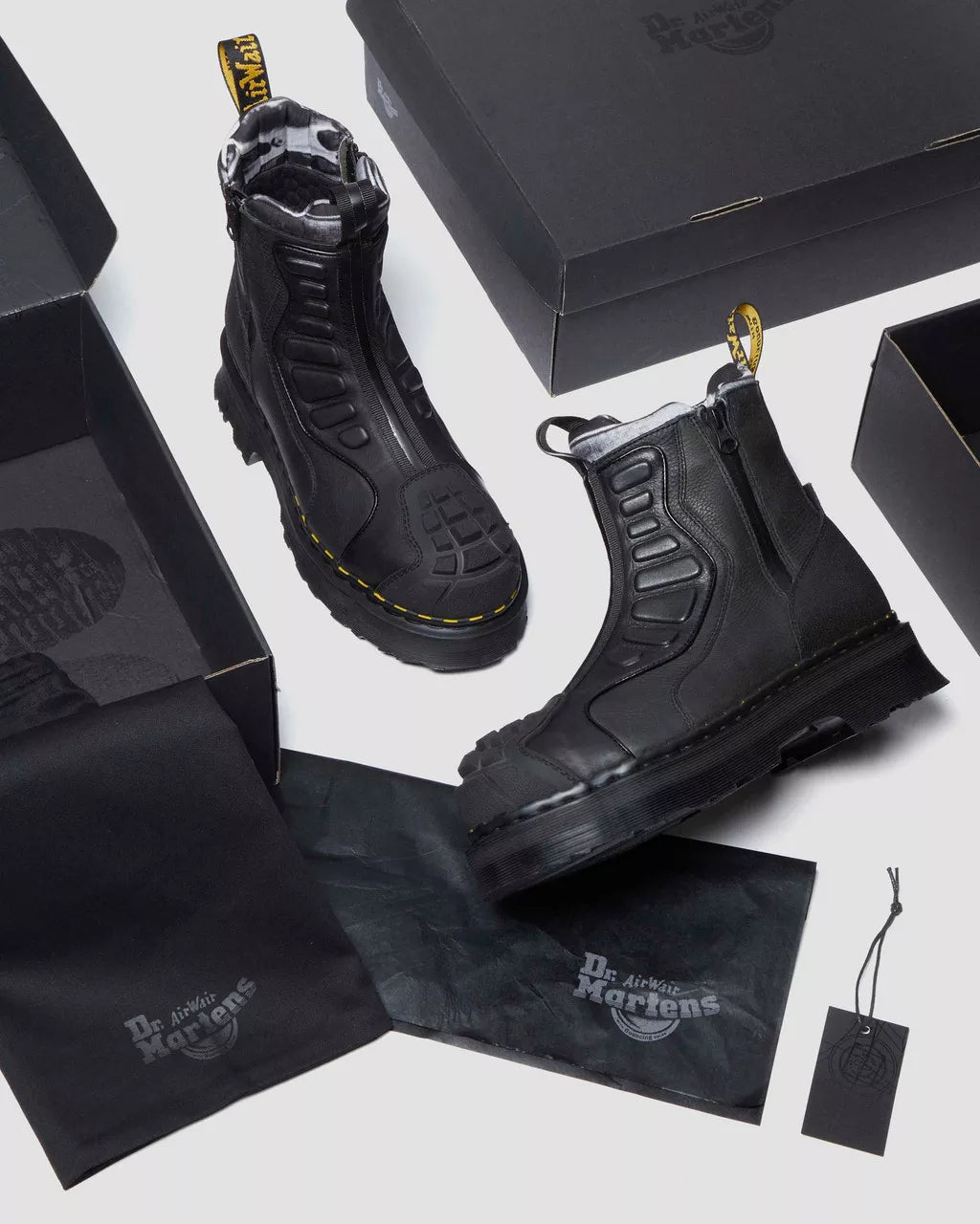The latest 14XX experiment. Industrial protective aesthetics distorted and exxaggerated. A reworked Chelsea boot constructed from water-resistant, full-grain Tailgate leather with a maxximalist silicone and leather lace guard across the vamp. Fortified with a steel toe cap and abrasion-resistant TecTuff across the heel. Fitted with a comfort focused padded collar and SoftWair insole. Set on a new, subverted tread outsole. Finished with monochrome hardware, ankle zip, and dual heel loops.
