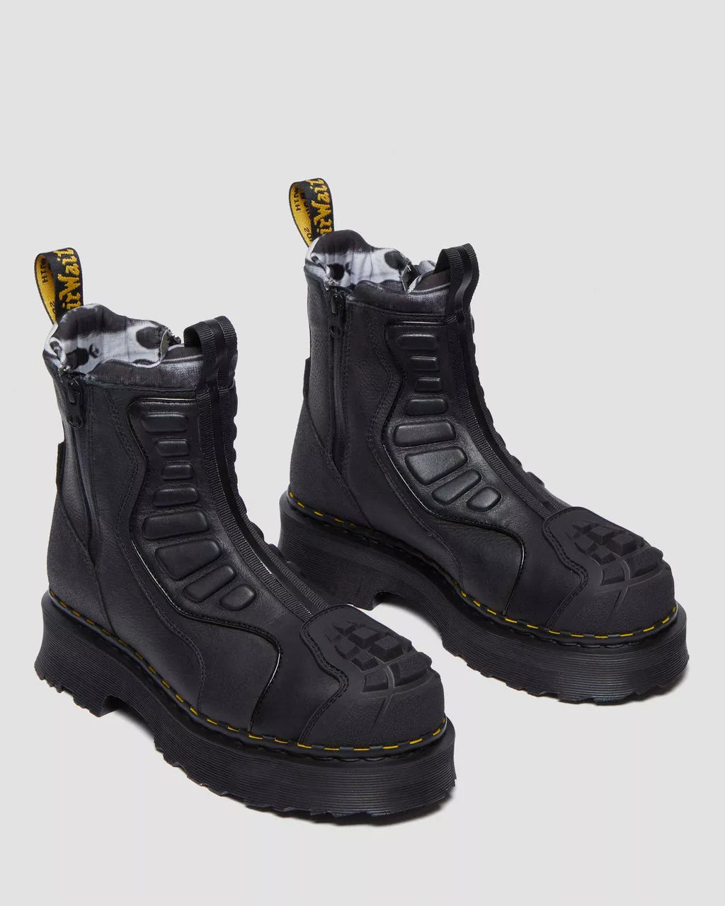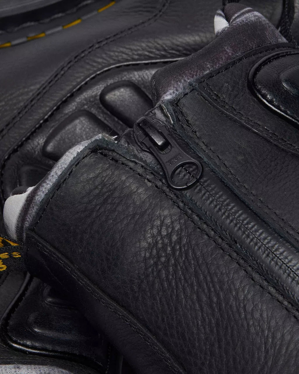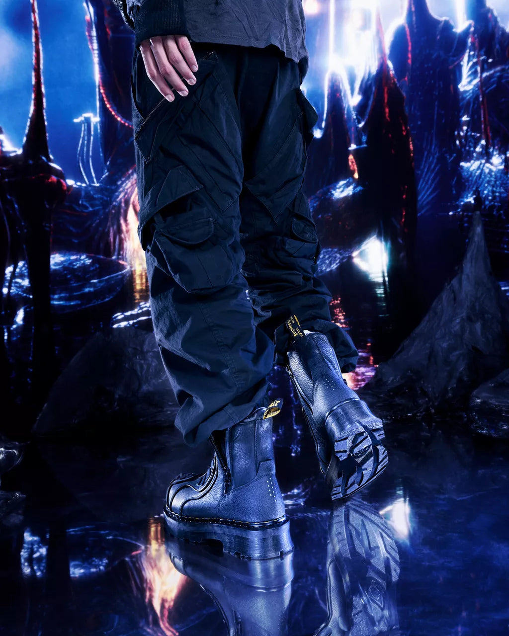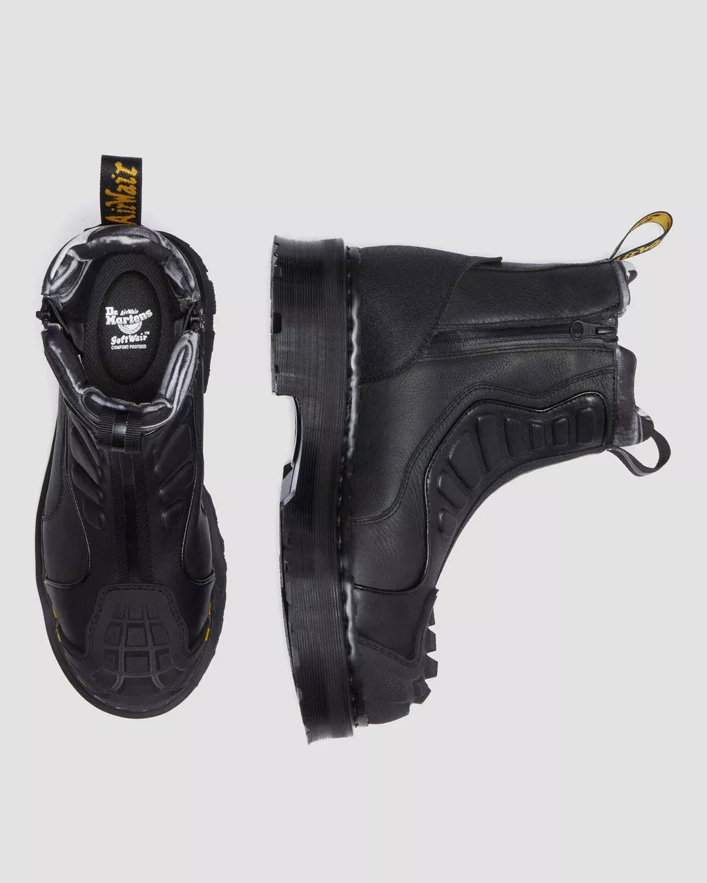 The latest 14XX experiment. Industrial protective aesthetics distorted and exxaggerated. A reworked Chelsea boot constructed from water-resistant, full-grain Tailgate leather with a maxximalist silicone and leather lace guard across the vamp. Fortified with a steel toe cap and abrasion-resistant TecTuff across the heel. Fitted with a comfort focused padded collar and SoftWair insole. Set on a new, subverted tread outsole. Finished with monochrome hardware, ankle zip, and dual heel loops.