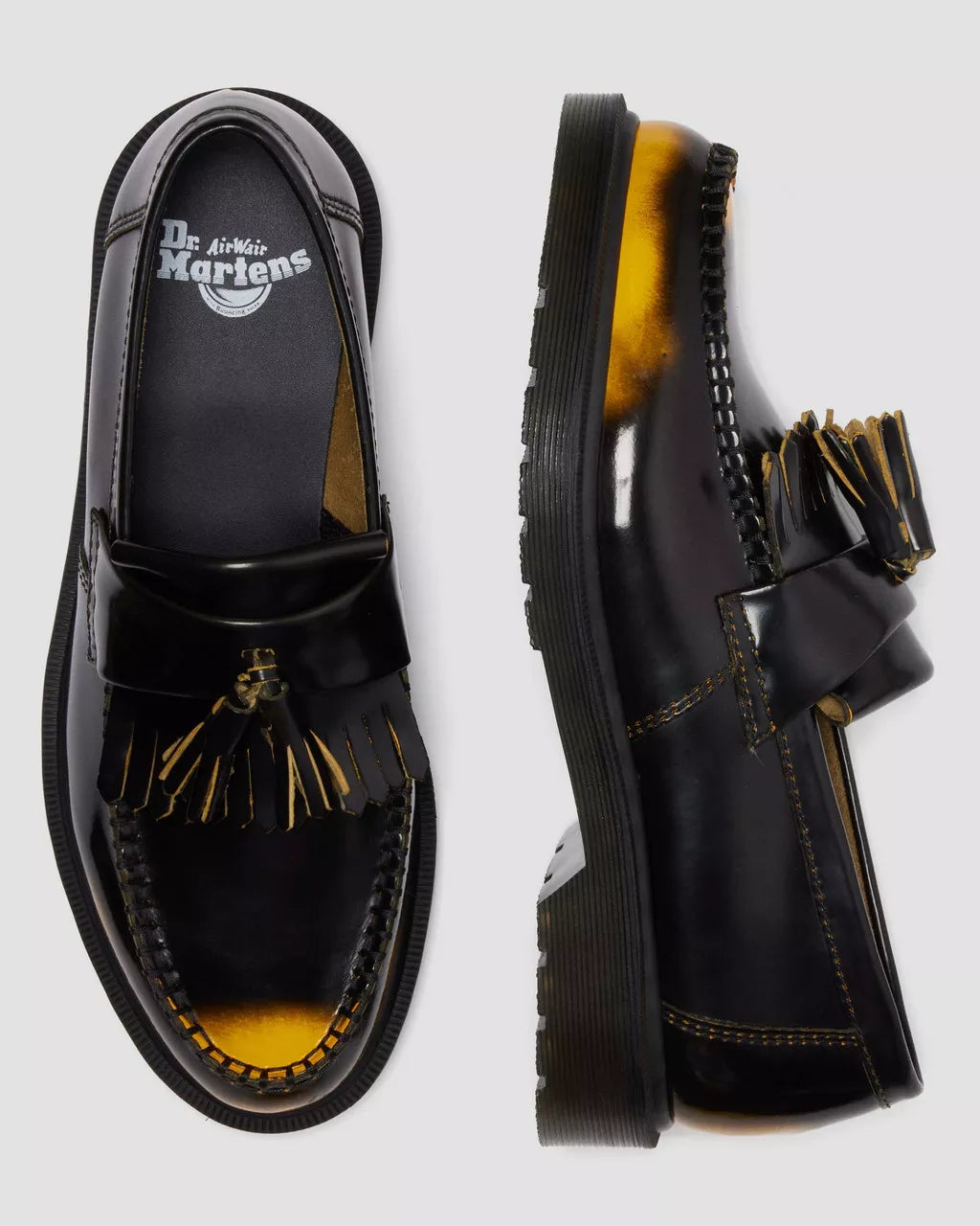 A blank canvas for your story. The Adrian Tassel loafer is revived in Arcadia leather which reveals more color with every wear. Its rub-off finish means the black top coat etches away over time to expose a colored underlayer – making each pair unique. A meeting ground of the experimental and traditional, the loafer stays true to classic Adrian detailing, featuring a tassel and apron, a plain welt and a signature DMS sole in trans.