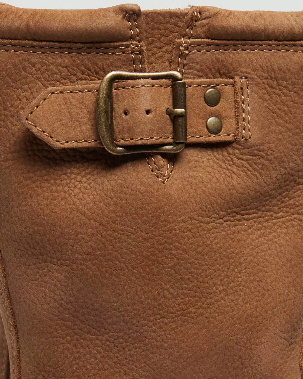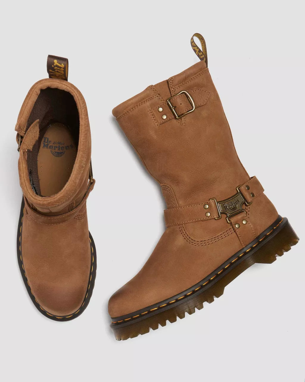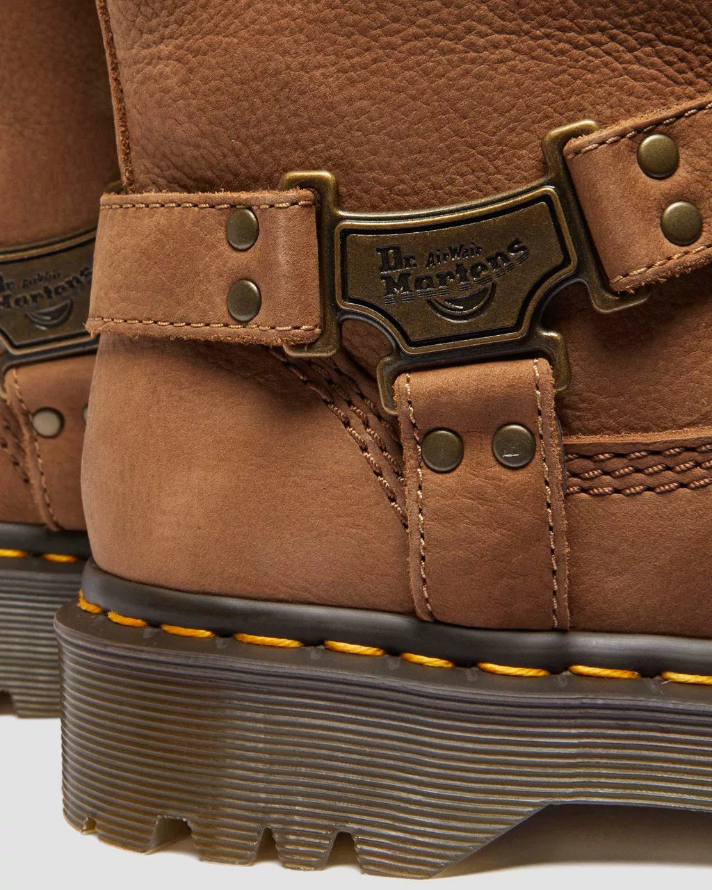 Start your engines. Our Anistone Hi biker boot is built to be seen. This new version is made textured Tumbled Nubuck and fitted with industrial-inspired hardware, including branded metal plates and an adjustable buckle. Set on our elevated Bex sole with signature DM’s grooving and yellow welt stitching. Tagged with a dark brown and yellow heel loop.