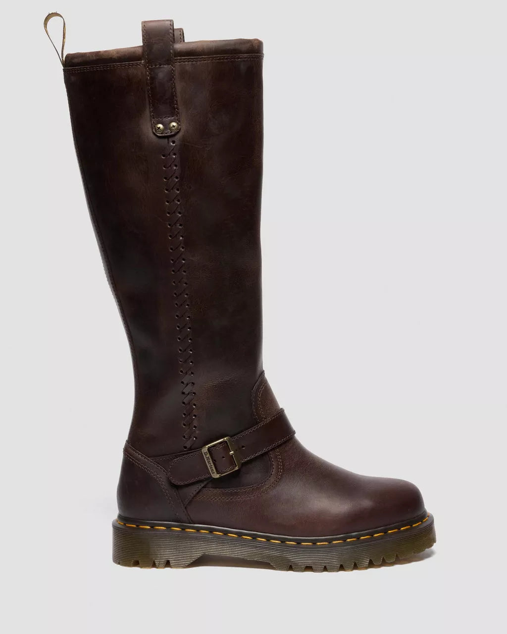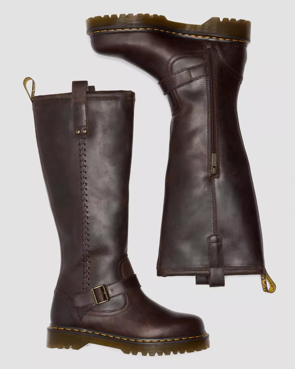 An elongated silhouette joins the line-up. This is the Anistone Knee High biker boot – made taller for expression without limits. Engineered with distressed Crazy Horse leather, the boot is fitted with an antique brass buckle and our cross-rivet branding. A brown and yellow heel loop rises from the collar, whipstitch detailing runs down the side of the boot, and our signature yellow stitching lines the welt. A vintage trans Bex sole delivers extra height and grip underfoot.
