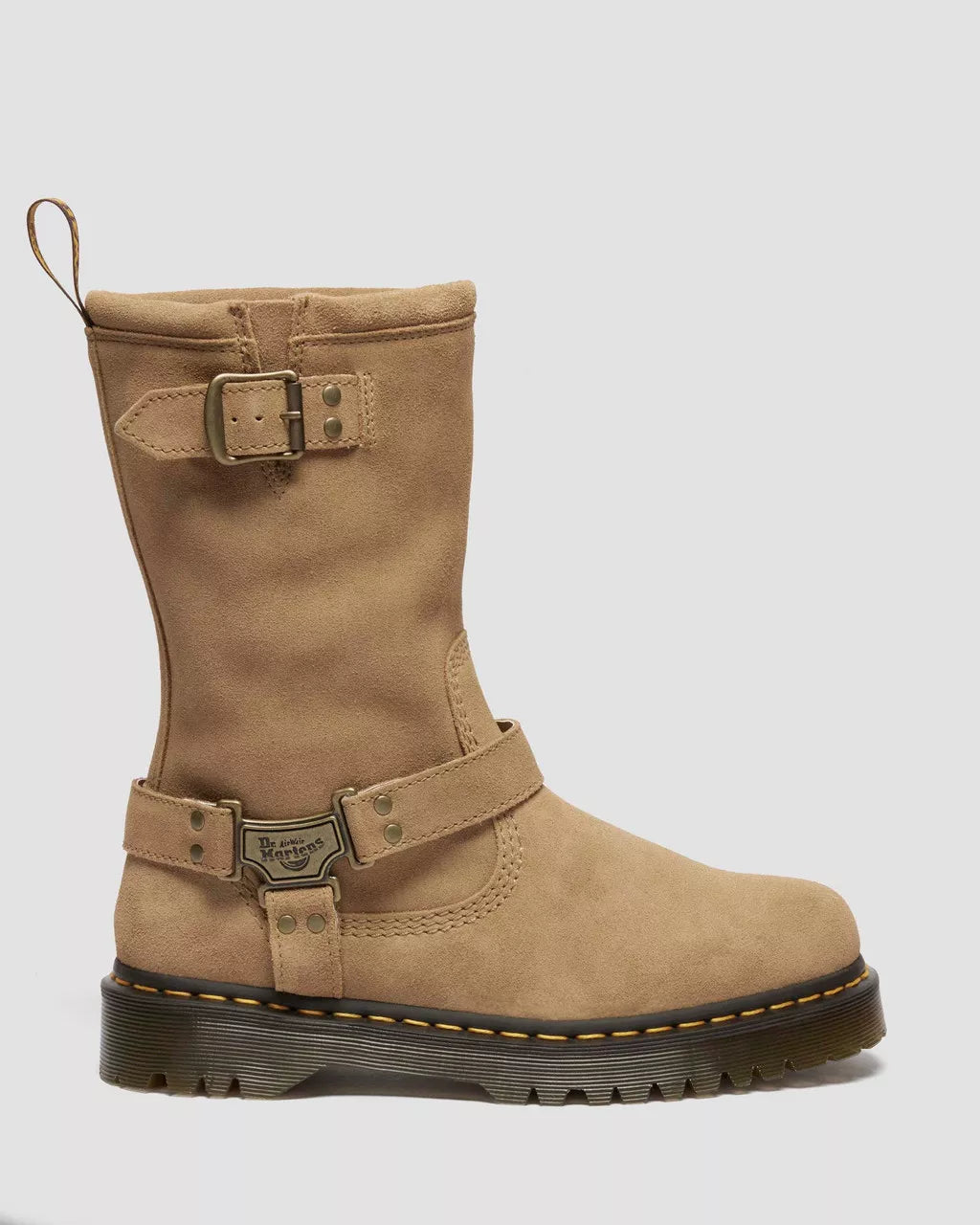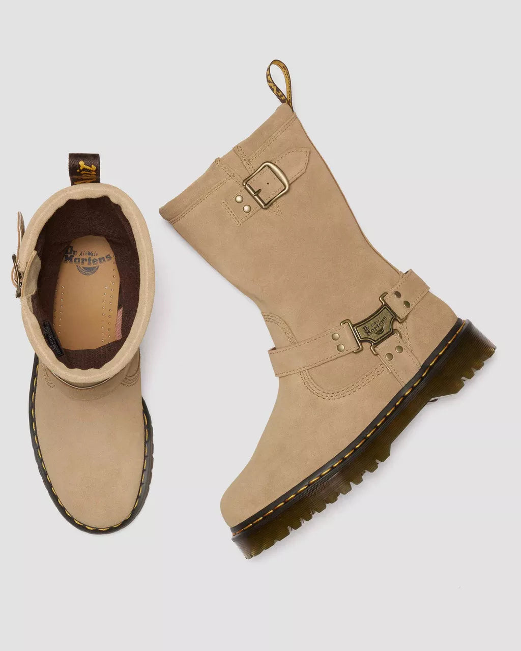 Unbridled texture at full throttle. The Anistone Hi biker boot is reimagined in Bronx Suede leather for expression without rules. Rugged, relaxed and ready to hit the open road, Bronx Suede imprints with every crease and scuff to tell a unique story. We decorated it with signature Anistone detailing branded antique brass plates and an adjustable buckle. The boot is tagged with our scripted heel loop and yellow welt stitching and sits on a trans Bex sole for extra height.