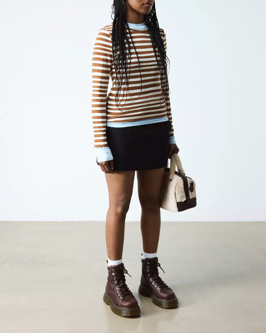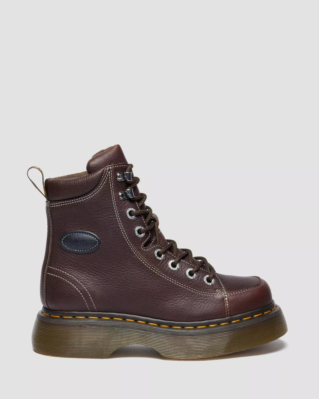 Boot up the Buzz. Our new Buzz 8 eye boot is laced with archive inspiration and a heavy dose of Doc’s DNA. It stands on our chunky, barrel-edge Buzz sole — marked with DM’s grooving, yellow welt stitching, and a leaf pattern on the undersole. The upper is made with soft brown Grizzly leather and detailed with a rubberized brand patch, antique gold eyelets, and contrast stitching. The boot is also fitted with a padded collar —so your first wear will feel as good as it looks.
