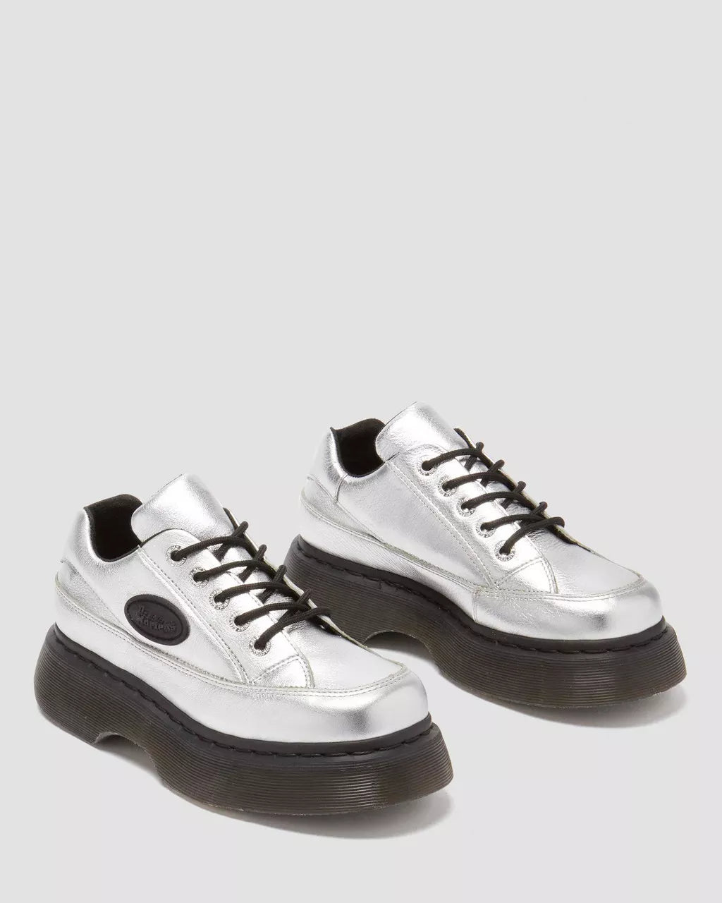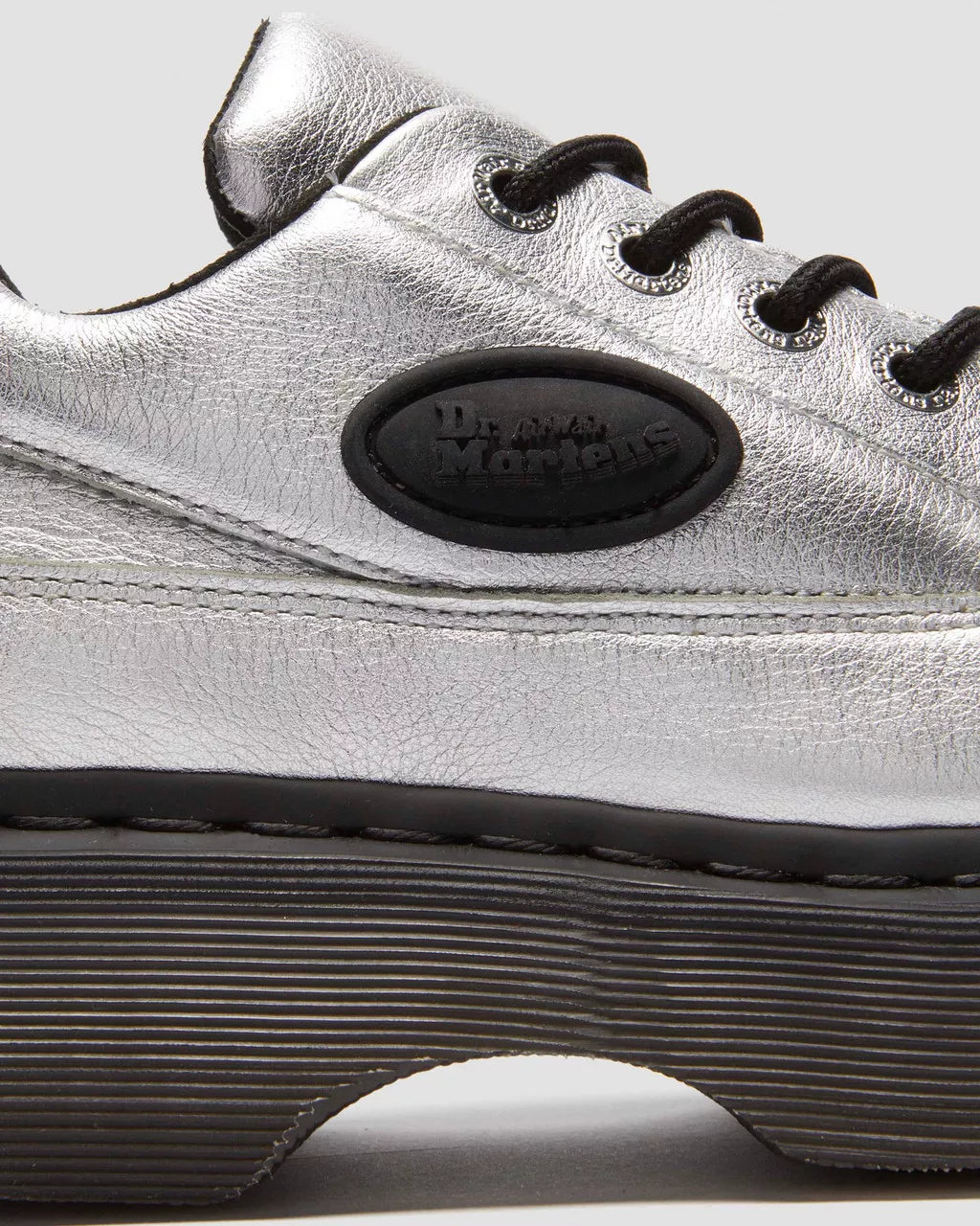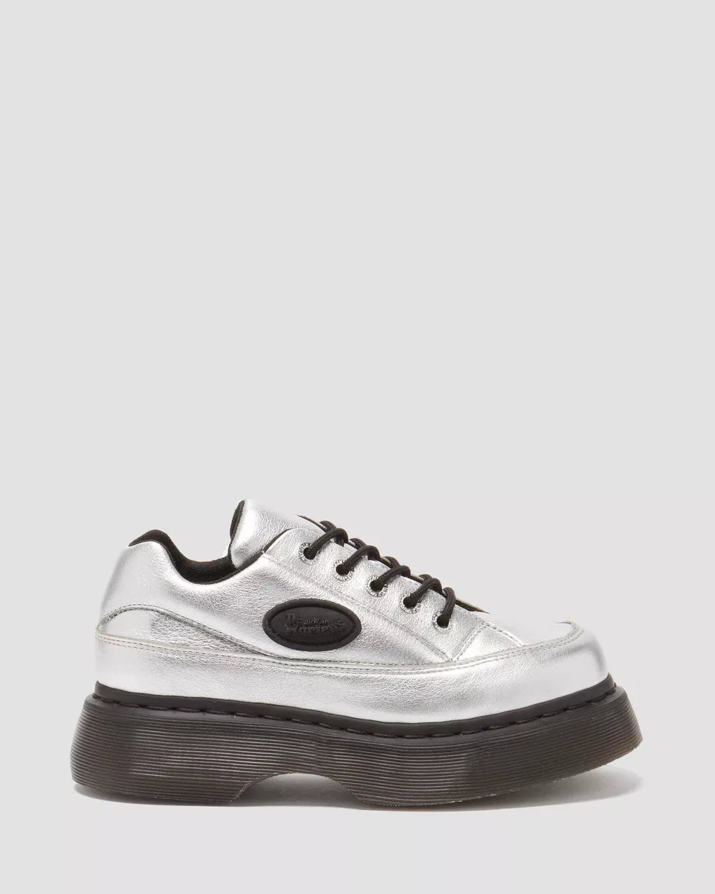 Feel the Buzz. Inspired by our 90s silhouettes, the new Buzz 5-eye shoe grabs attention from top to bottom. It stands on our chunky barrel-edge Buzz sole — marked with DM’s grooving, black welt stitching, and a leaf pattern on the undersole. The statement silver upper is made with soft, Metallic Tumbled leather and has a comfortable padded collar. An inflated, rubberized badge echoes the contours of the sole.