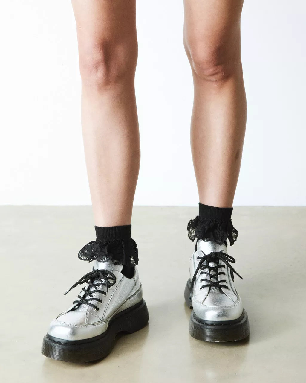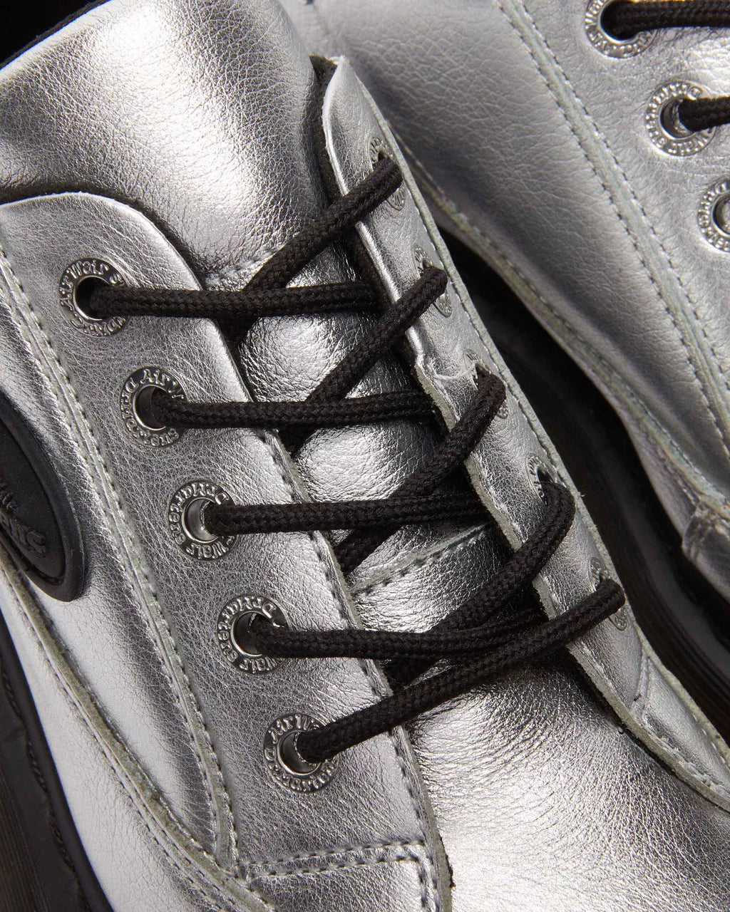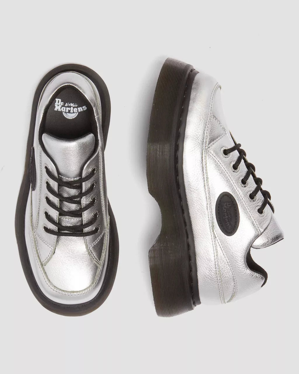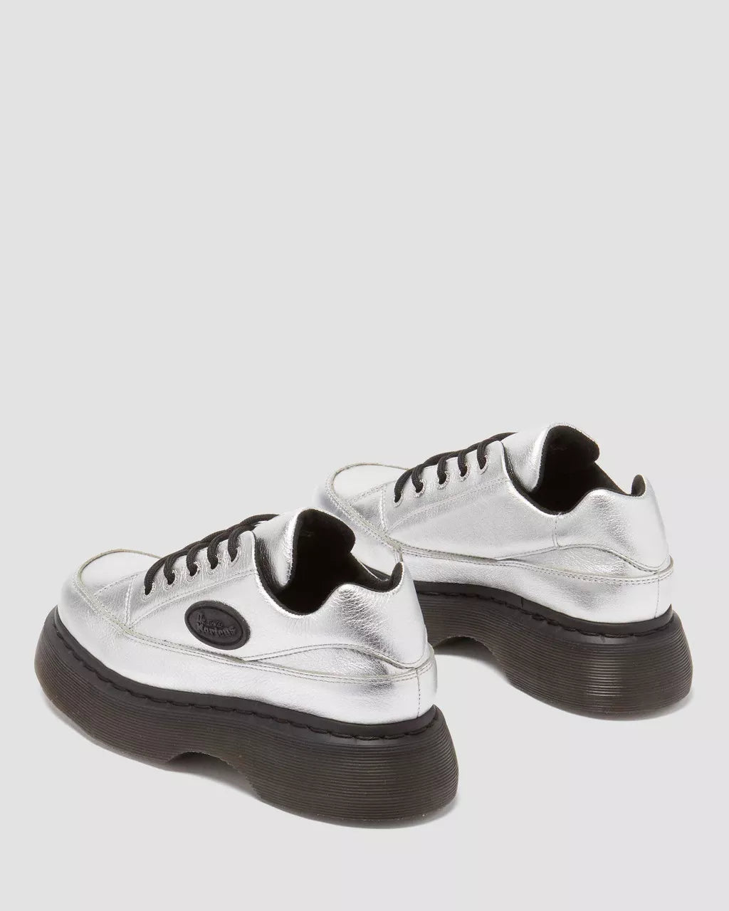 Feel the Buzz. Inspired by our 90s silhouettes, the new Buzz 5-eye shoe grabs attention from top to bottom. It stands on our chunky barrel-edge Buzz sole — marked with DM’s grooving, black welt stitching, and a leaf pattern on the undersole. The statement silver upper is made with soft, Metallic Tumbled leather and has a comfortable padded collar. An inflated, rubberized badge echoes the contours of the sole.