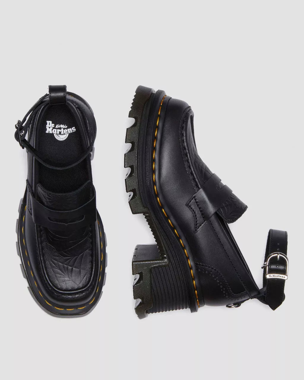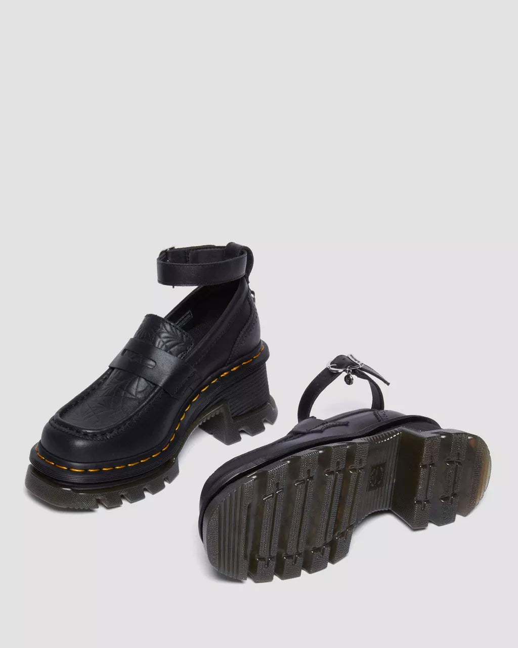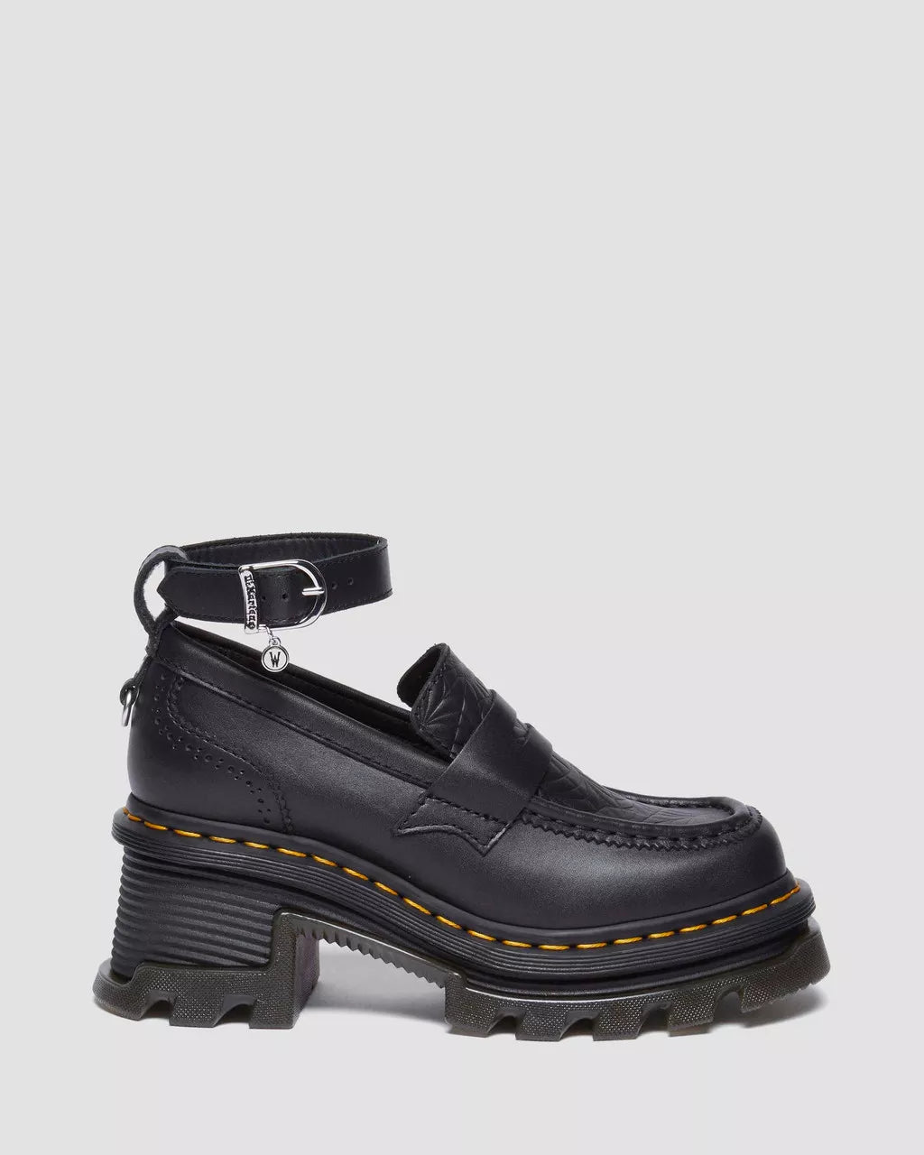 Outcasts are in. This limited-edition loafer silhouette from our DM’s x Wednesday collection is made with supple Wanama leather with stained-glass-inspired embroidery across the vamp. The top of the shoe has an adjustable ankle strap with a dual-branded buckle, and the back of the heel is tagged with a hardware ring. The shoe is fitted with a SoftWair insole for comfortable wear. The heeled sole has exaggerated grooving and is secured with classic yellow welt stitching.Wanama is a lightweight leather with a satin-sheen finish. Clean with a damp cloth and care with Dr. Martens Shoe Polish or Wonder Balsam.Our SoftWair memory foam footbed ensures comfort from the first step.Our Goodyear-welted lines are heat-sealed and reinforced with our signature welt stitch.