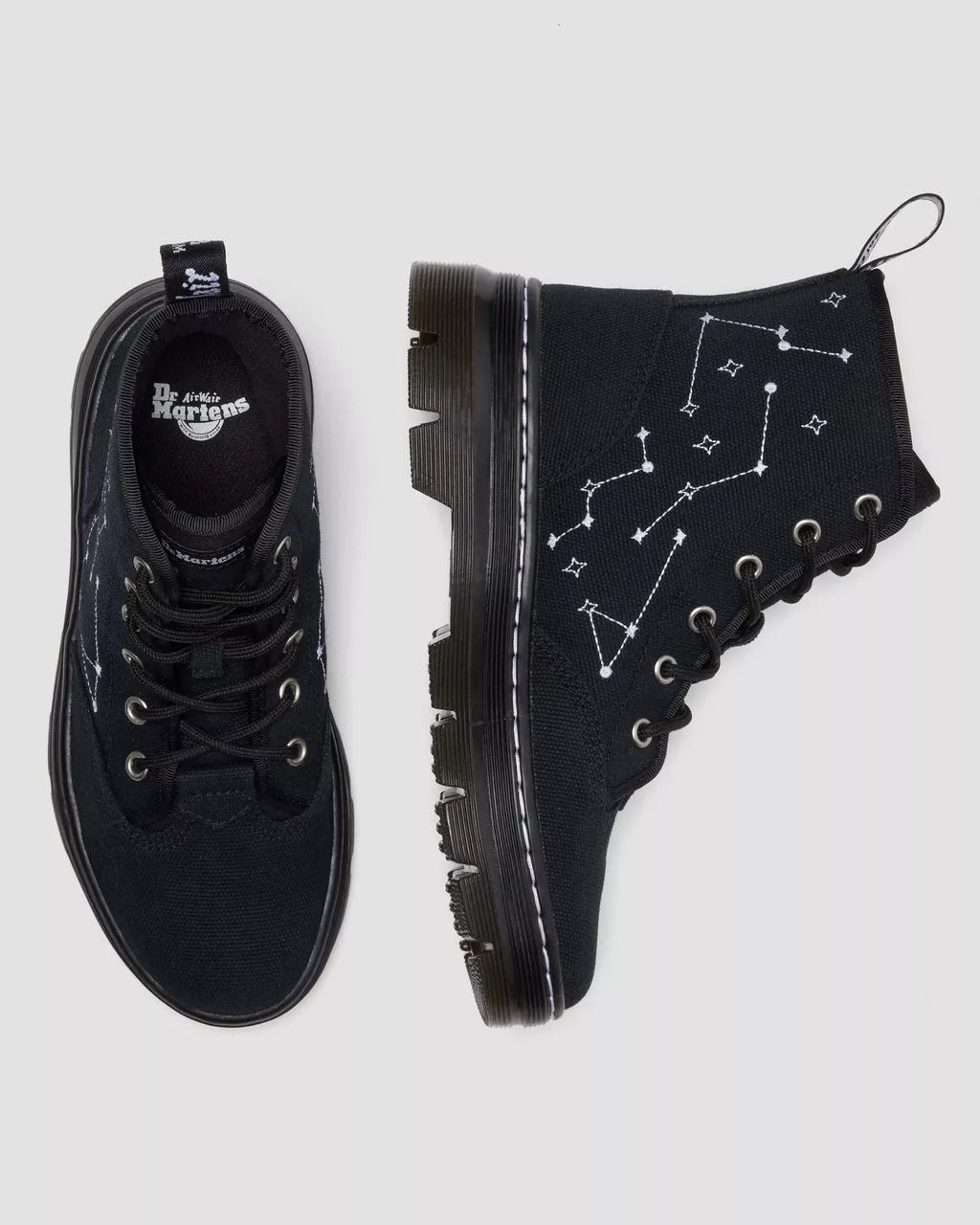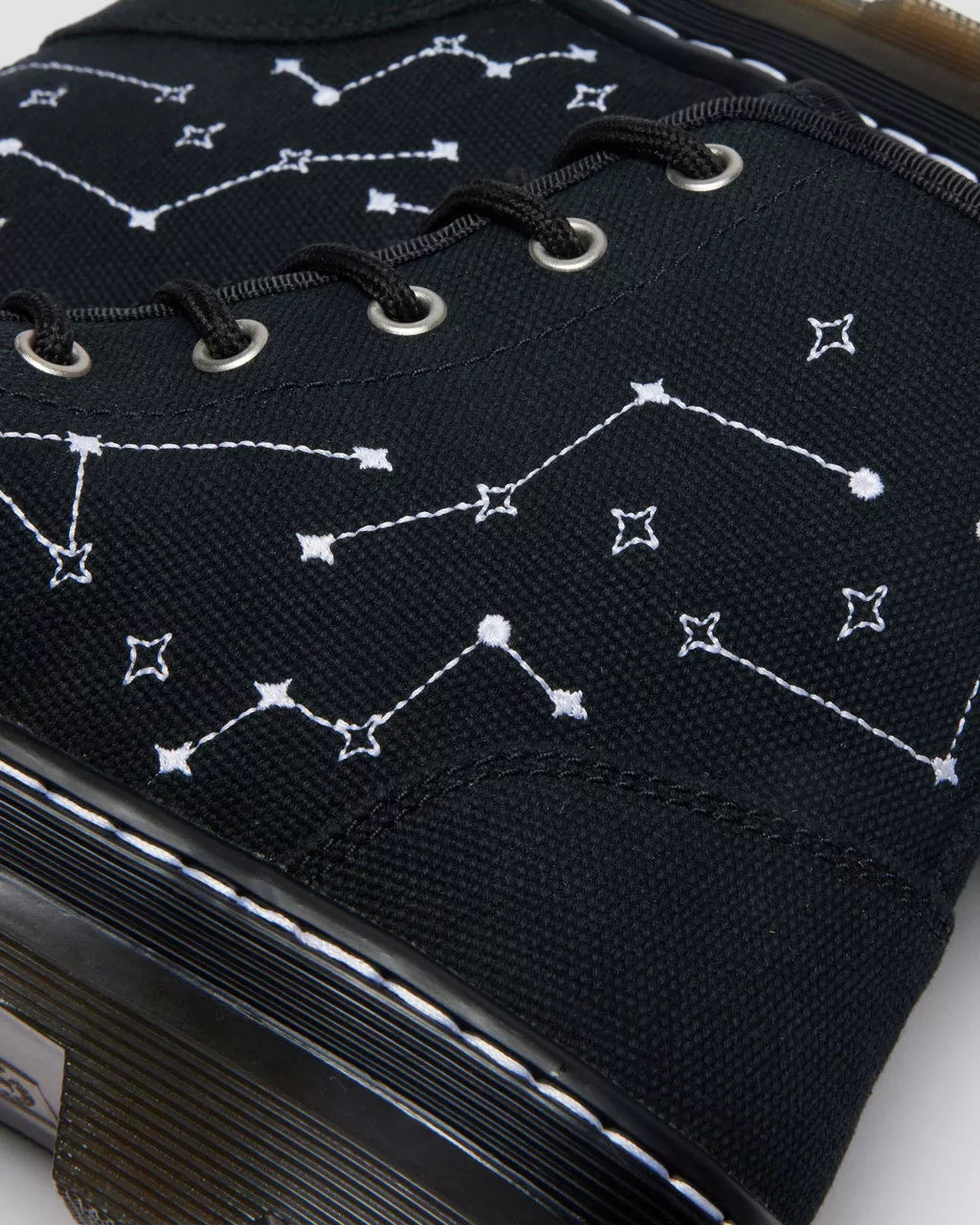 A utility-driven boot with astrology-inspired flourishes. This edit of our Charlee Chukka boot is dressed in embroidered canvas with white stitch detailing across the upper. Fitted with black laces and silver eyelets. Signed with a black and white scripted heel loop and white stitching on the sole. Our cemented Tract sole offers a comfortable foundation for easy everyday wear.