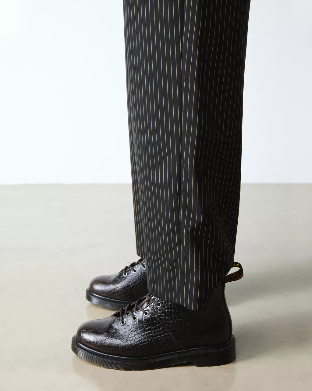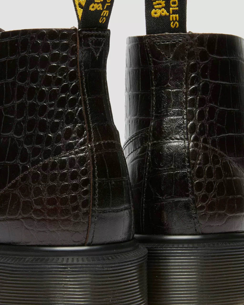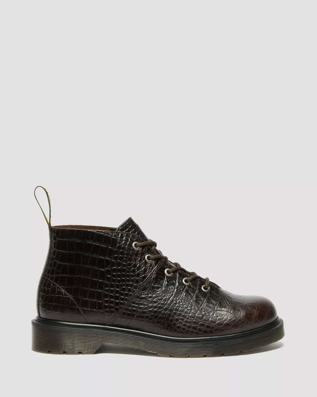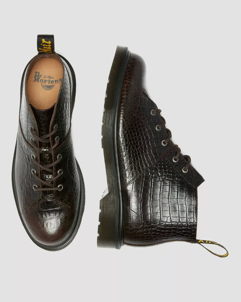 Wild in the streets. The 6-eye Church ankle boot returns. Built from soft and strong Analine leather with an embossed crocodile skin texture. Set on a classic DMS sole and secured with a plain black welt. Fitted with tonal laces and contrast silver eyelets. Signed with an AirWair heel loop.