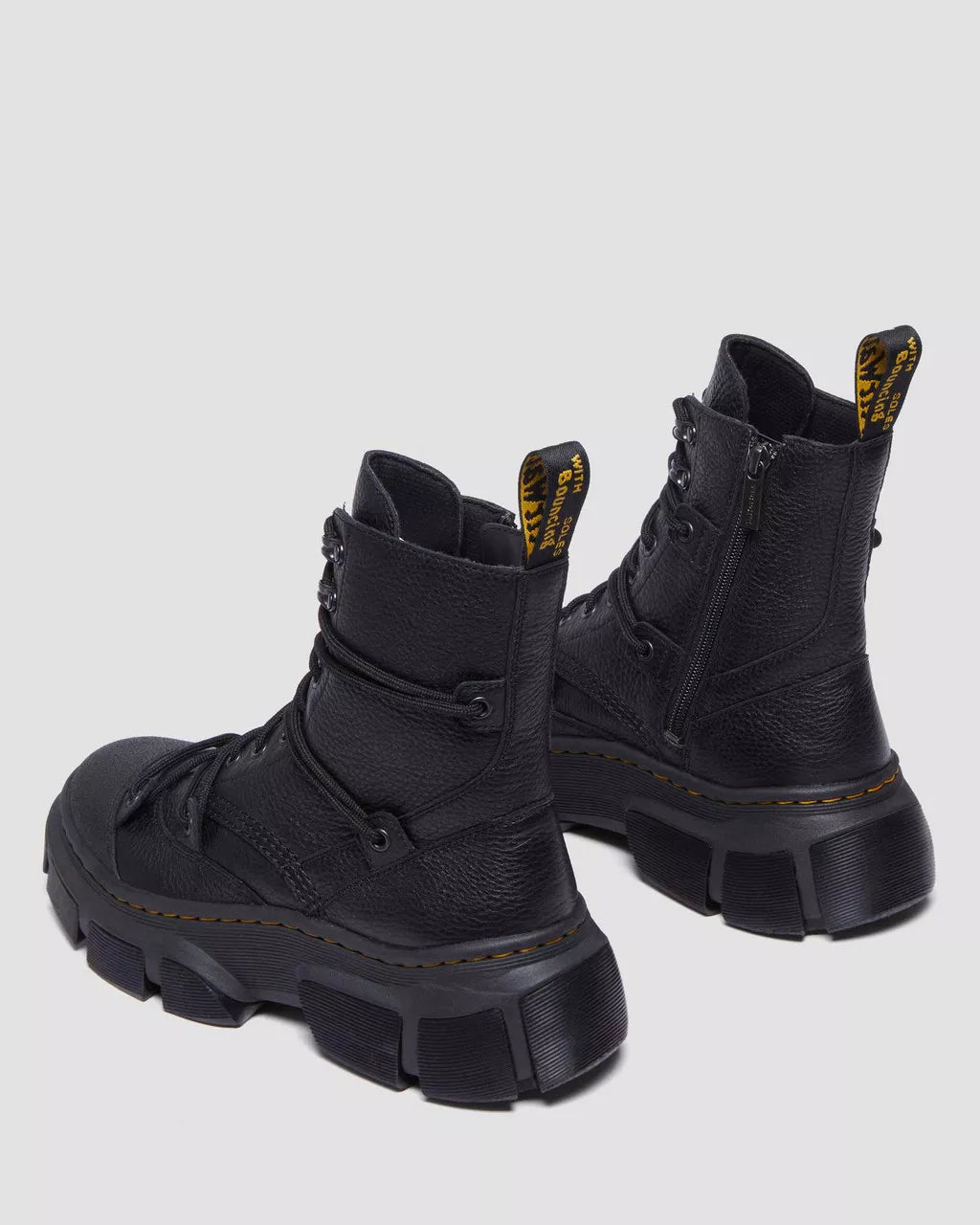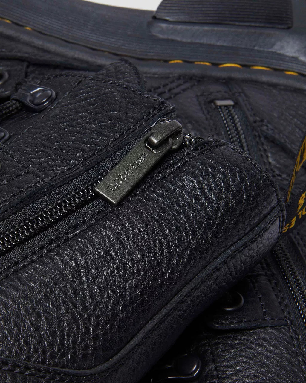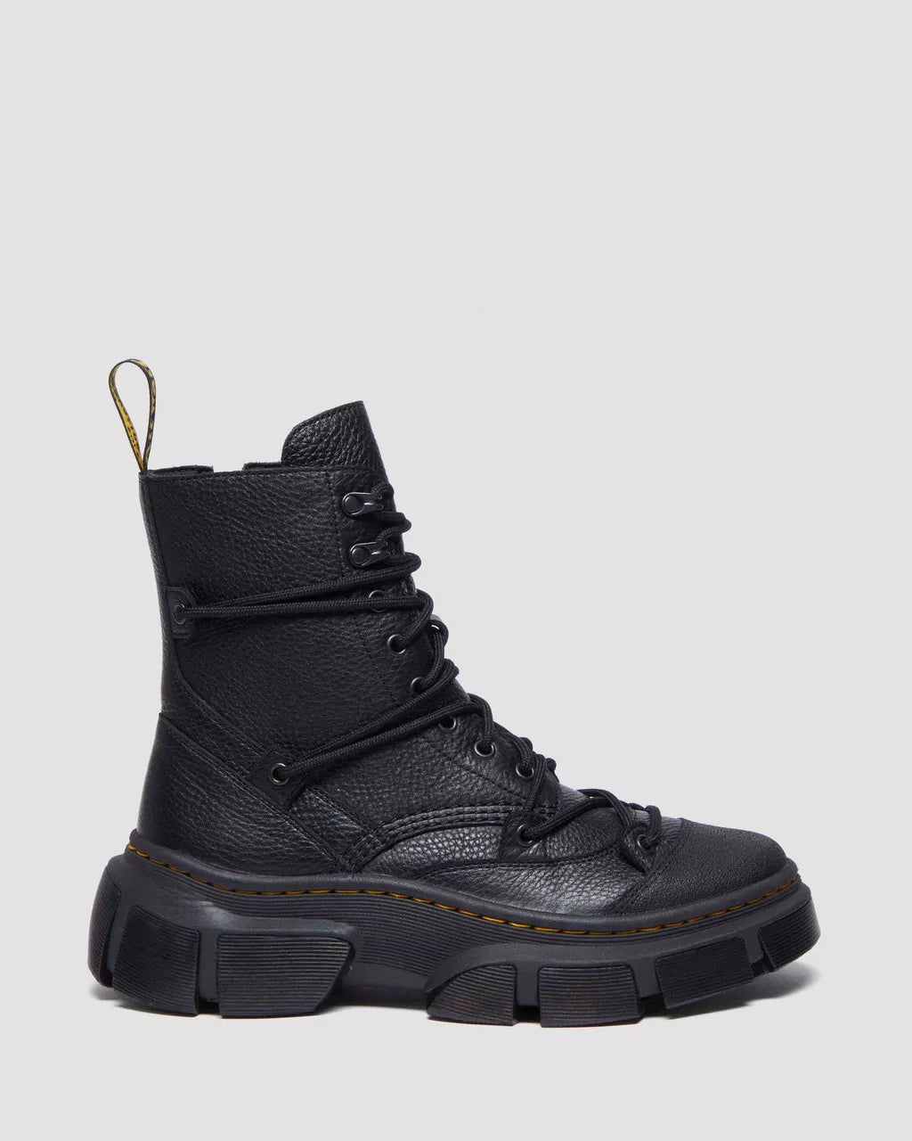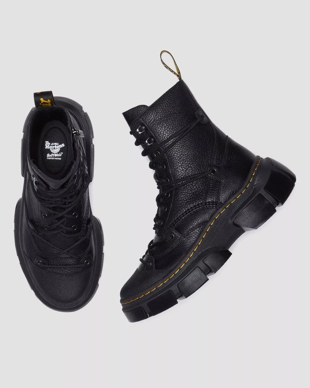 Big sole. XL comfort. The DMXL sole is made to move — looks tough, feels easy. Our 8-eye boot is reimagined with our blown-out DMXL sole. Combining lightweight EVA with durable PVC pods and an exaggerated tread. Fitted with a SoftWair insole for cushioning and support on the move. The boot has a lacing system that extends down the toe and around the sides of the boot for an extra-secure fit — finished with an inside zip so you can slip the boot off without unlacing. Made from soft Lunar and Rubber Grain leather with toecap stitch detailing. Signed with yellow stitching and our black and yellow heel loop.