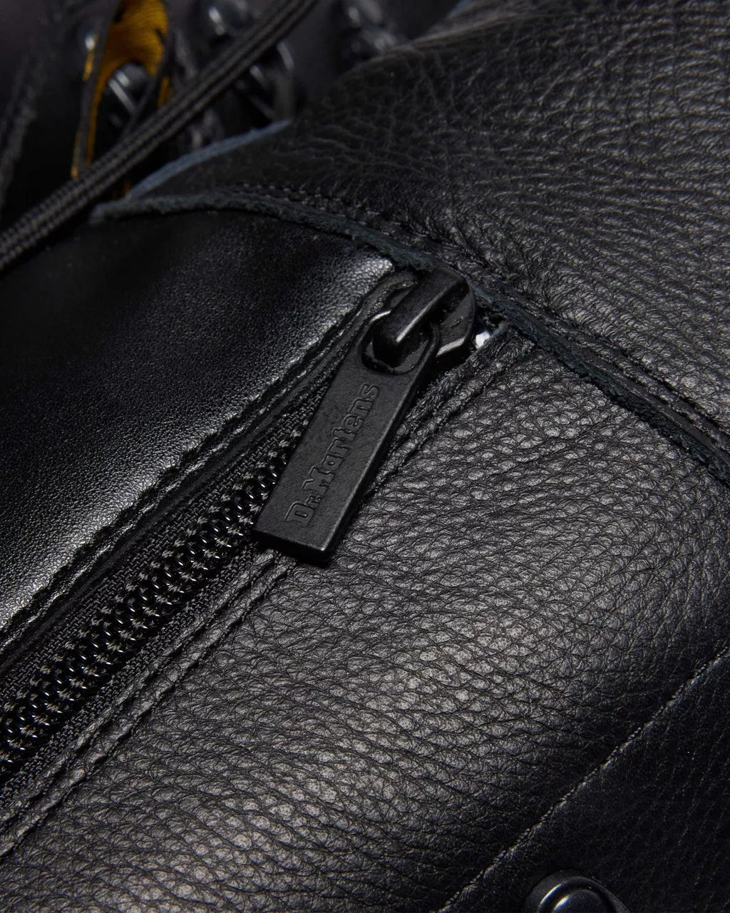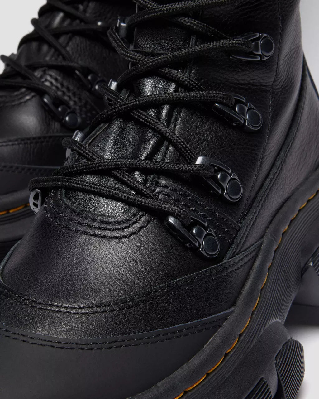 DMXL’s biggest, boldest form. A towering 19-eye over-knee boot set on our exaggerated, lightweight DMXL sole. Cut from soft, pliable Virginia leather that delivers comfort and resilience in equal measure, combined with Stretch PU for additional flexibility. Highlighted with a rubberized leather toe cap. For ease of wear and access, the boot is fitted with inner zips. Each pair is finished with extra-long wraparound laces, an AirWair heel loop and our unmissable yellow stitch along the DMXL sole.
