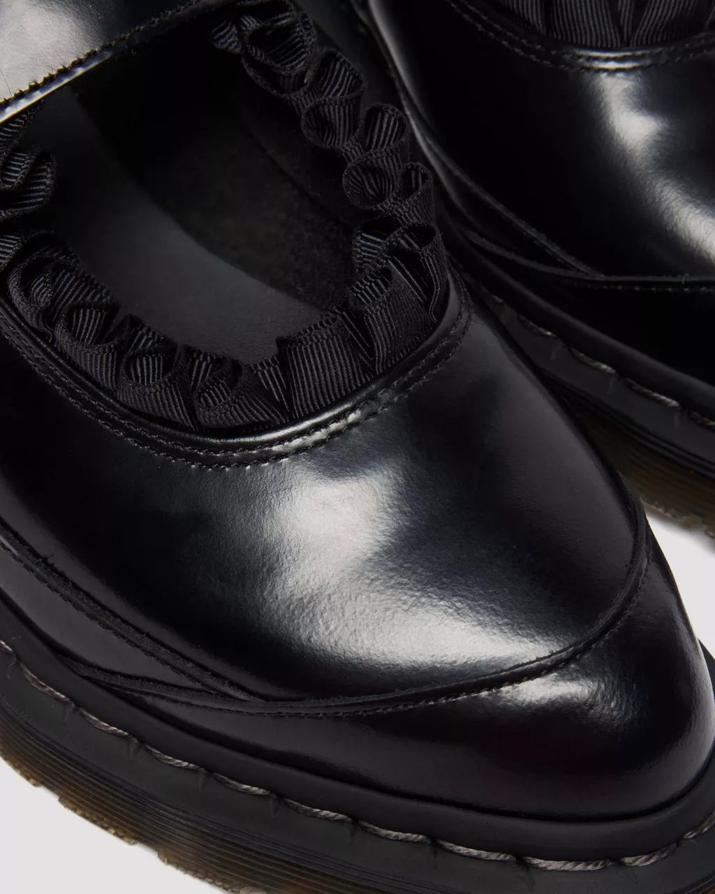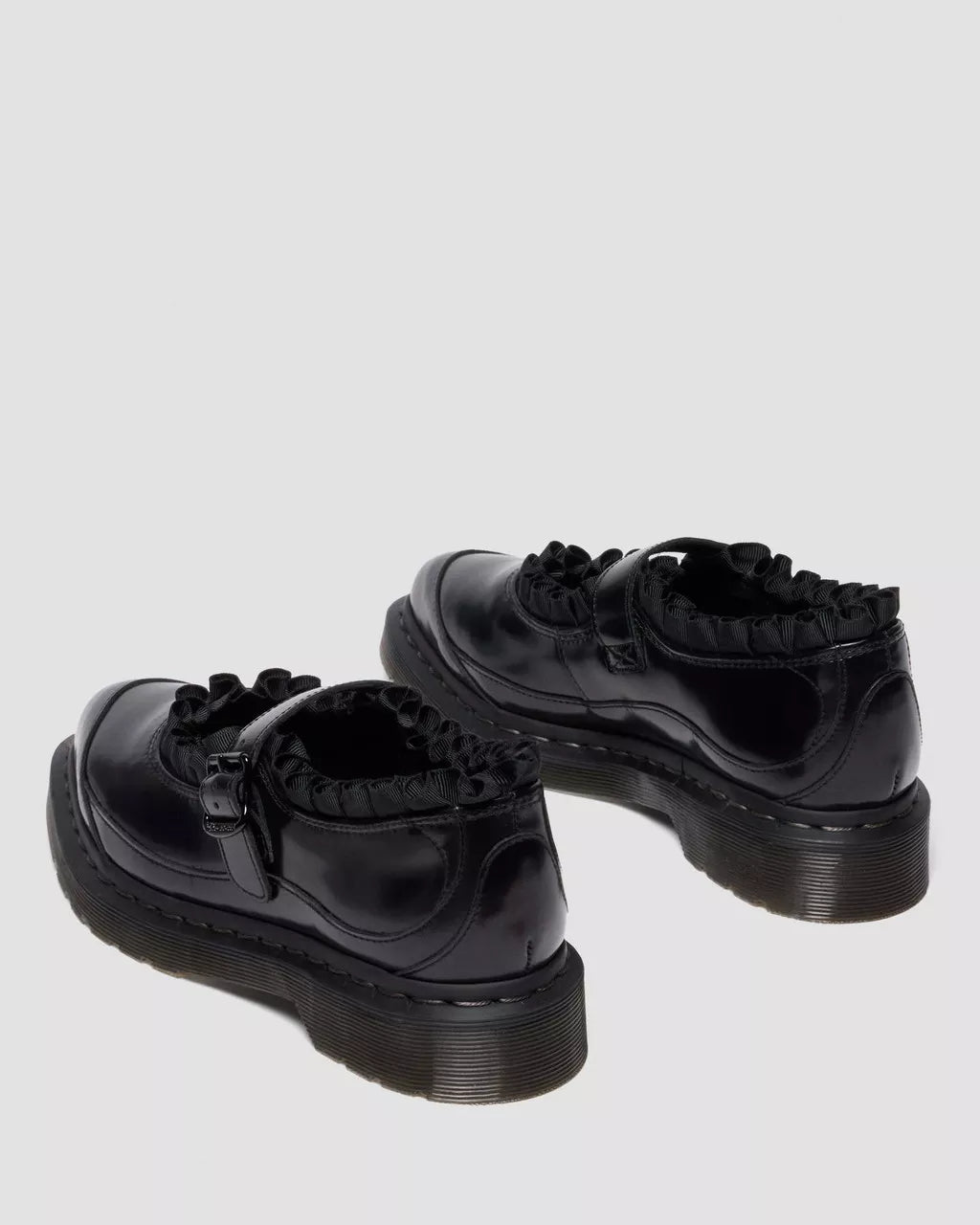 Point and frill. The Elphie Mary Jane Frill shoe harmonizes soft-edged fluidity and tapered construction for a finish that’s delicately strong. The upper is crafted from Polished Smooth leather with white stitching and a single adjustable strap with an antique black buckle. Frills line the shoe’s inner, while a tapered toe adds a sharper edge. A smoke DMS sole with classic grooving finishes the silhouette.