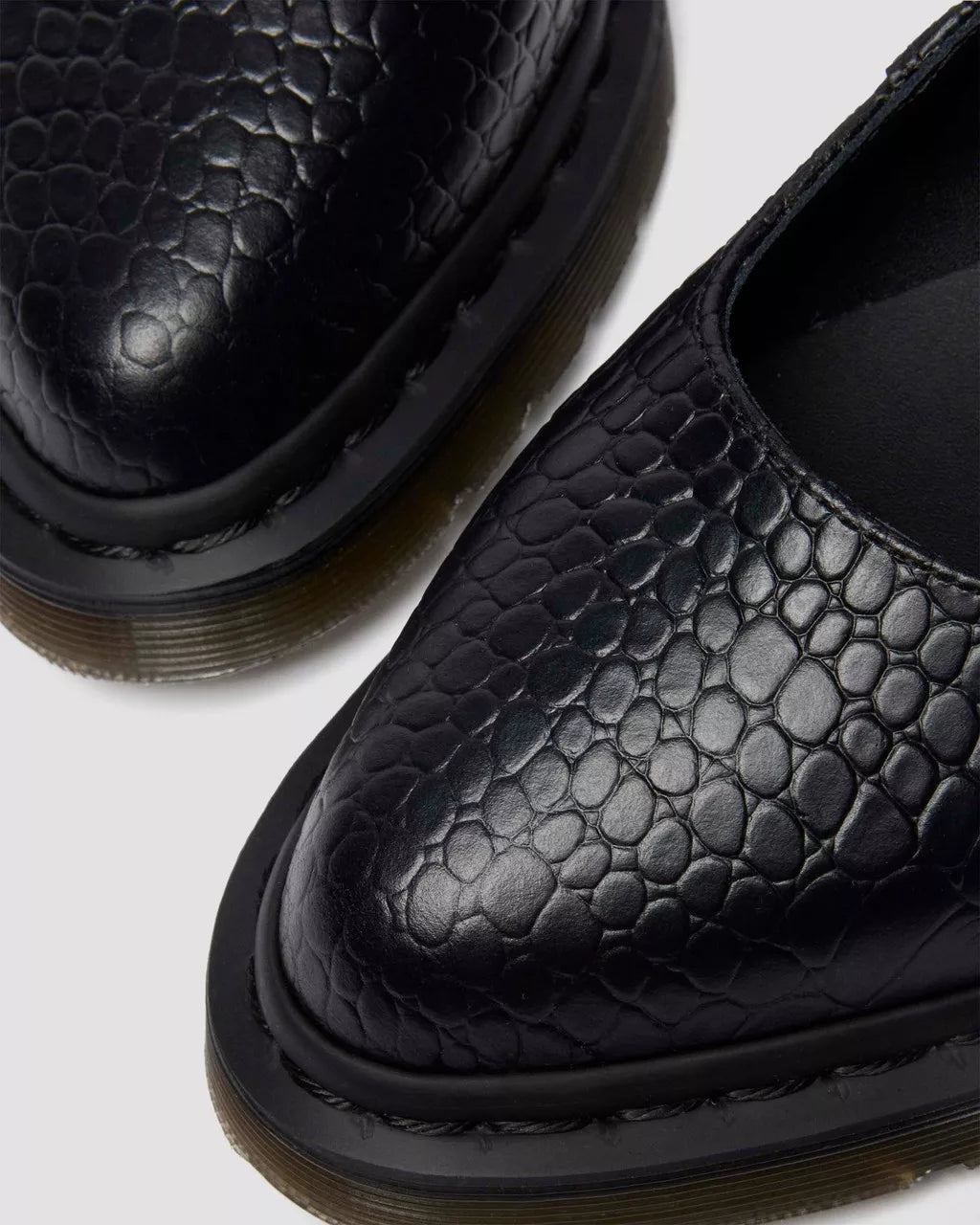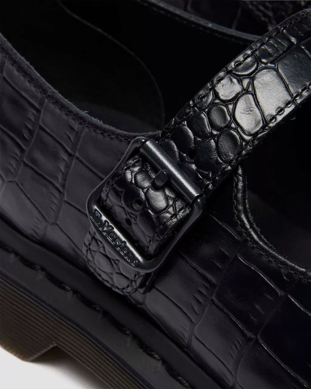 Less dainty. More Doc’s. Buckle up our pointed Elphie Mary Jane shoe — now dressed in statement croc-embossed Atlas leather for monochromatic texture. Fastened with a single strap with an adjustable DM’s branded buckle to lock in your perfect fit. The tapered sole is marked with DM’s signature grooving and secured with tonal black welt stitching.
