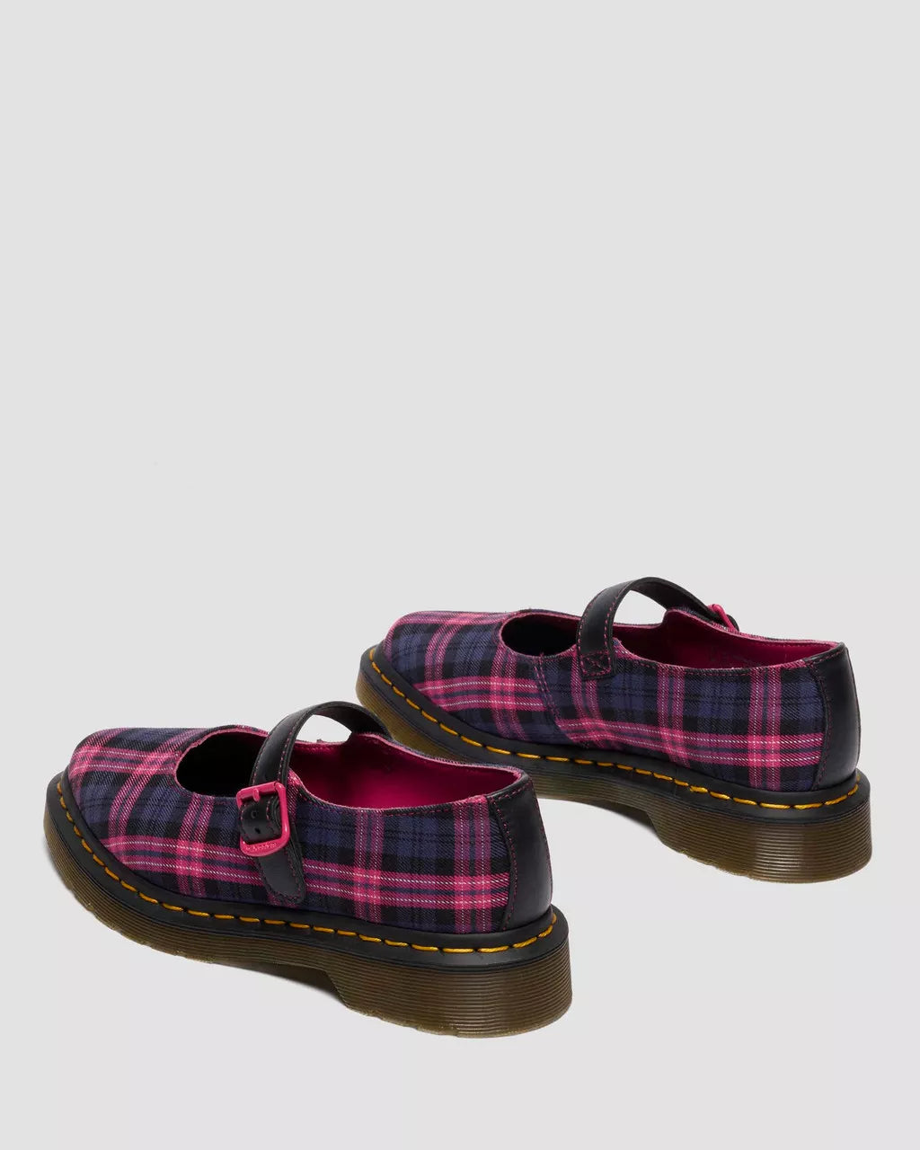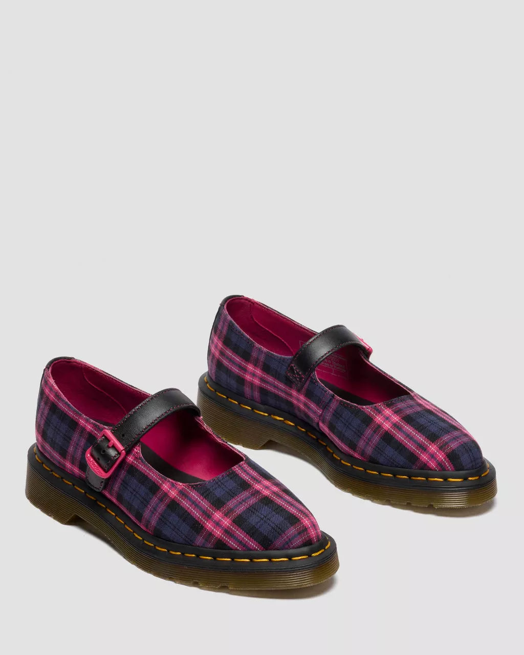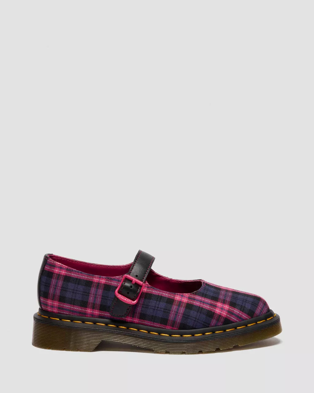 Less dainty. More Doc’s. Buckle up our pointed Elphie Mary Jane shoe — now dressed top to toe in bright pink tartan print. The woven upper is fastened with an adjustable Sendal leather strap with a matching pink buckle. Our tapered sole is marked with DM’s signature grooving, with air-cushioned-comfort locked in with yellow welt stitching.